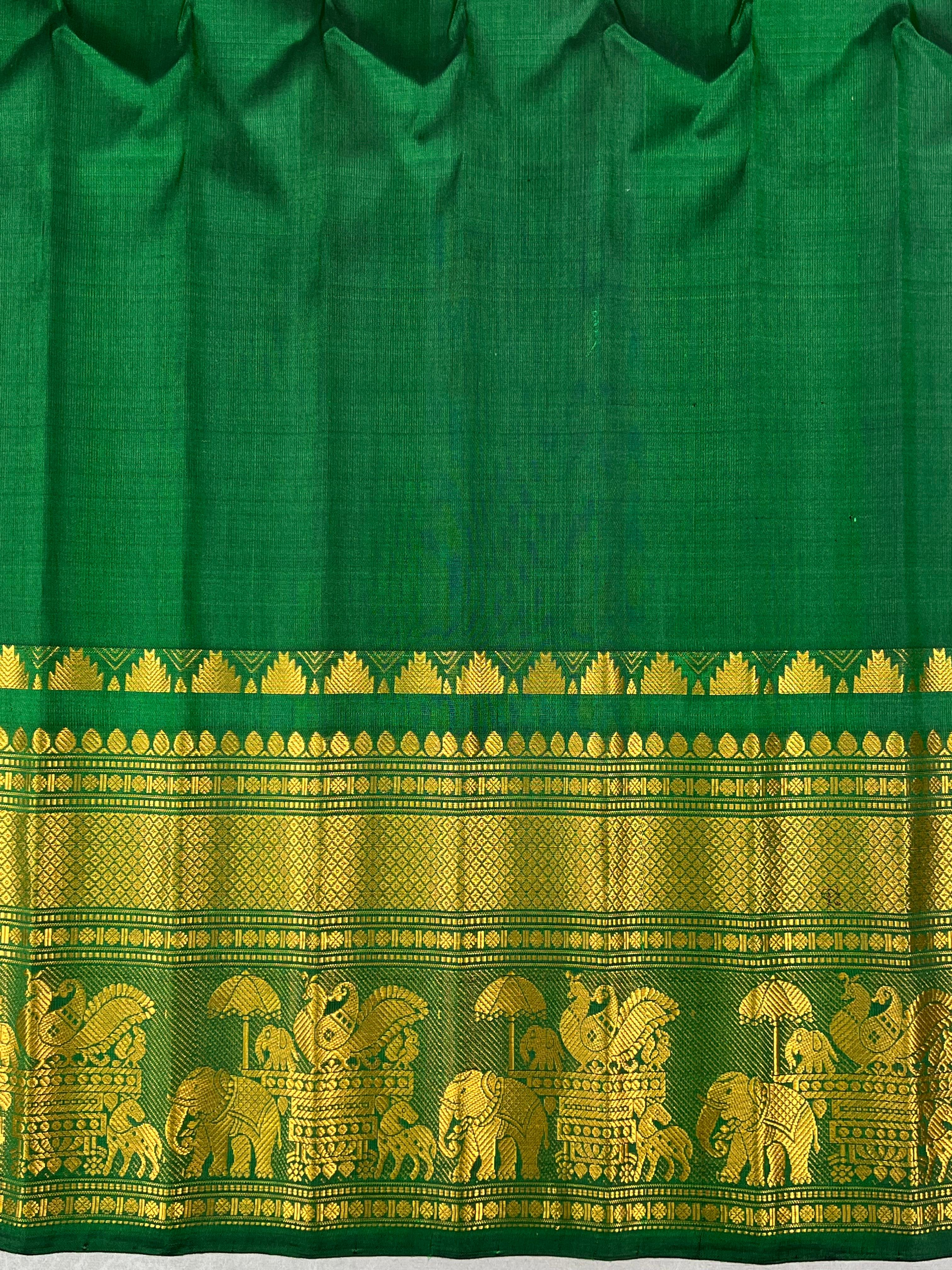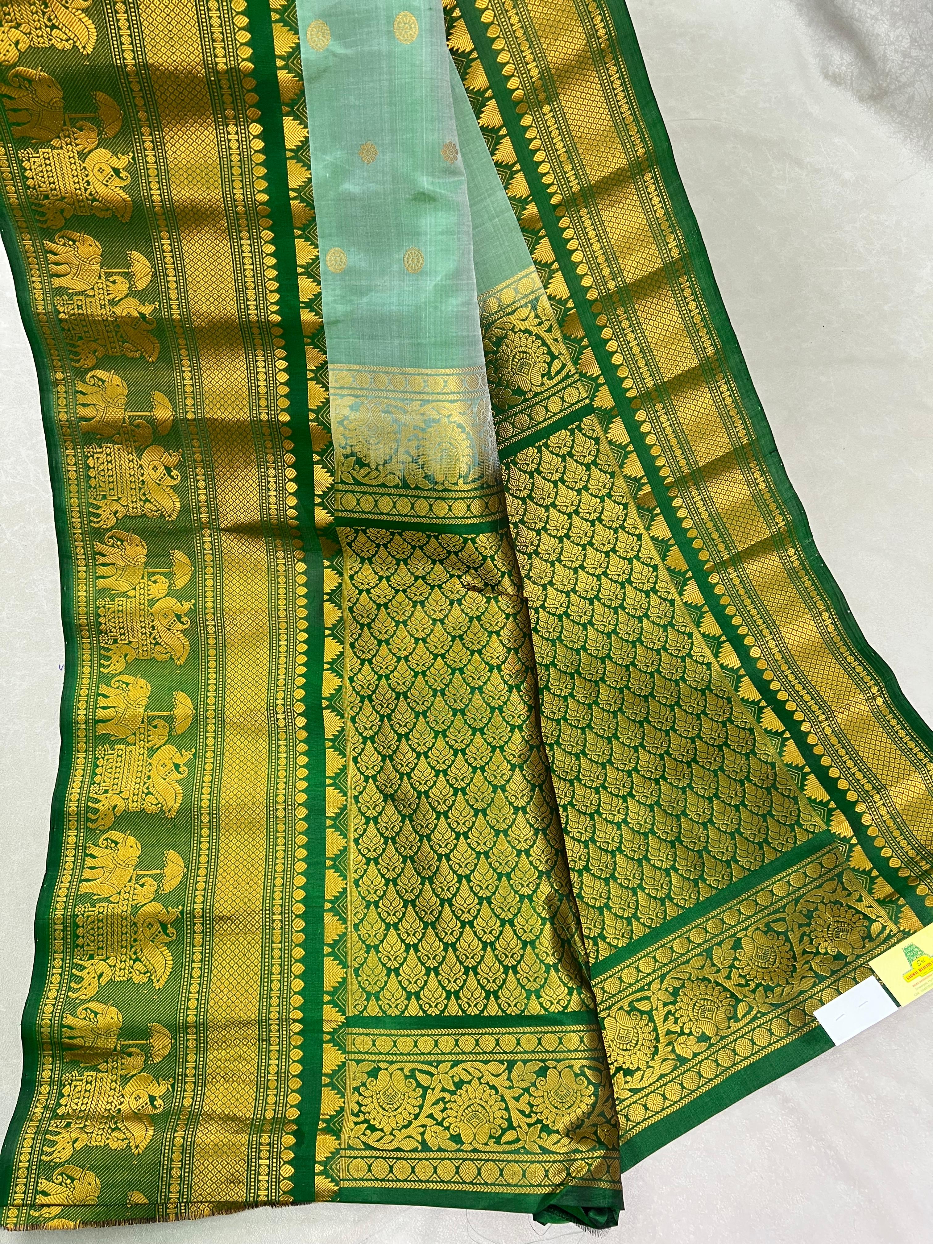 Radiating festive charm, this Gadwal Pure Silk Handloom Saree features a rich pista green body adorned with elegant gold zari buttas. The contrasting soft green border and pallu are intricately woven with floral and geometric zari patterns, adding a touch of regal elegance. A perfect blend of tradition and sophistication, this saree is ideal for weddings, festive occasions, and grand celebrations. Comes with a contrast blouse, making it a perfect choice for festive occasions and grand celebrations!. Silk Mark Certified.