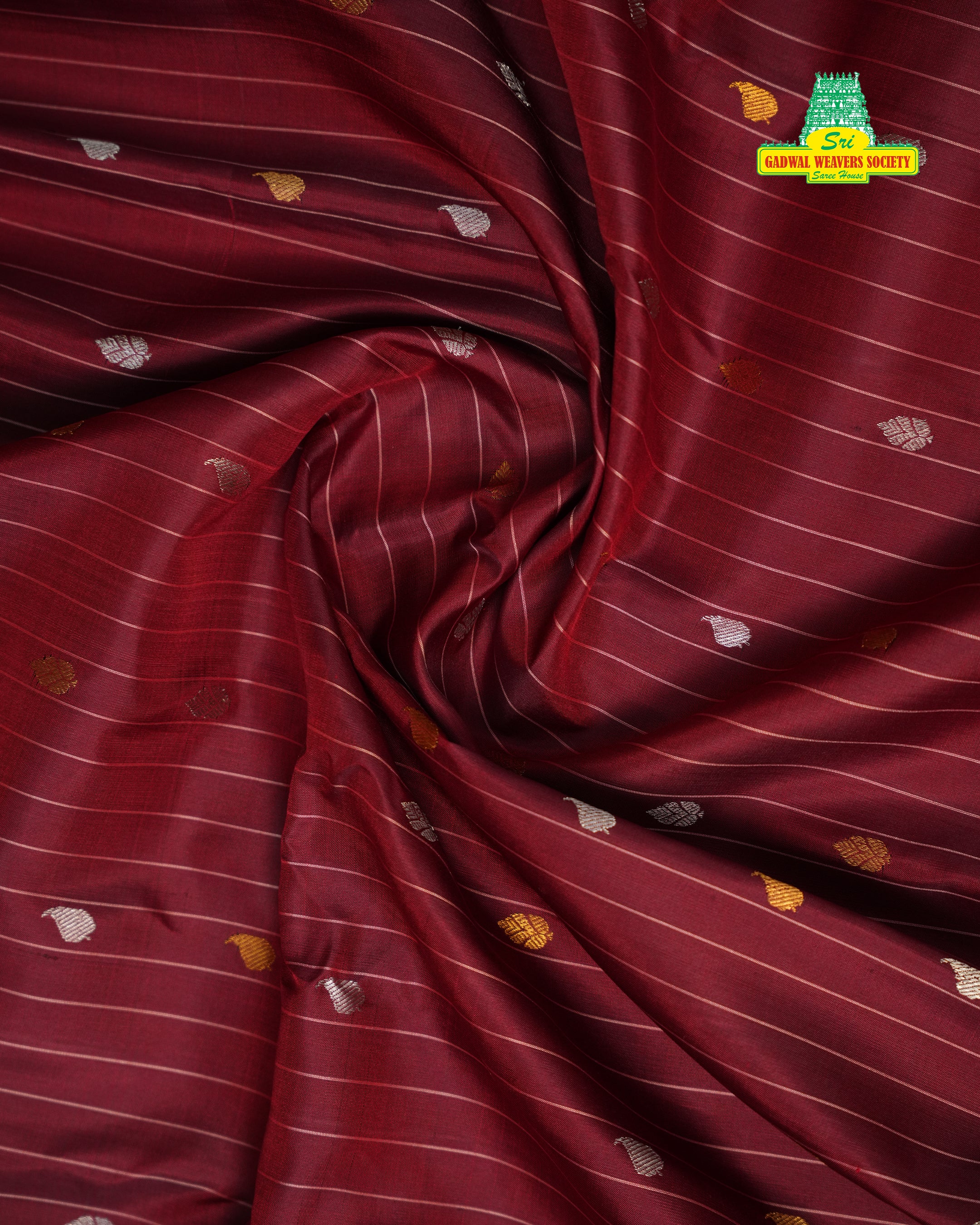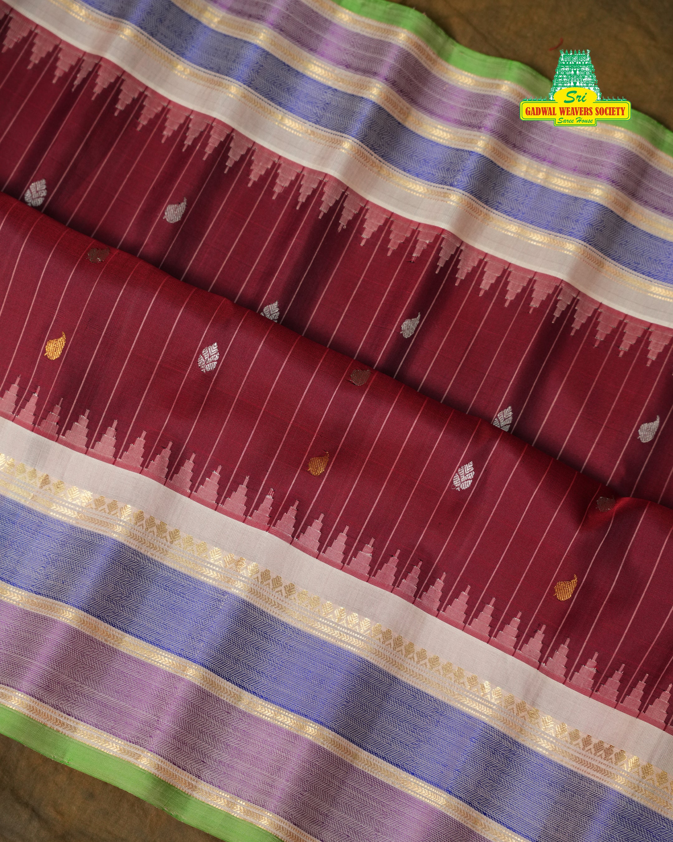 This elegant Gadwal Pure Silk Handloom Saree features a rich kumkum red colour body adorned with fine vertical lines and delicate zari leaf motifs, exuding classic sophistication. The contrasting beige pallu is intricately woven with traditional diamond and floral patterns, while the border in soft lavender and green hues adds a graceful touch. A timeless masterpiece, perfect for festive occasions, weddings, and grand celebrations. Comes with a contrast blouse, making it a perfect choice for festive occasions and grand celebrations!. Silk Mark Certified.