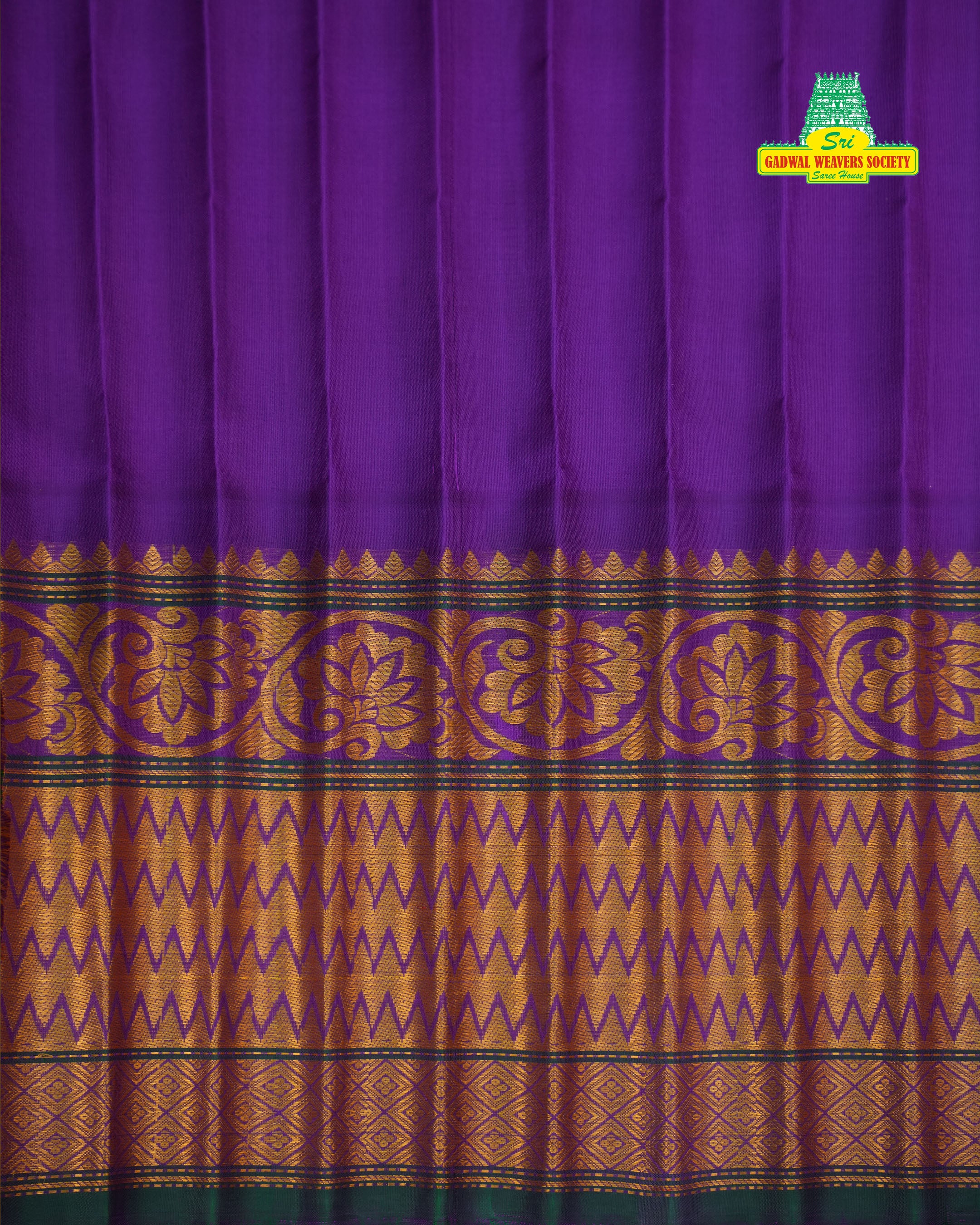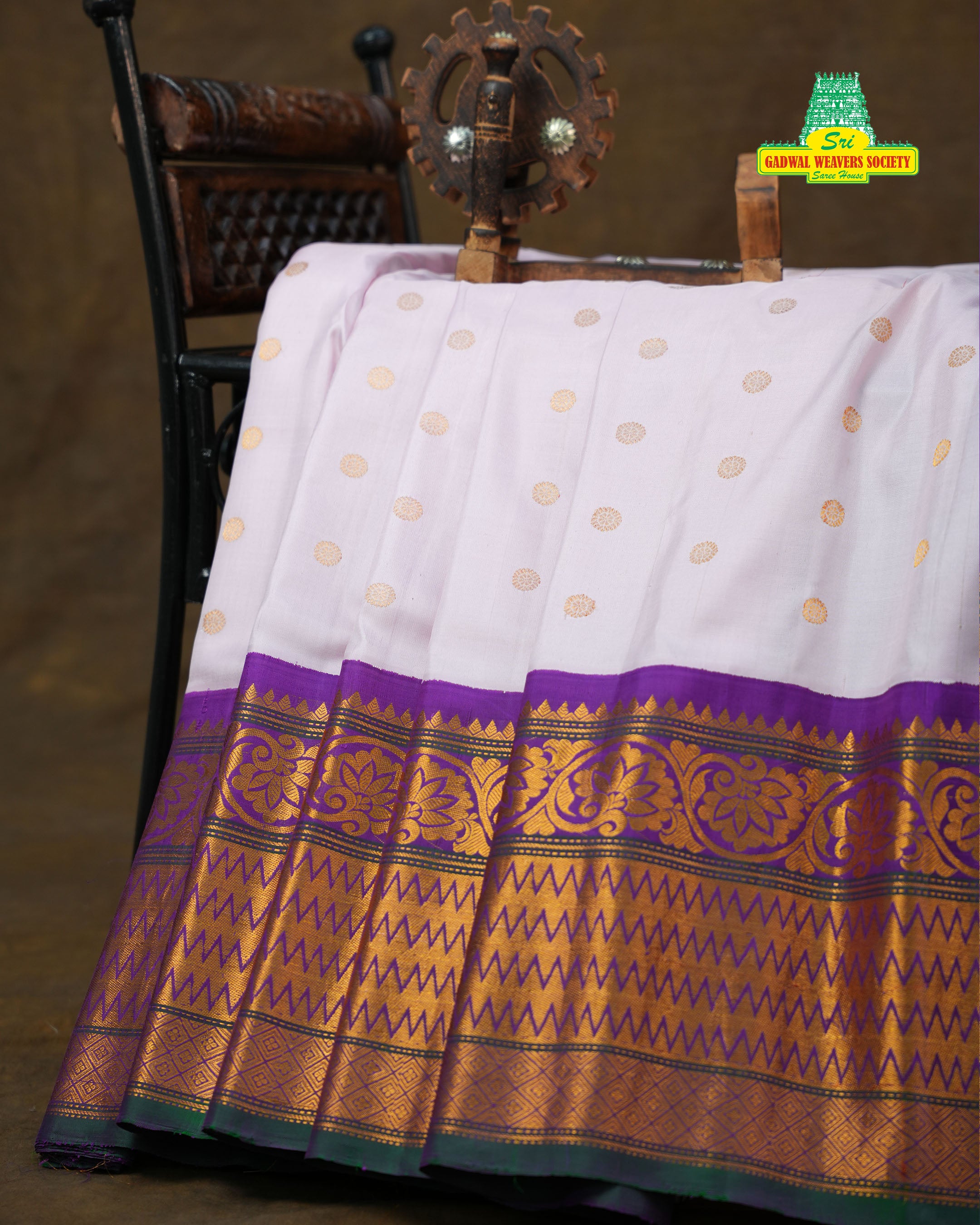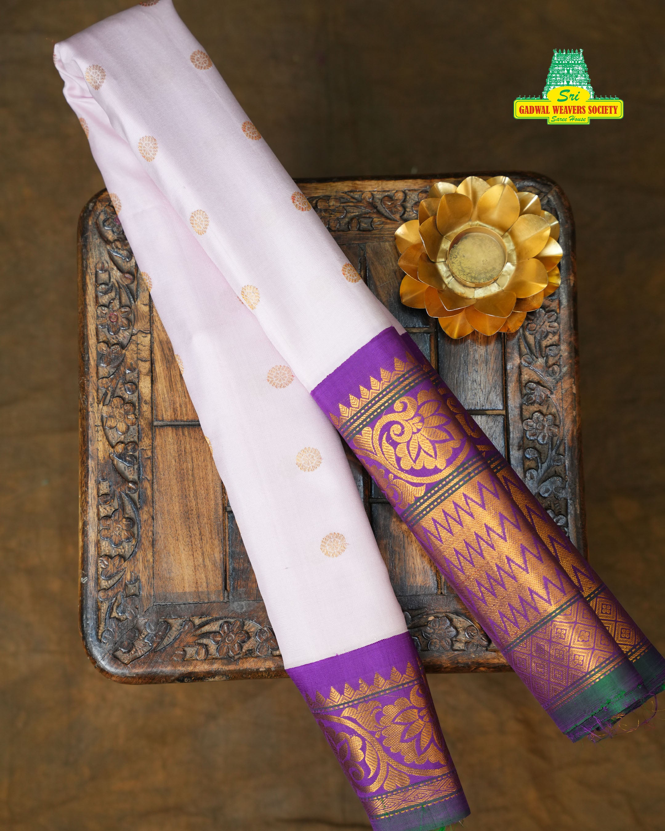 This elegant Gadwal Pure Silk Handloom Saree exudes vintage charm with its timeless Light Onion Pink body adorned with subtle gold buttas. The striking Purple border with gold zari detailing kuttu border following with green selvedge, adds a touch of royal grandeur. Perfect for festive and traditional occasions, this saree beautifully blends heritage craftsmanship with understated sophistication. Pair with contrast blouse, and is Silk Mark certified for authenticity.
