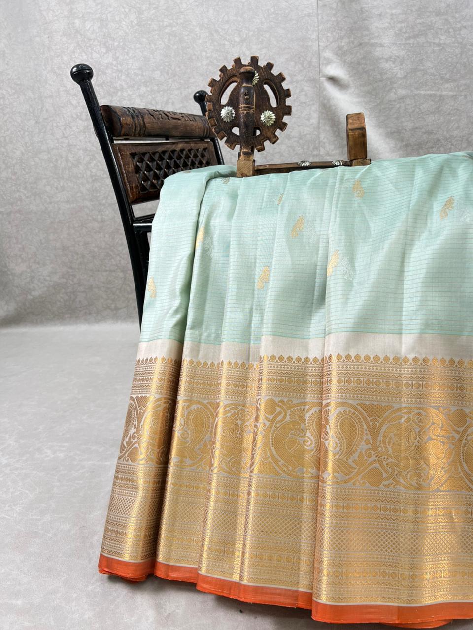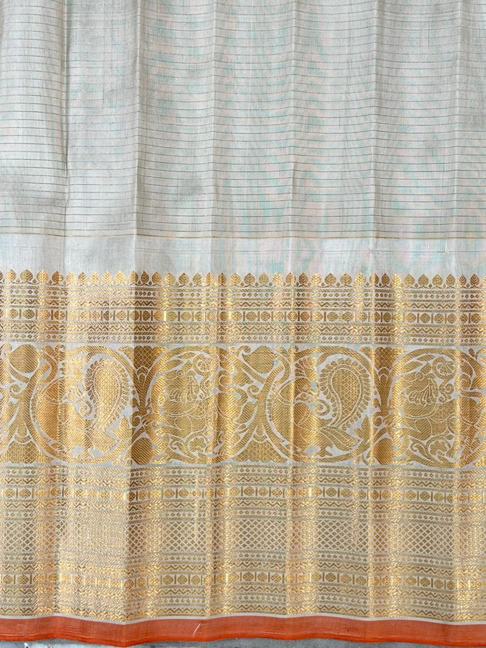 This elegant Gadwal pure silk handloom saree comes in a graceful Very light blue body with delicate gold stripes with gold and silver buttas. The beige border is adorned with intricate gold zari weaving following with Orange selvedge, adding a touch of richness and tradition. A perfect blend of subtle charm and regal elegance, this handloom masterpiece is ideal for festive and special occasions. Comes with contrast blouse, and Silk Mark certified perfect for traditional celebrations.