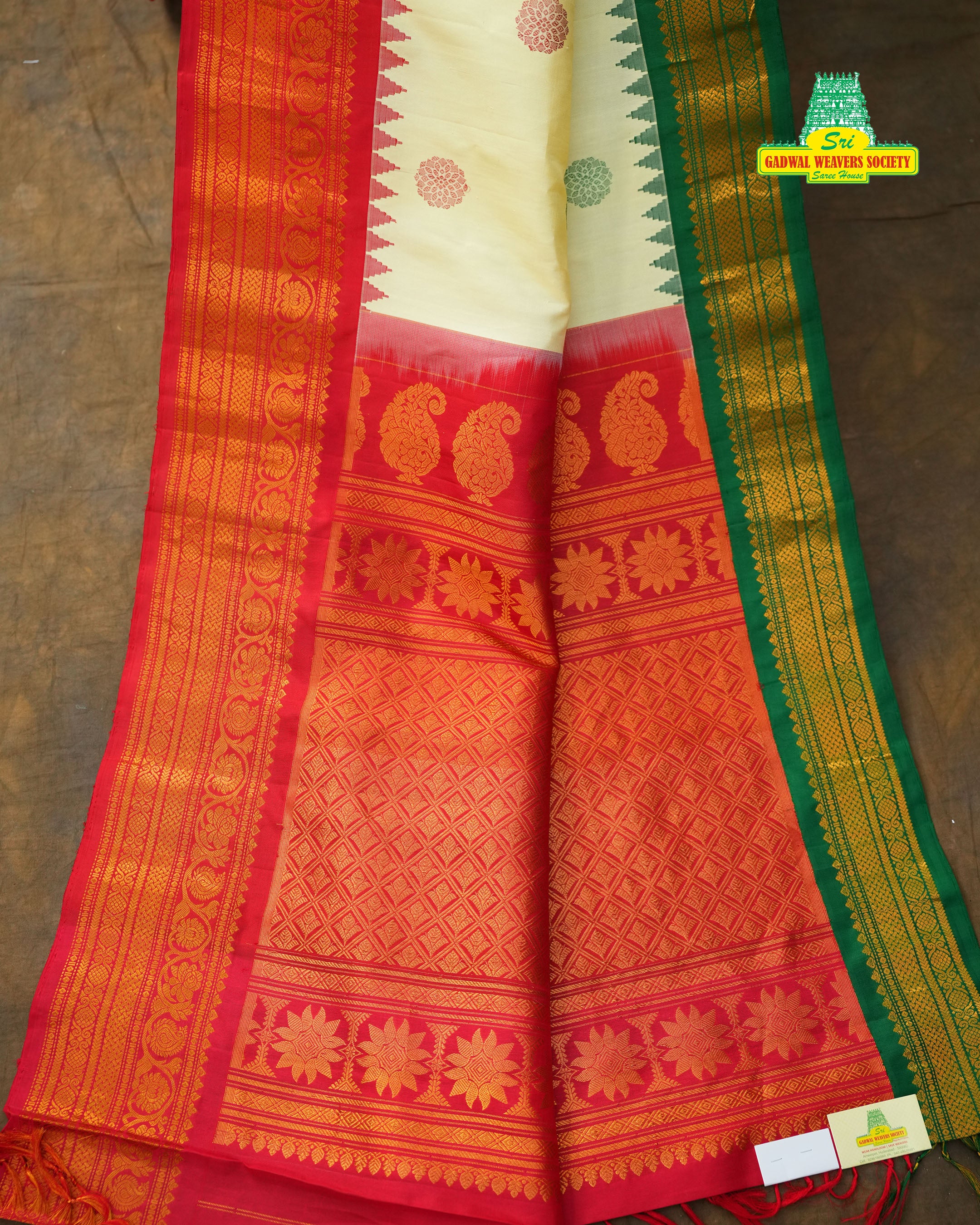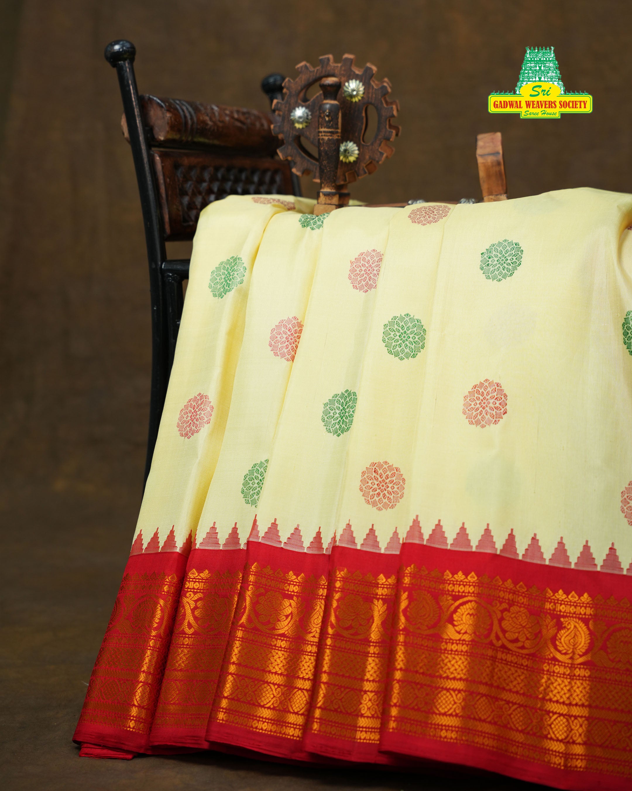 This exquisite Gadwal Pure Silk Handloom Saree showcases timeless elegance with a rich dualshade Butter yellow body, adorned with delicate thread meena buttas spread evenly across the fabric. The highlight of this masterpiece is its stunning Ganga Jamuna border, featuring contrasting Red and Green borders-each embellished with intricate. Woven by skilled artisans, this saree embodies the grace of traditional handloom weaving, perfect for weddings, festivals, and grand occasions. Comes with a contrast blouse, and is Silk Mark certified for authenticity.