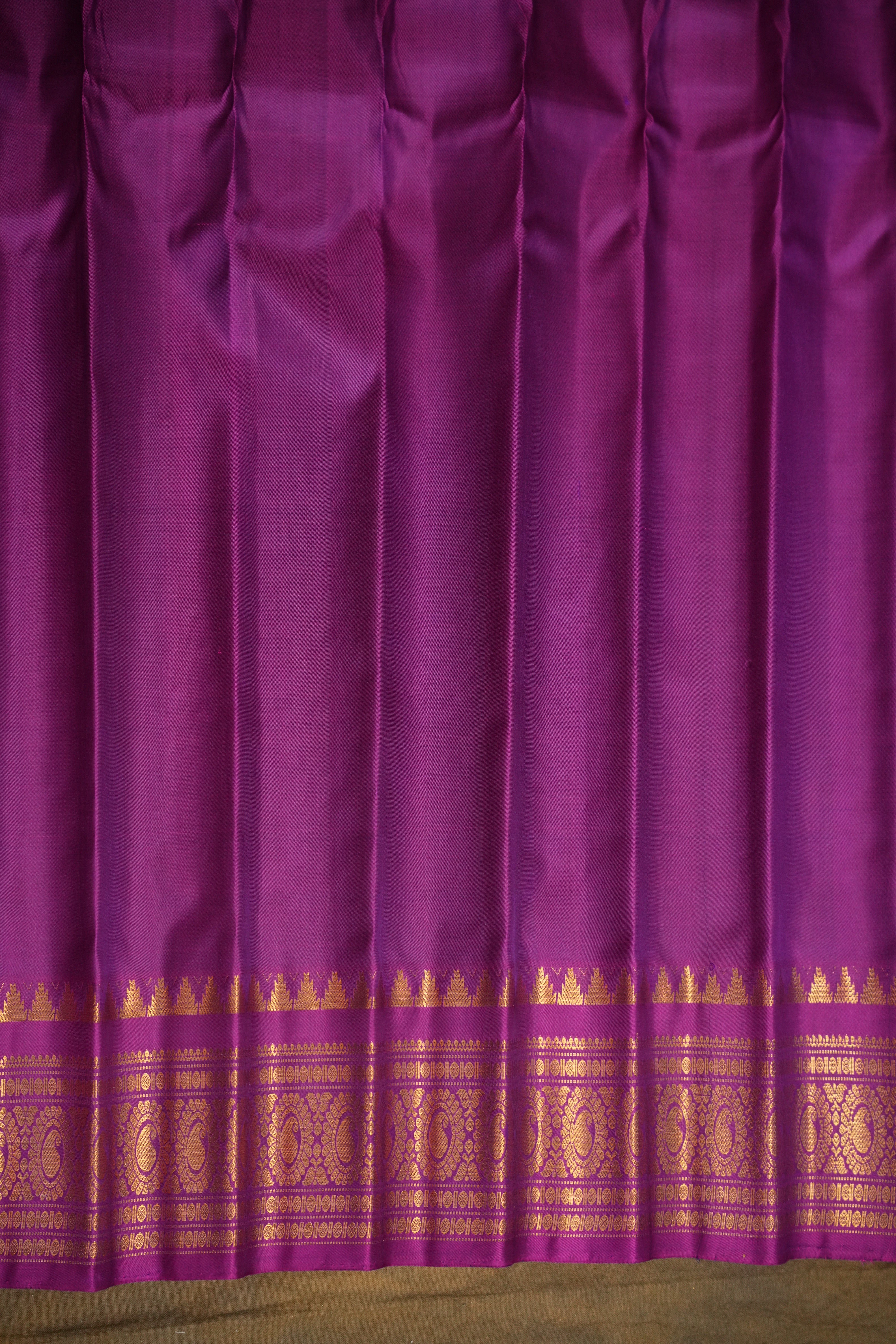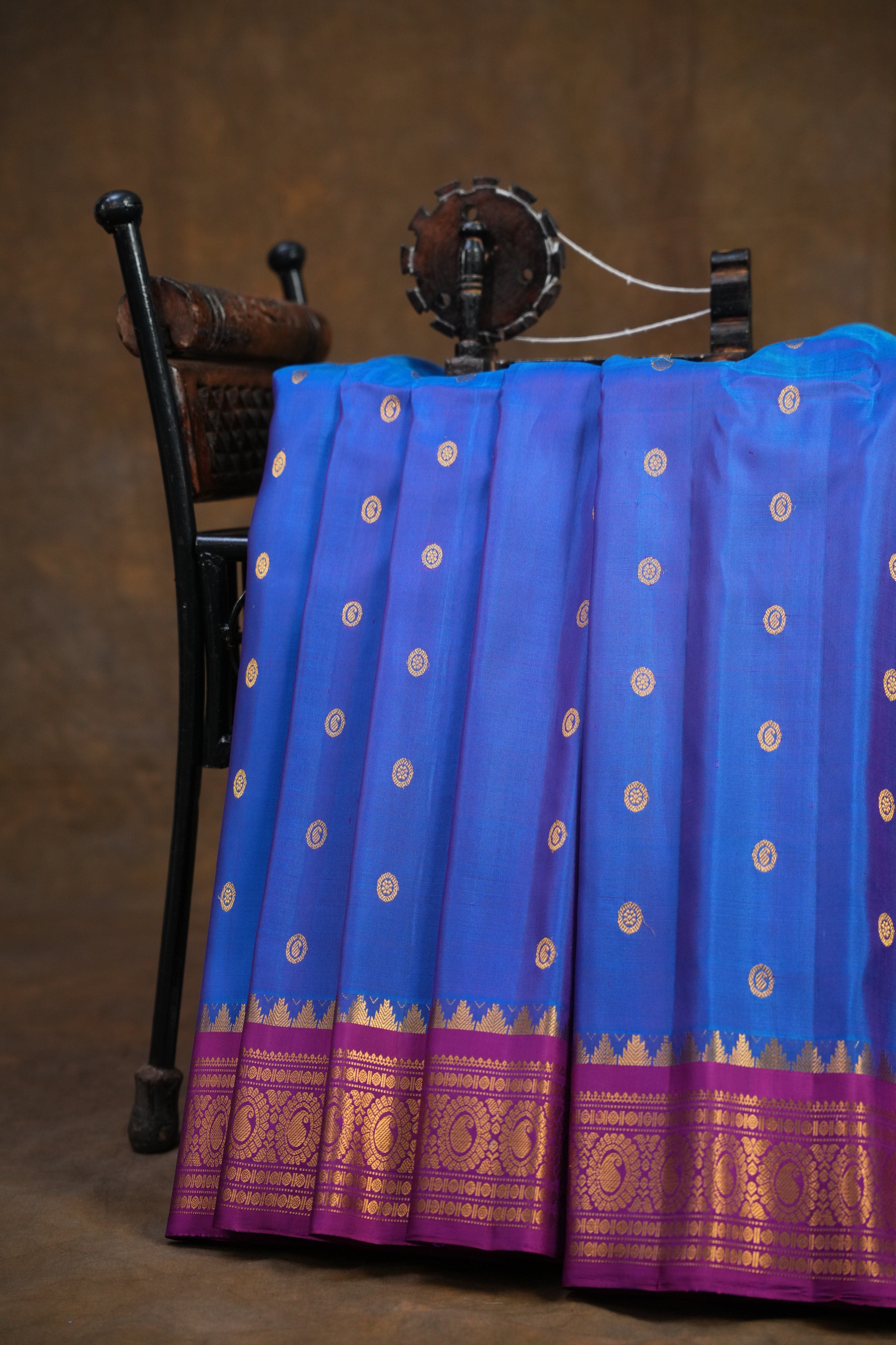 This elegant Gadwal Pure Silk Traditional Small Border Handloom Saree exudes vintage charm with its timeless Blue body adorned with subtle Gold zari buttas. The striking, Wine border, along with the rich gold zari detailing adds a touch of royal grandeur. The saree also features intricate scattered throughout, enhancing its beauty with delicate pops of color. Perfect for festive and traditional occasions, this saree beautifully blends heritage craftsmanship with understated sophistication. Pair with a contrast blouse, and rest assured, it is Silk Mark certified for authenticity.