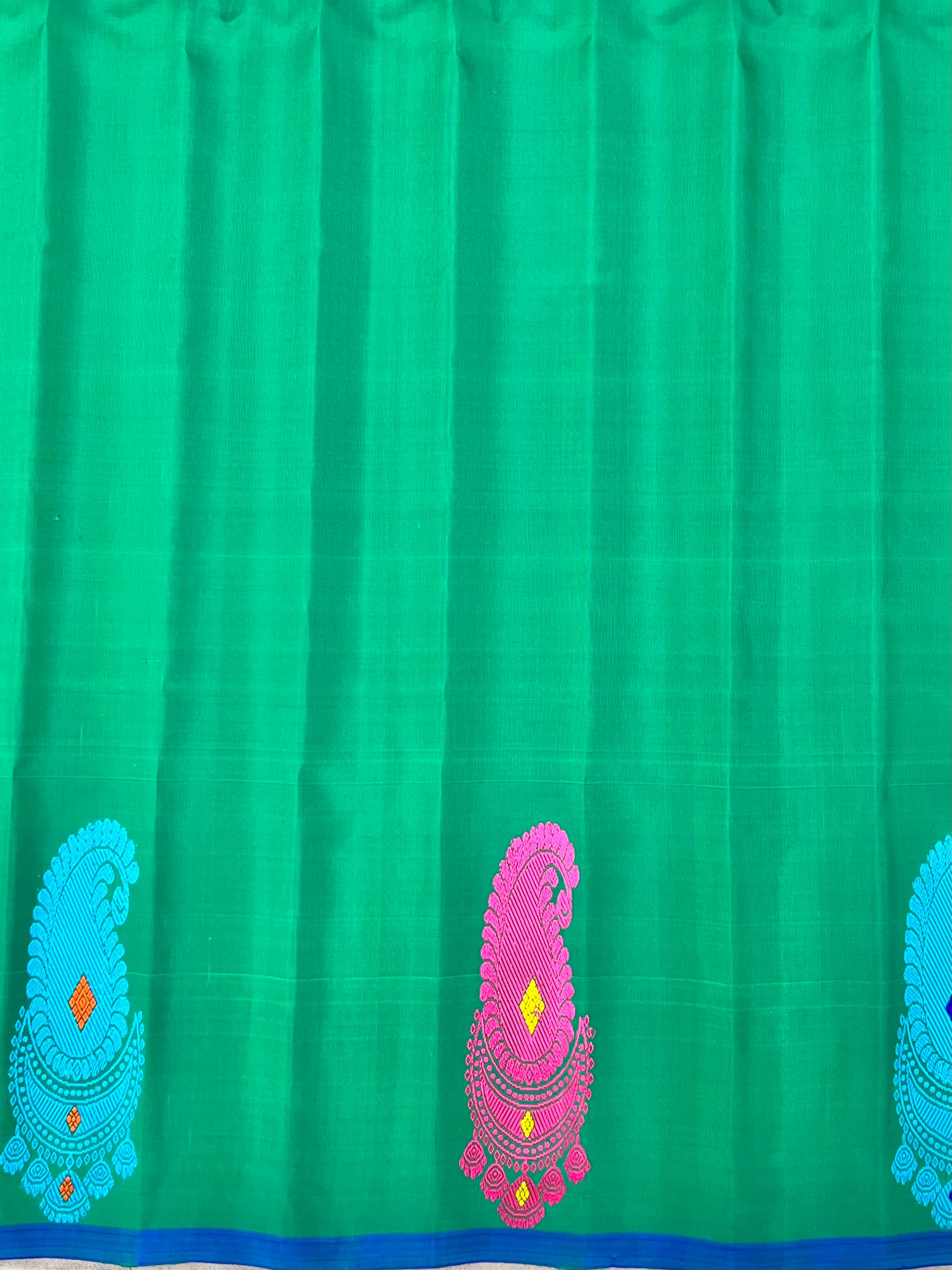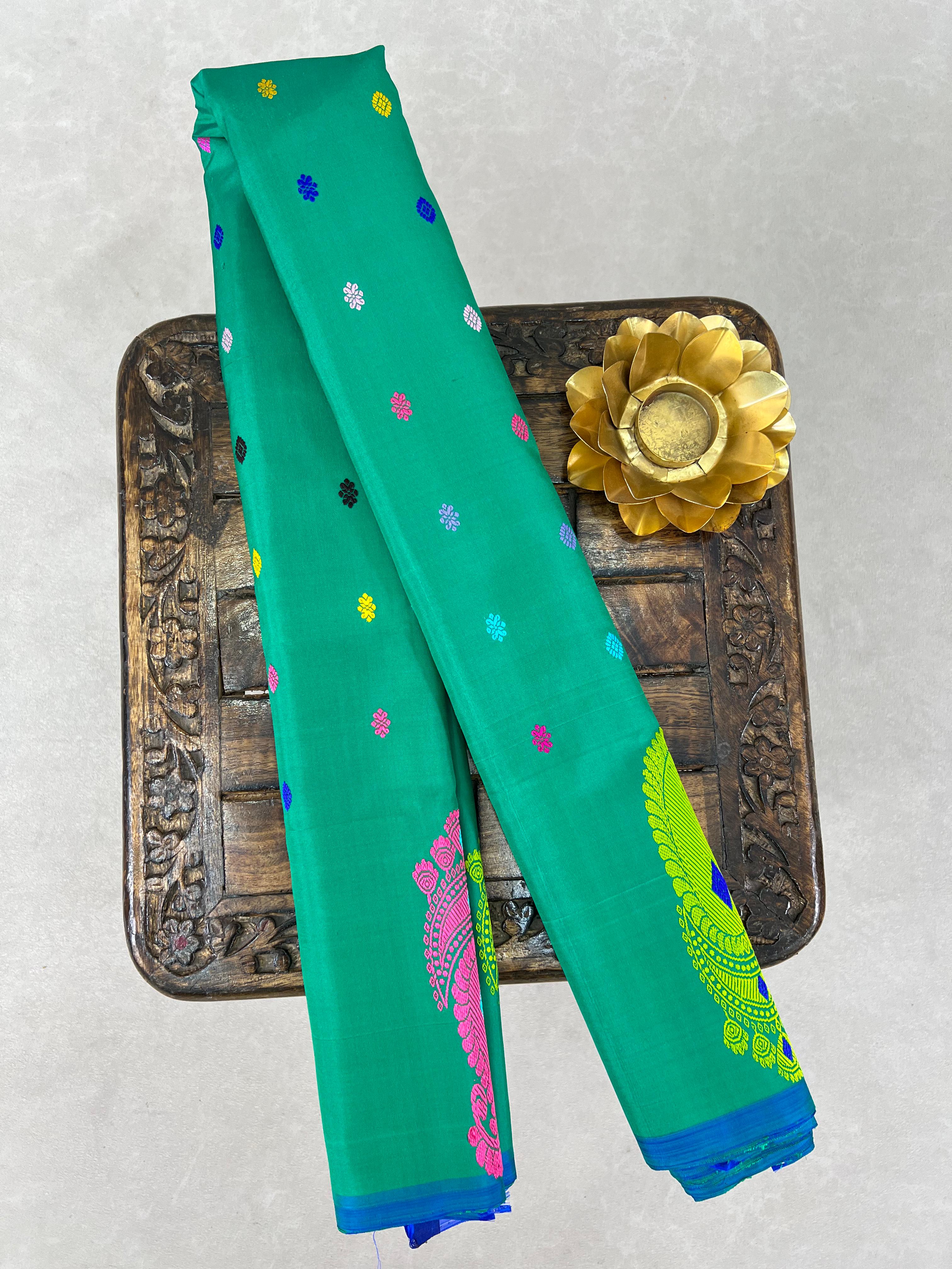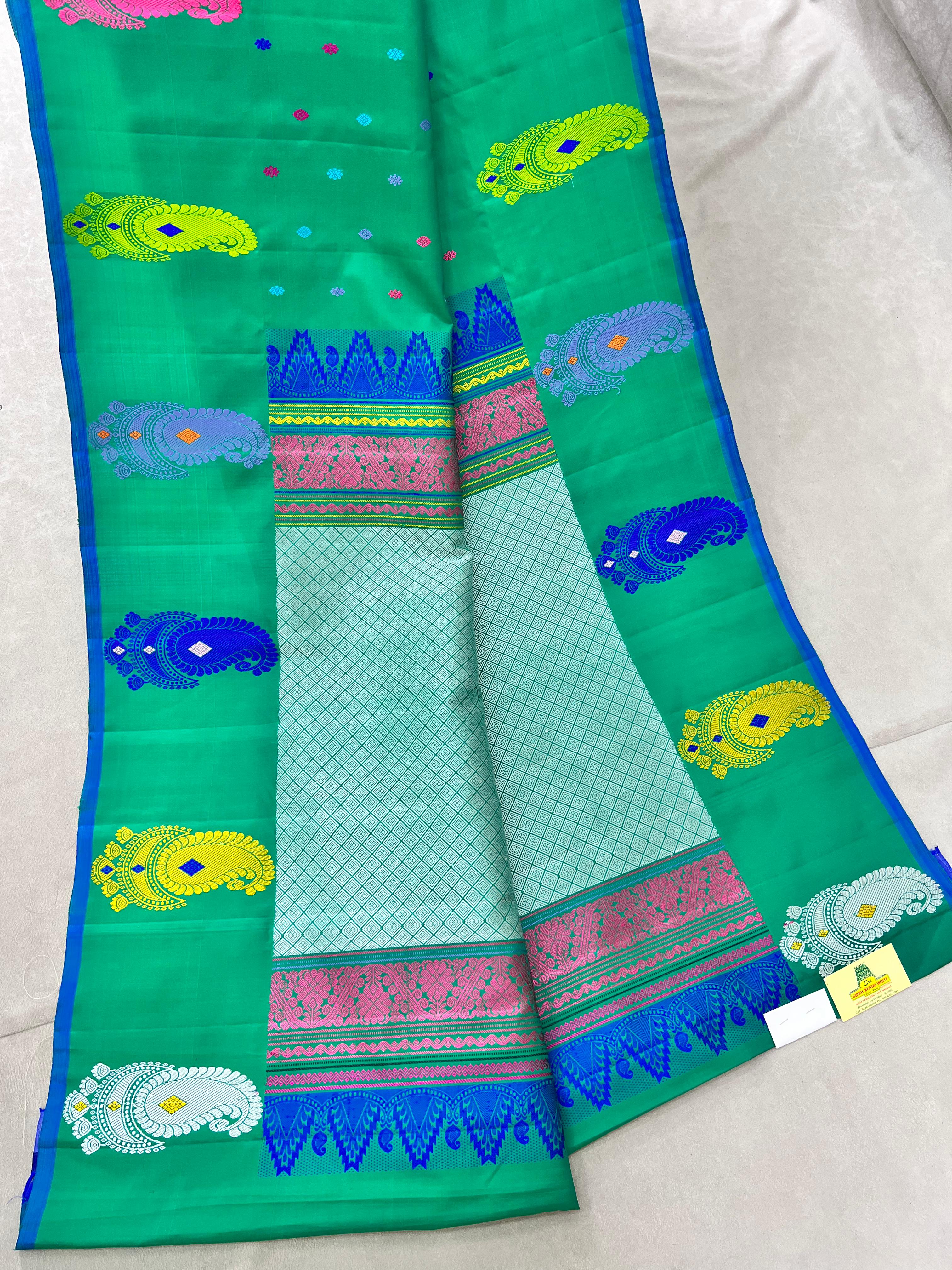 This Gadwal Pure Silk Handloom Saree features elegant green with delicate multicolour thread buttas, beautifully complemented by a striking self colour border adorned with thread meena motifs and light blue selvedge. The rich woven pallu with intricate multicolour thread designs adds grandeur, making it a perfect blend of tradition and luxury. Comes with self blouse and Silk Mark certified — perfect for traditional celebrations.