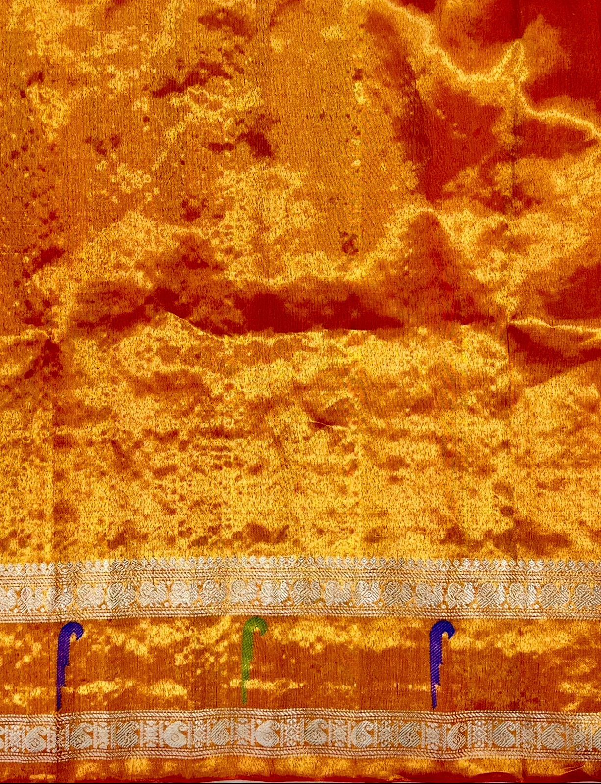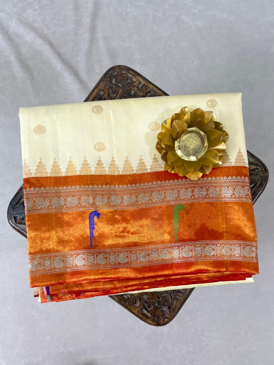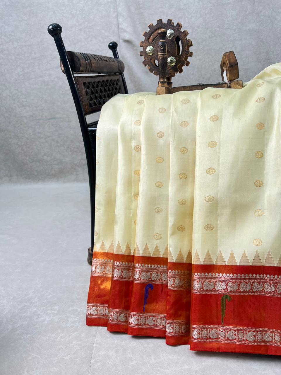 This stunning Gadwal Pure Silk Tissue Border Handloom Saree exudes traditional elegance and timeless charm. Woven in radiant shades of Cream body with gold zari buttas detailing, the Gold tissue gap border features classic Muniya motifs and silver zari detailing, showcasing the craftsmanship of skilled artisans. Perfect for festive occasions, weddings, or cultural celebrations, this saree is a true testament to heritage weaving and refined style. comes with contrast blouse and Silk Mark Certified.