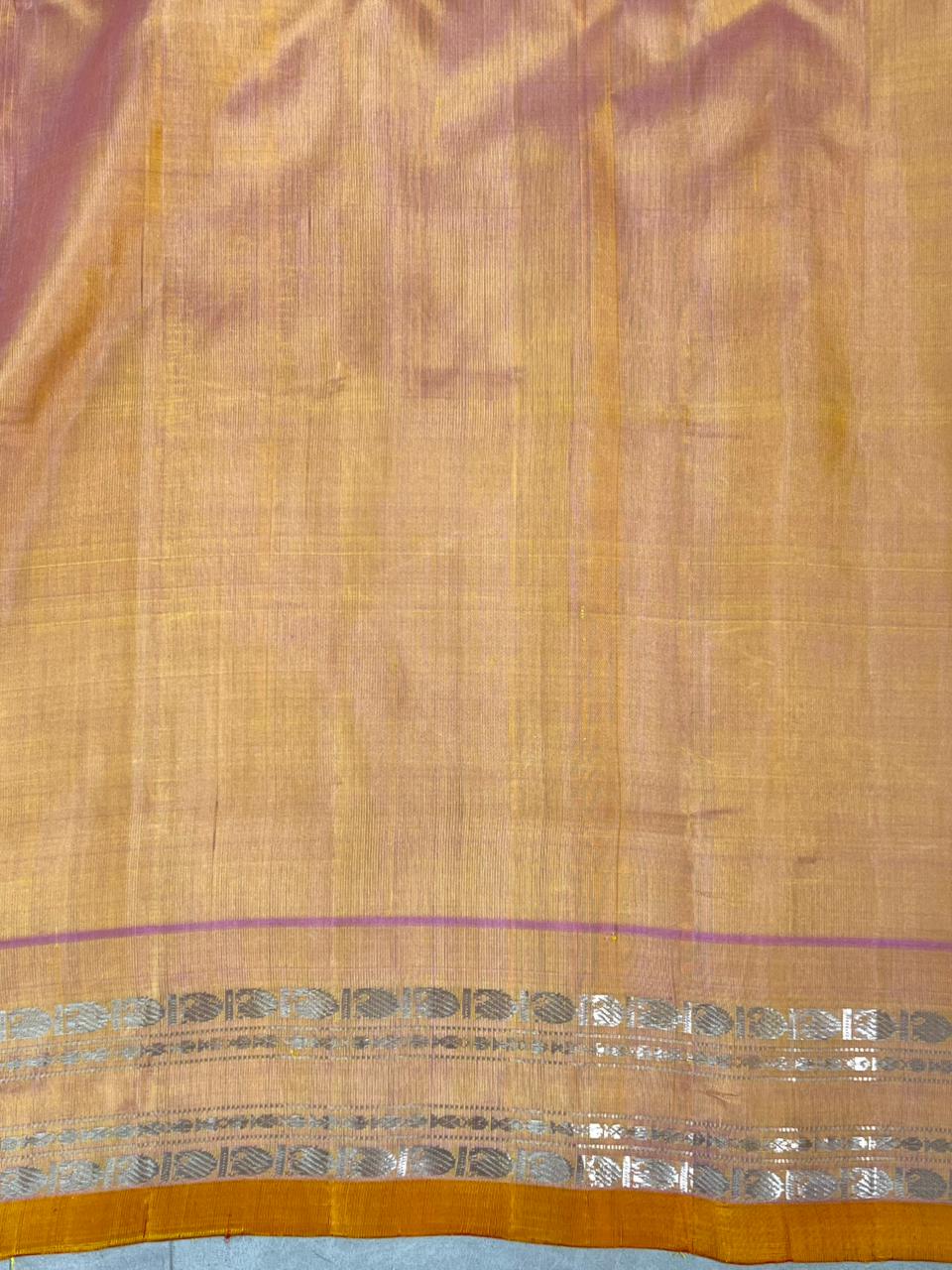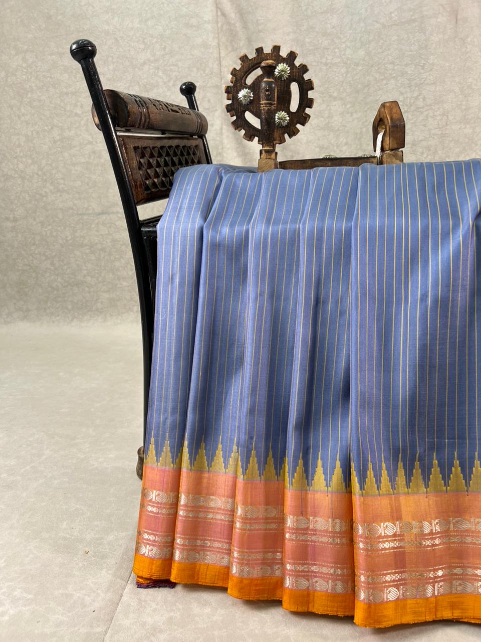 This elegant Gadwal  Pure Silk Handloom Saree features a stunning bright Steel blue body with subtle Golden zari stripes that give it a refined shimmer. The rich Peach gap border with a green selvedge is beautifully woven with silver zari detailing and temple motifs, adding a classic Gadwal touch. Lightweight, luxurious, and graceful, it’s perfect for festive occasions, weddings, and traditional celebrations. This saree comes with a contrast blouse and is Silk Mark certified.