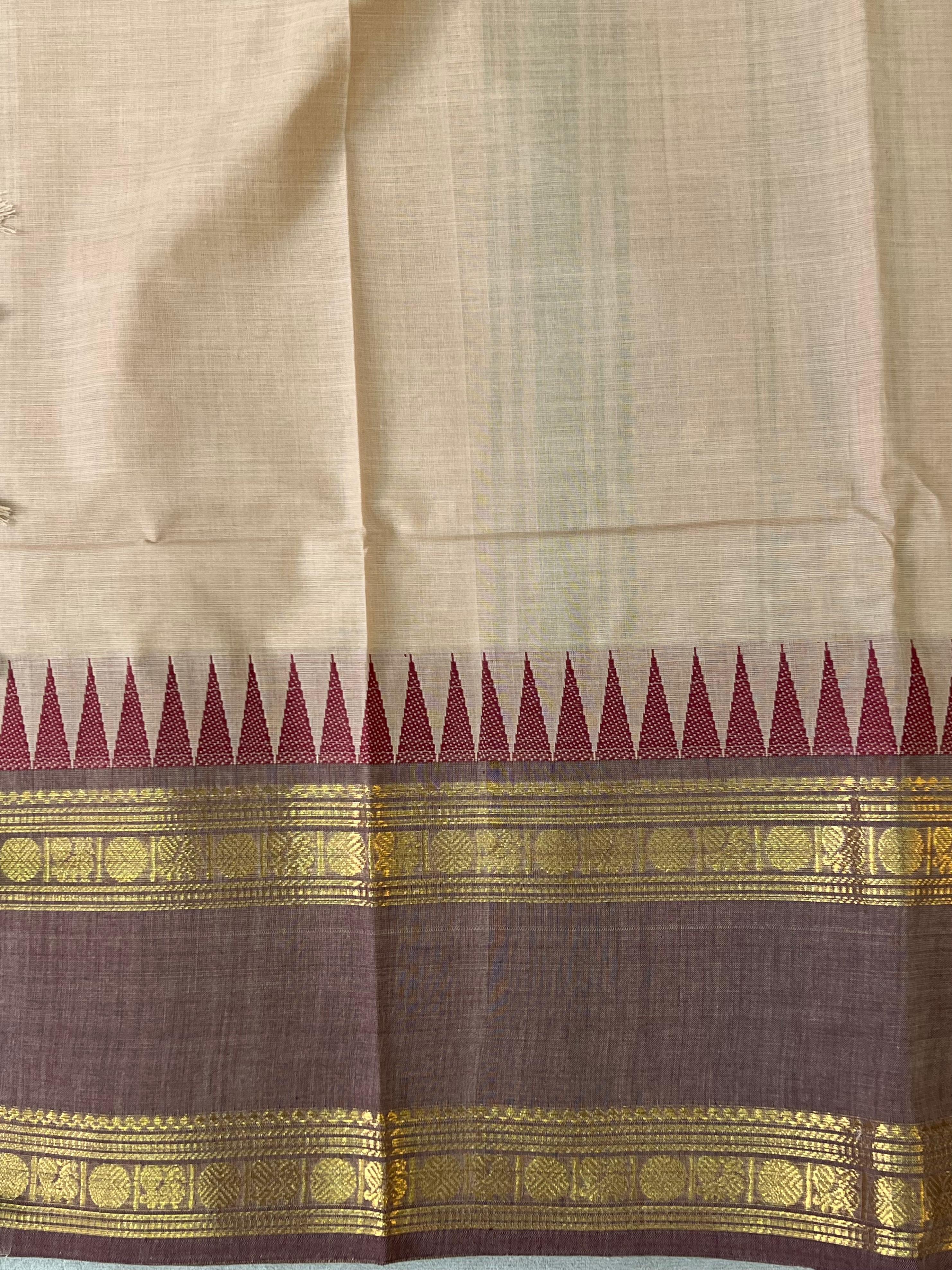 This Kanchi Cotton Ganga jamuna handloom Saree features a soft, handwoven Cream shade color body adorned with elegant gold buttas and a finely crafted contrast ganga jamuna gap border with gold zari deatailing. Lightweight, breathable, and rich in tradition, it’s the perfect choice for daily wear, temple visits, or simple festive occasions. A timeless blend of comfort and classic charm. This saree comes with Self blouse.