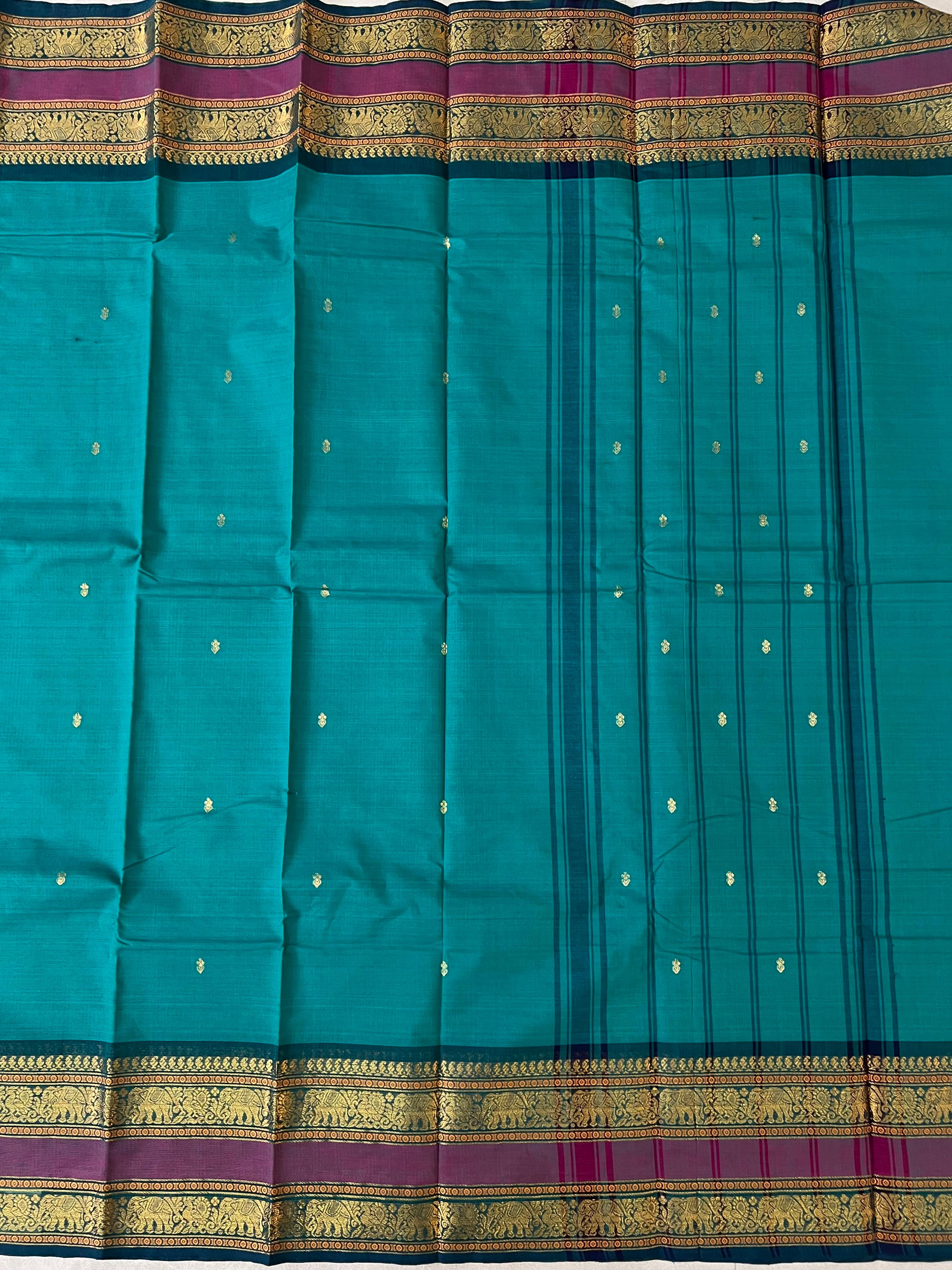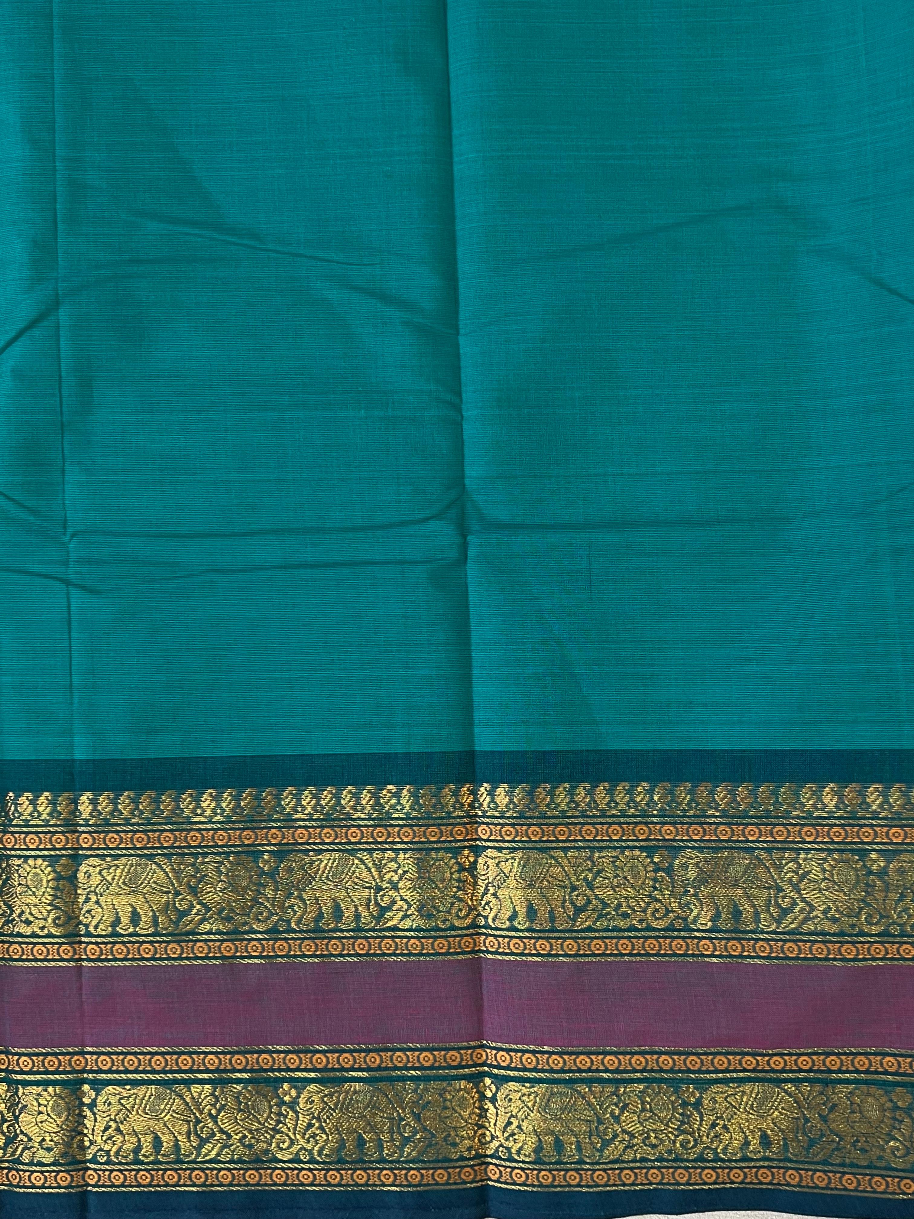 This Kanchi Cotton handloom Saree features a soft, handwoven Sea green color body adorned with elegant gold buttas and a finely crafted contrast Pink Gap border with gold zari deatailing. Lightweight, breathable, and rich in tradition, it’s the perfect choice for daily wear, temple visits, or simple festive occasions. A timeless blend of comfort and classic charm. This saree comes with Self blouse.