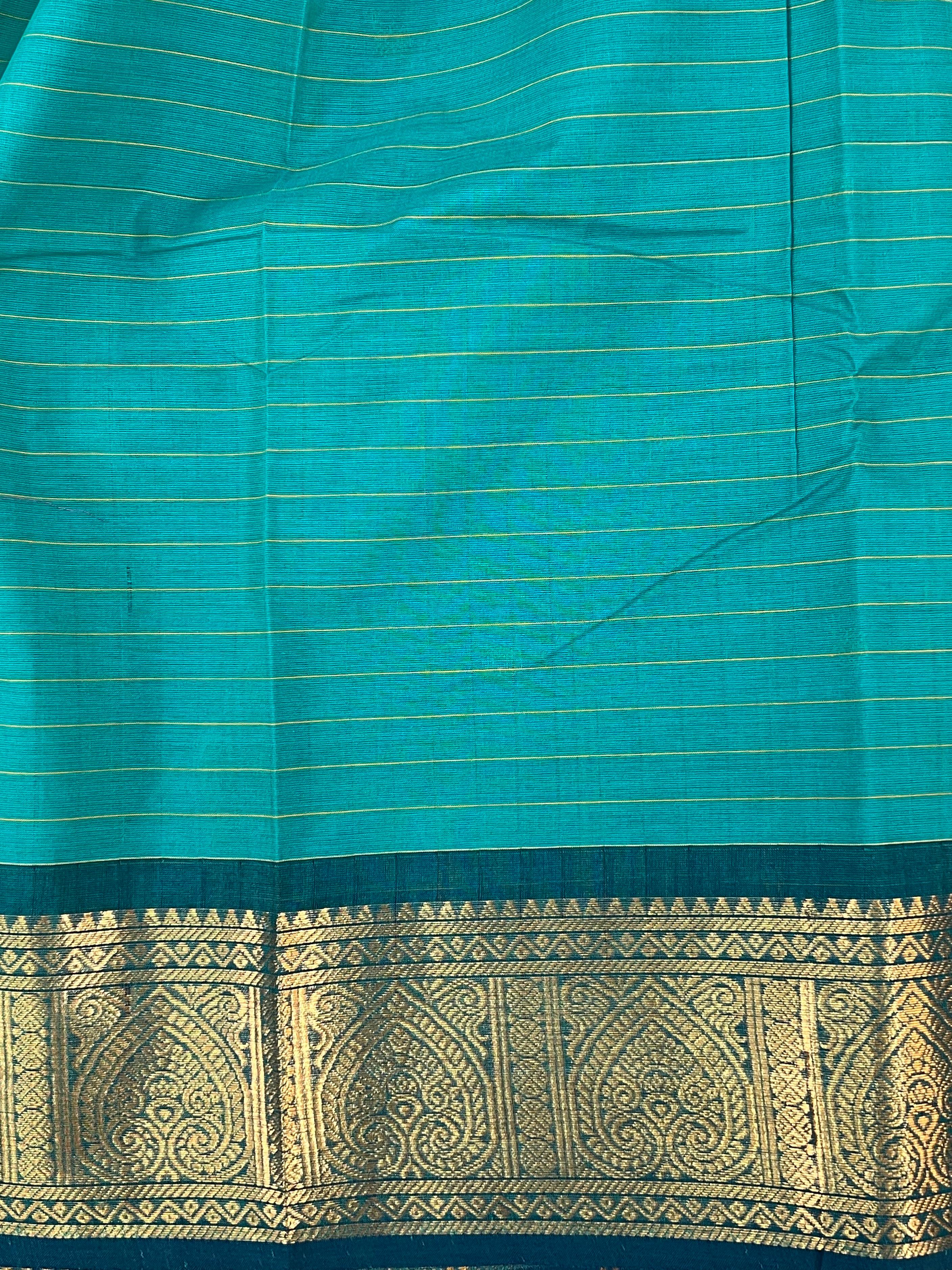 This Kanchi Cotton handloom Saree features a soft, handwoven Rama green body adorned with elegant Thread checks with buttas and a finely crafted contrast Dark green border with gold zari deatailing. Lightweight, breathable, and rich in tradition, it’s the perfect choice for daily wear, temple visits, or simple festive occasions. A timeless blend of comfort and classic charm. This saree comes with Self blouse.