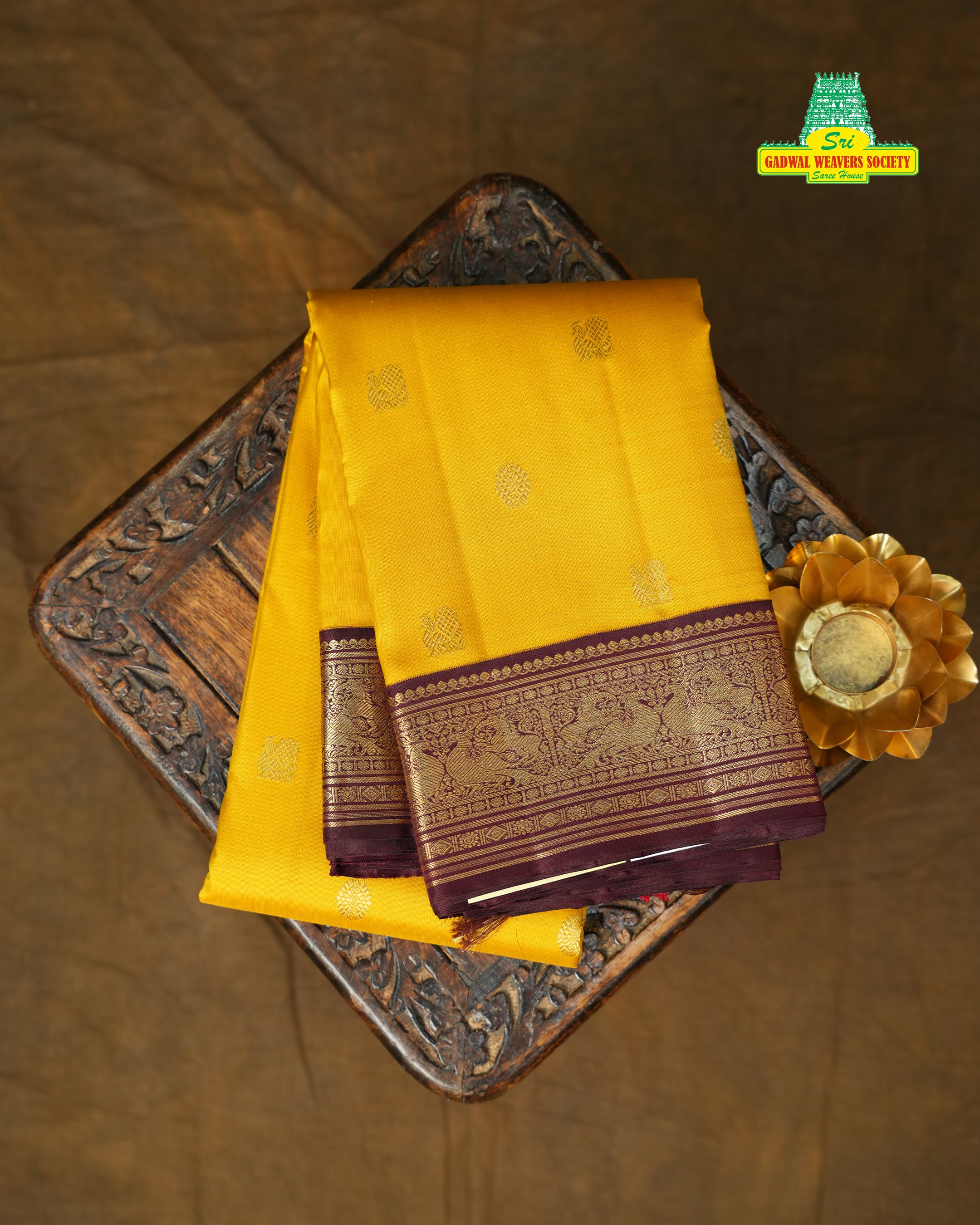 This exquisite Kanchipuram Kuttu Border Pure Silk Handloom Saree beautifully reflects the timeless grandeur of traditional South Indian weaving. The saree features a Yellow body, giving it a classic and regal appearance suitable for festive and special occasions. The body is adorned with elegant golden zari buttas, adding a refined touch of shimmer and traditional artistry. Enhancing its opulence, the saree is finished with a Chocolate brown border intricately woven with Gold zari detailing, this saree ensures a graceful drape and a sophisticated look. This saree comes with contrast blouse, and it is silk mark certified.