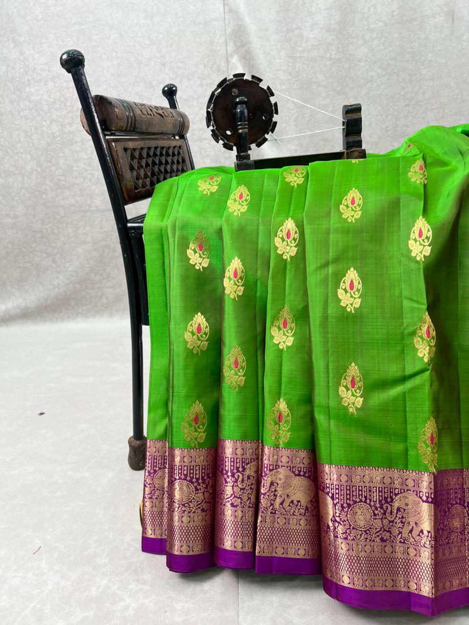 This elegant Kanchipuram Pure Silk Handloom Saree features a radiant Parrot green body with delicate golden zari meenakari buttas, paired with a striking contrast magenta border enriched with intricate golden zari detailing. The rich traditional weaving and lustrous silk texture make it a perfect choice for weddings and festive occasions. Comes with contrast blouse and is Silk Mark Certified.