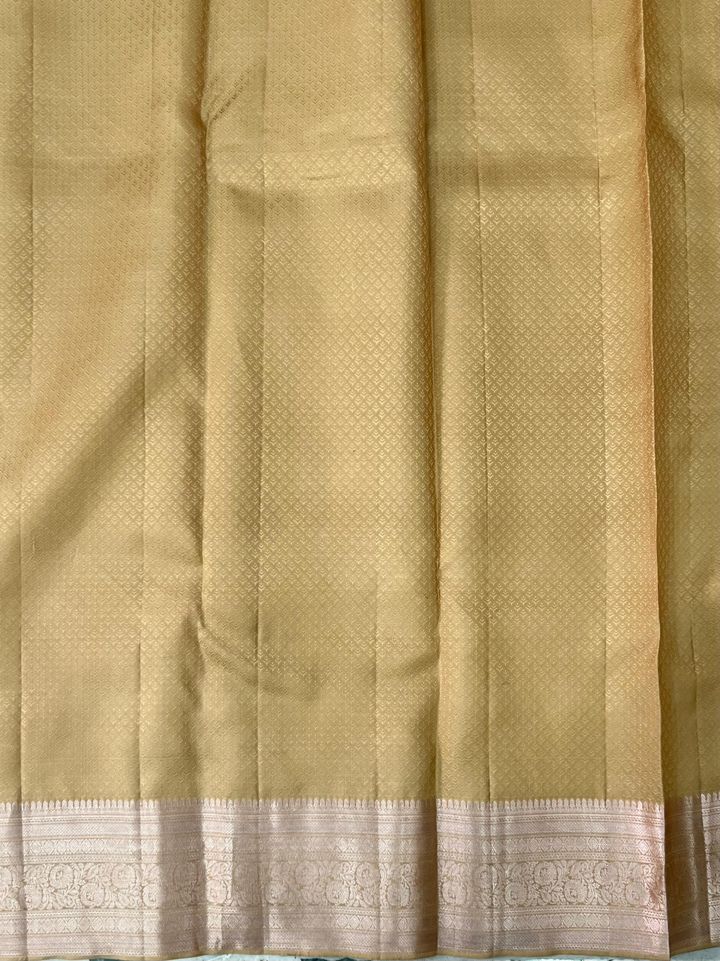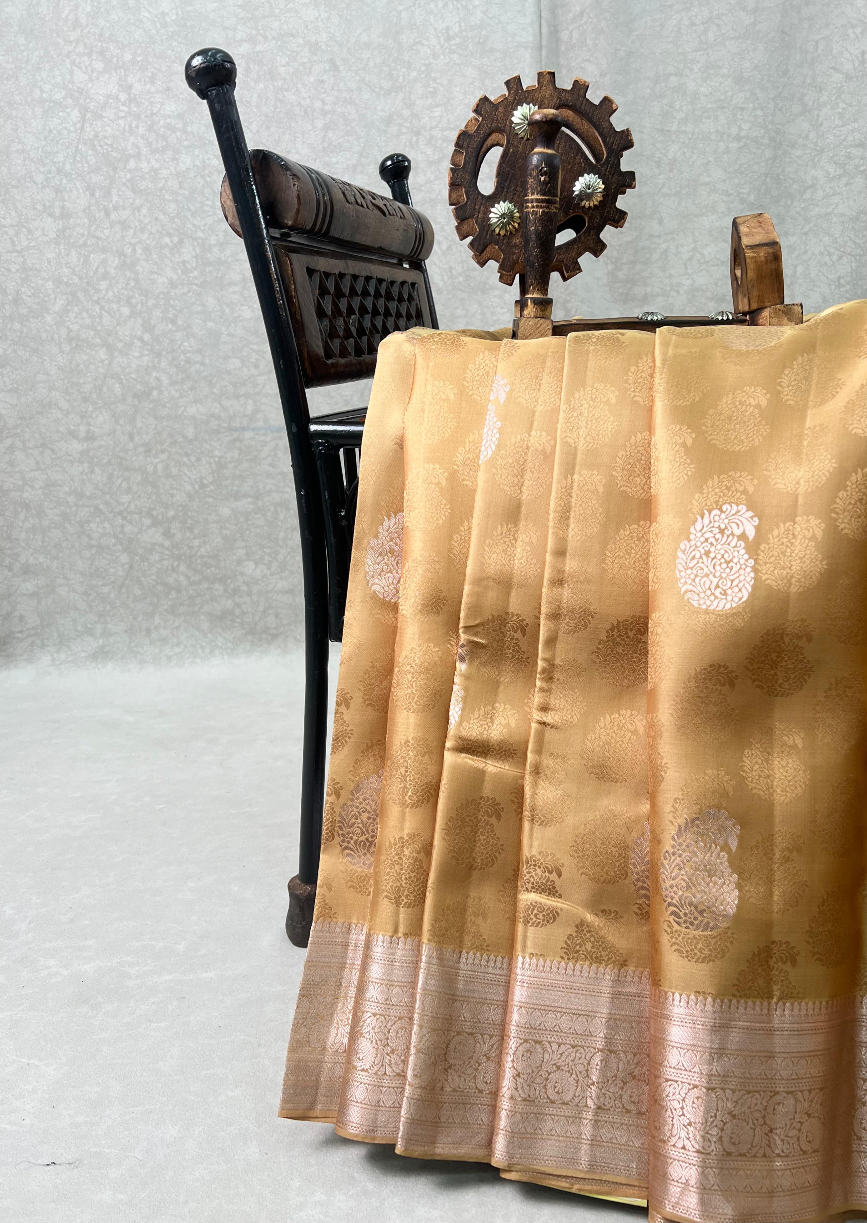 Graceful and vibrant, this Kanchipuram pure silk handloom saree features a striking combination of Fawn Color with a contrasting Gold Zari border. The intricate gold zari motifs and traditional patterns add timeless elegance, making it perfect for festive occasions and celebrations. Comes with Self blouse and Silk Mark Certified.