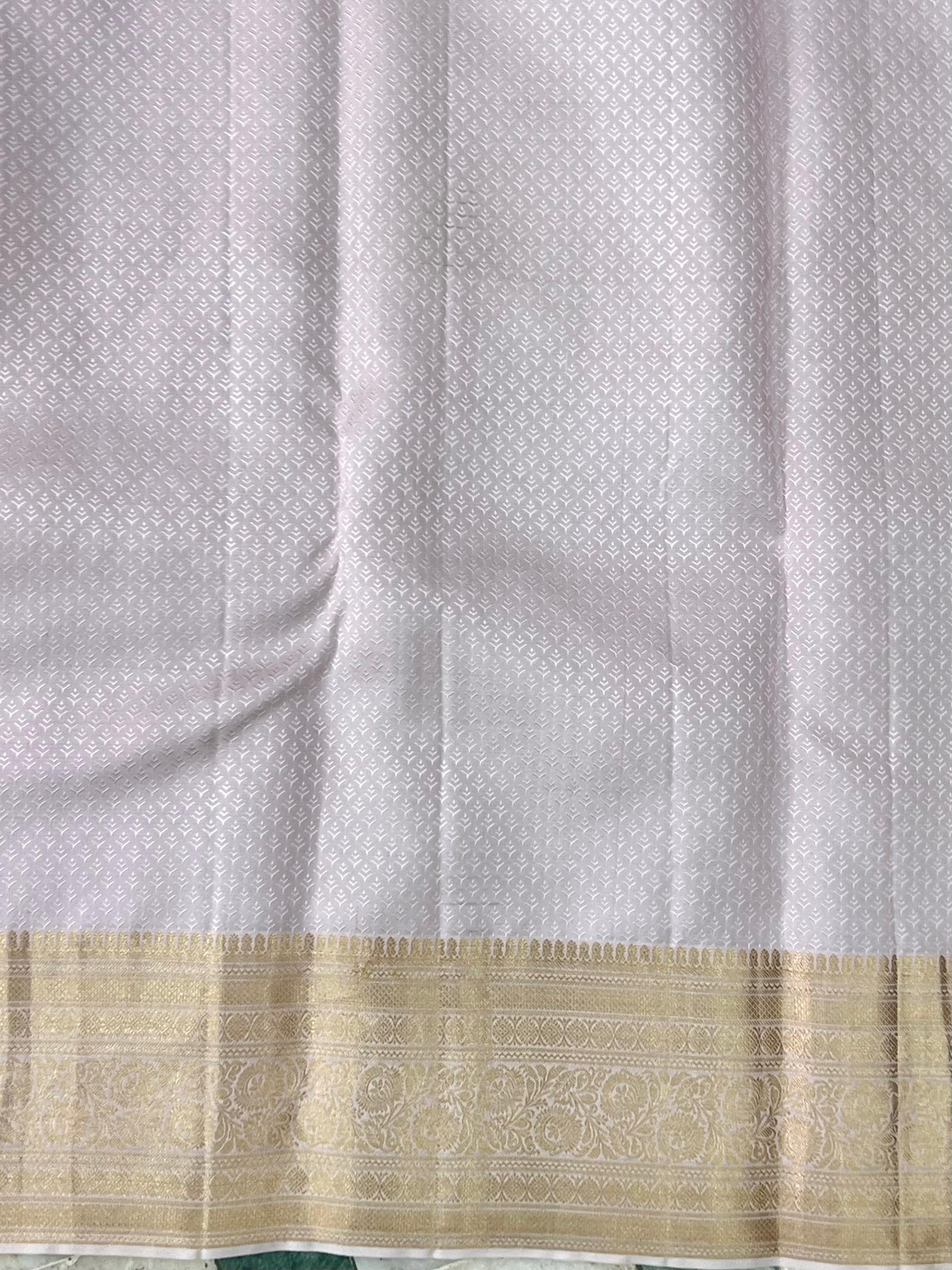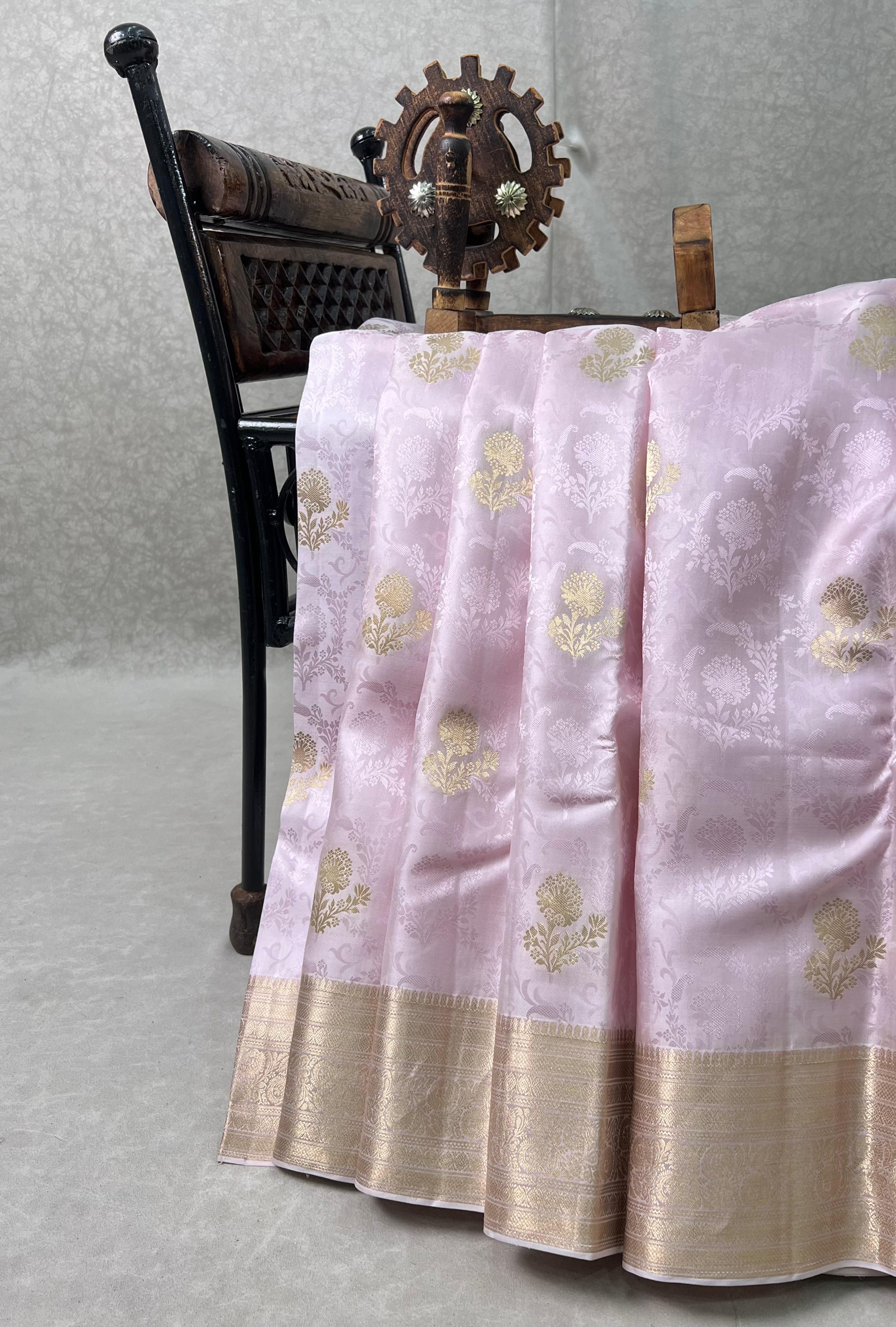 Graceful and vibrant, this Kanchipuram pure silk handloom saree features a striking combination of Pastel Pink with a contrasting Gold Zari border. The intricate gold zari motifs and traditional patterns add timeless elegance, making it perfect for festive occasions and celebrations. Comes with Self blouse and Silk Mark Certified.