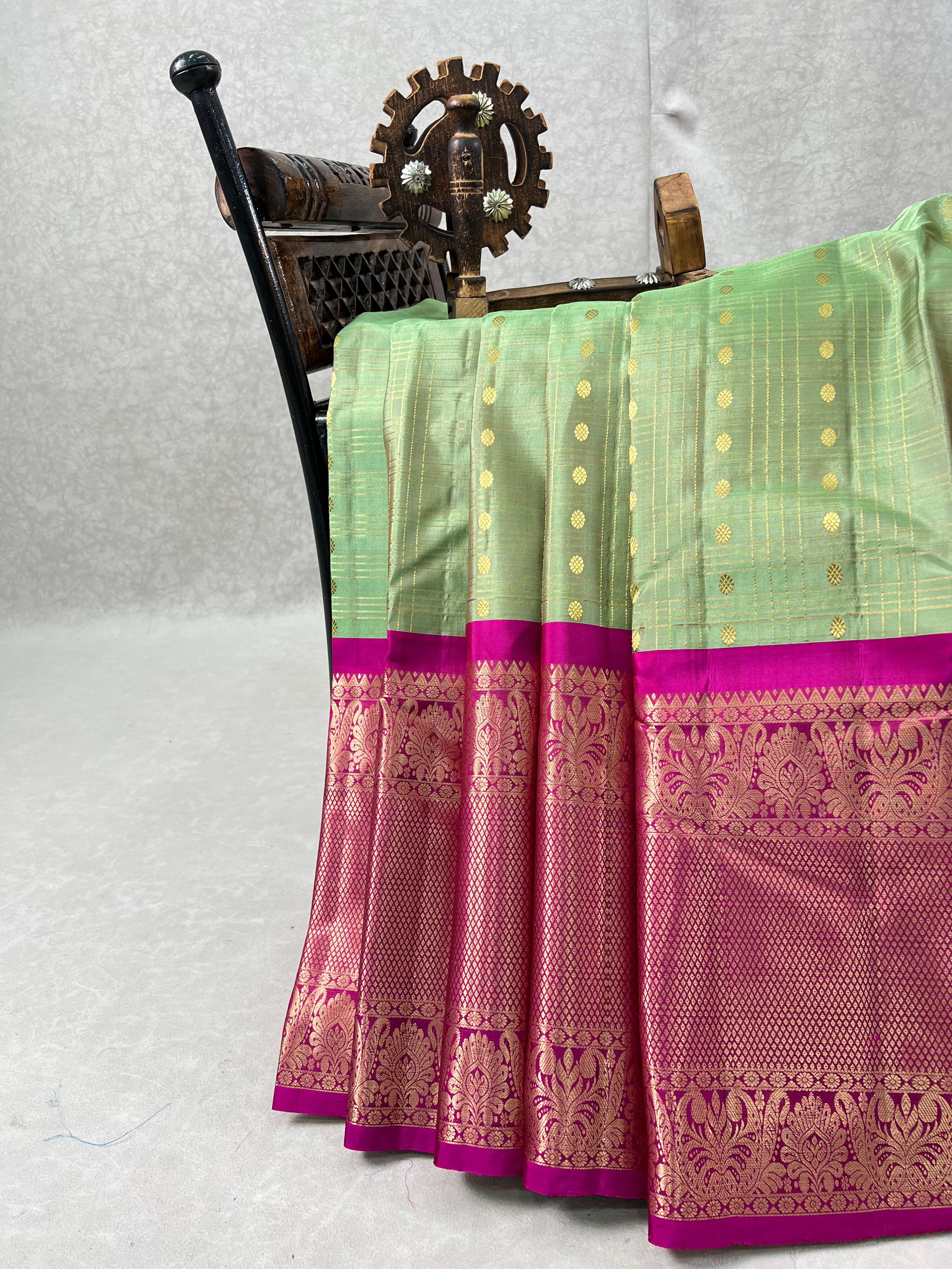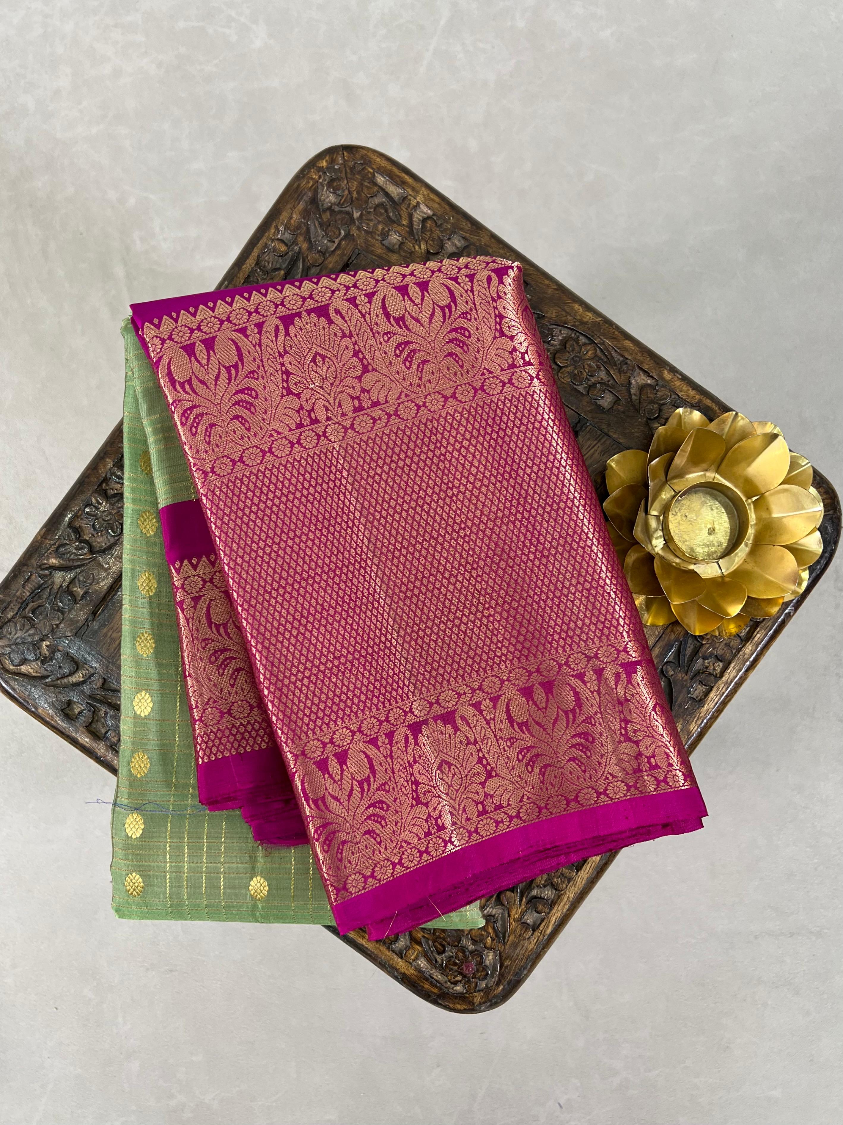 This elegant Kanchipuram Pure Silk Handloom Saree is a beautiful blend of tradition and luxury. The saree features a rich, Light olive green body that radiates sophistication, complemented by intricate golden zari checks with Gold zari motifs scattered across the body. These delicate motifs add a touch of timeless beauty and grace to the fabric, enhancing the overall visual appeal of the saree. The golden zari work on magenta border showcases traditional craftsmanship, with paisley and geometric motifs intricately woven to perfection. This saree comes with Contrast Blouse and it is Silk mark certified.