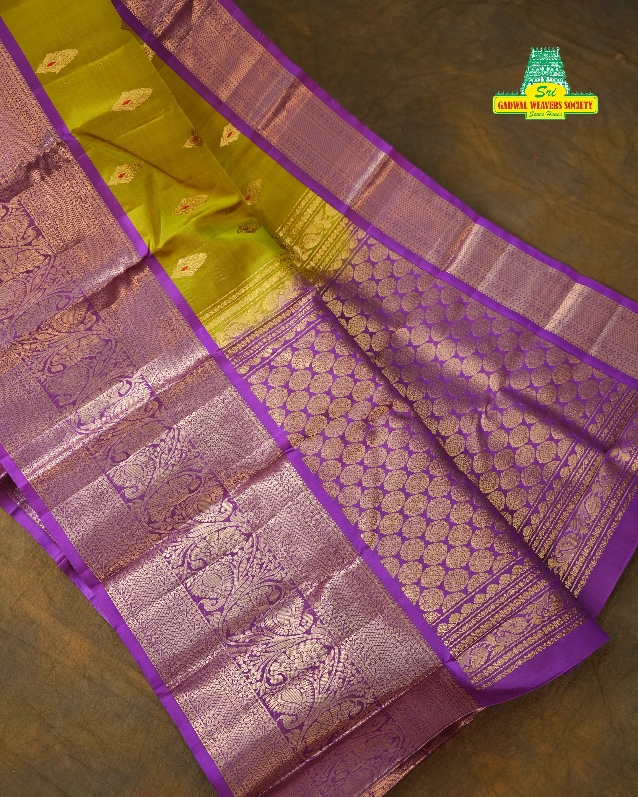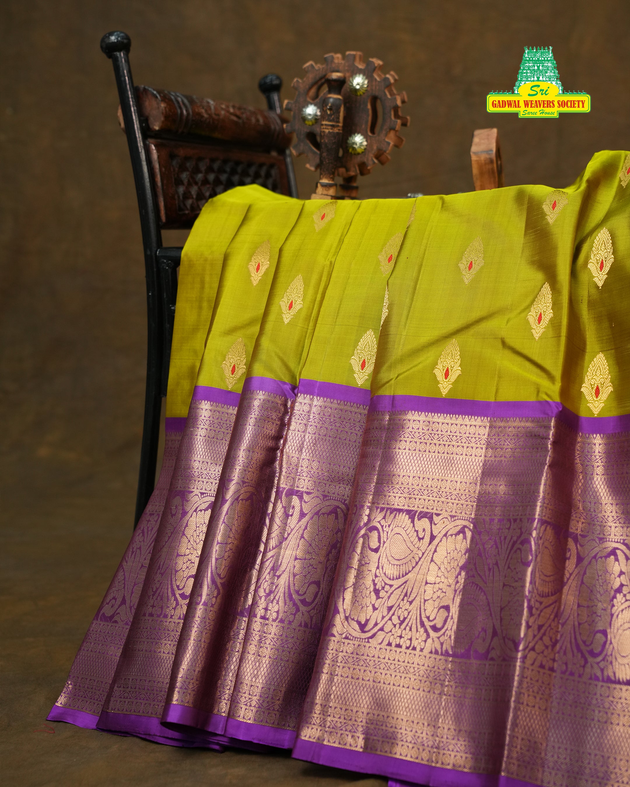 This elegant Kanchipuram Pure Silk Handloom Saree is a beautiful blend of tradition and luxury. The saree features a rich, Mehindi Green body that radiates sophistication, complemented by intricate Golden zari meena buttas scattered across the body. These delicate motifs add a touch of timeless beauty and grace to the fabric, enhancing the overall visual appeal of the saree. The golden zari work on Purple big border showcases traditional craftsmanship, with paisley and geometric motifs intricately woven to perfection. This saree comes with Contrast Blouse and it is Silk mark certified.