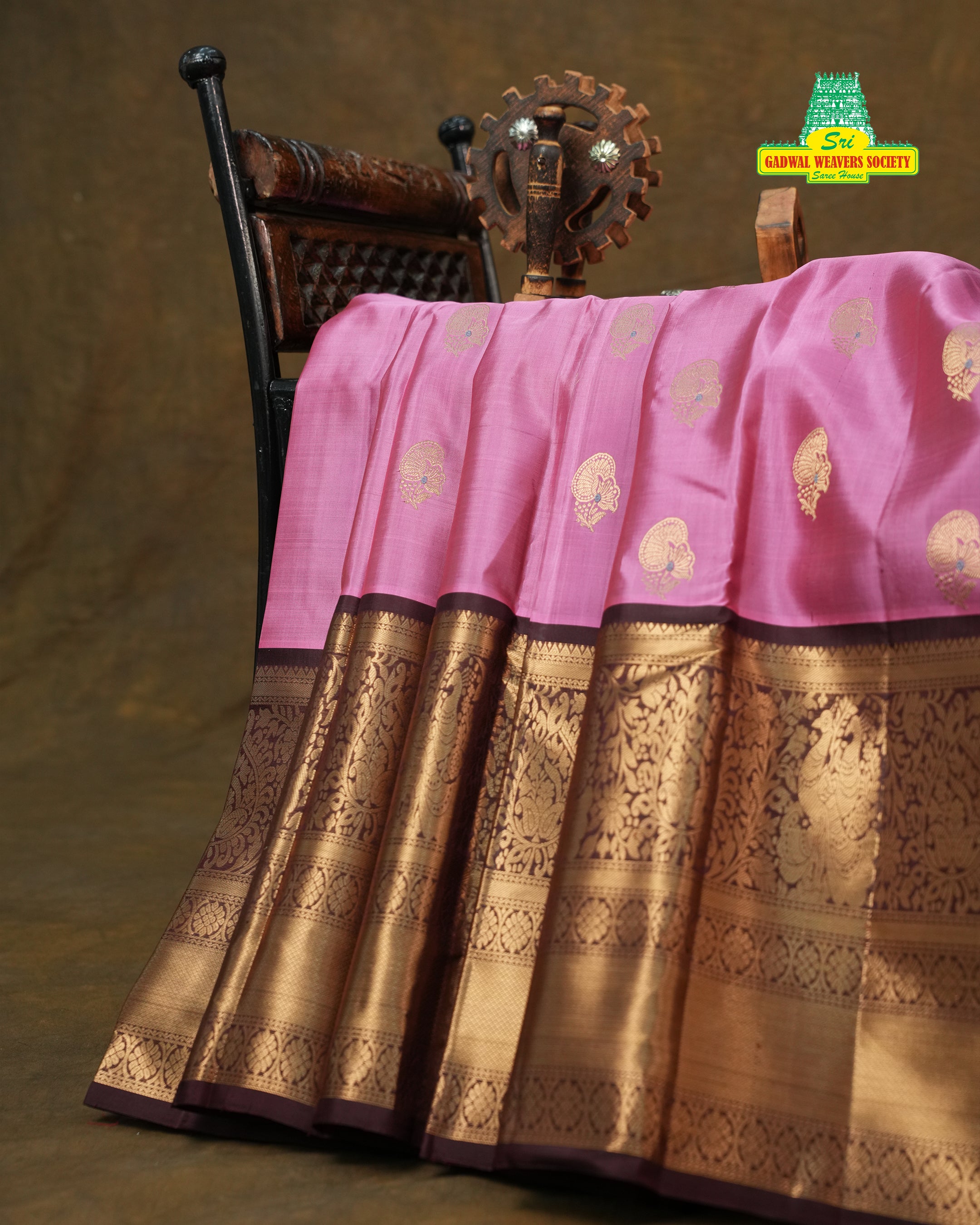 This elegant Kanchipuram Pure Silk Handloom Saree is a beautiful blend of tradition and luxury. The saree features a rich, Onion pink body that radiates sophistication, complemented by intricate Golden zari meena buttas scattered across the body. These delicate motifs add a touch of timeless beauty and grace to the fabric, enhancing the overall visual appeal of the saree. The golden zari work on Dark chocolate brown big border showcases traditional craftsmanship, with paisley and geometric motifs intricately woven to perfection. This saree comes with Contrast Blouse and it is Silk mark certified.