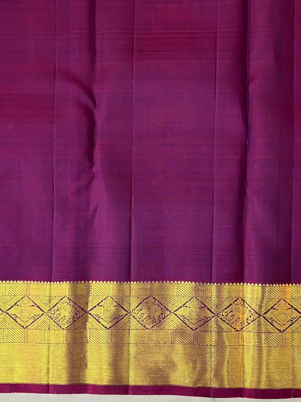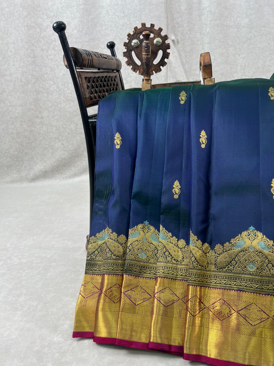 This exquisite Kanchipuram Pure Silk Handloom Saree comes in a dual shade dark Green and blue body, enhanced with finely woven gold zari motifs that add a touch of timeless sophistication. The highlight of the saree is its grand Meena Turning border with Pink color, intricately crafted with opulent gold zari weaving, and comes with Contrast Blouse depicting traditional procession motifs that reflect the heritage of pure Kanchipuram craftsmanship, making this saree a perfect choice for weddings, festive occasions, and grand celebrations, This saree is Silk mark certified.