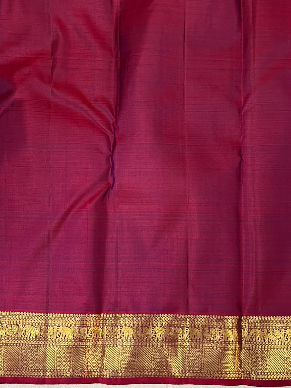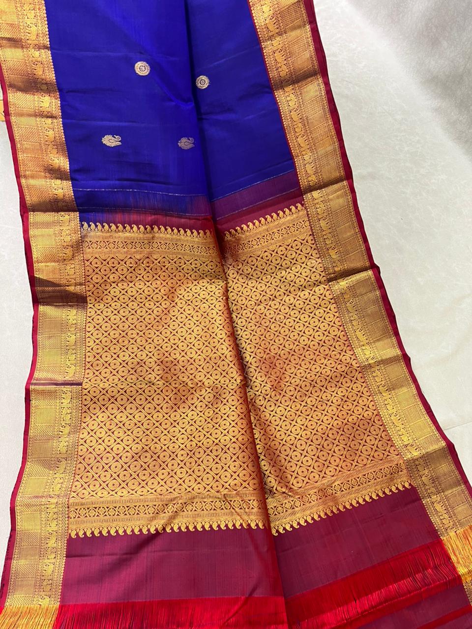 This elegant Kanchipuram Pure Silk Handloom Saree is a beautiful blend of tradition and luxury. The saree features a rich, Blue body that radiates sophistication, complemented by intricate golden zari motifs scattered across the body. The golden zari red border intricately woven with timeless floral Elephant and peacock design showcases traditional craftsmanship, with paisley and geometric motifs intricately woven to perfection. This saree comes with Contrast Blouse and it is Silk mark certified.