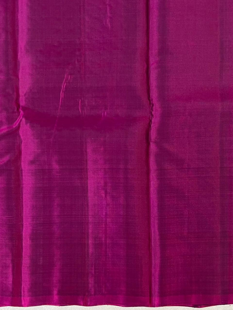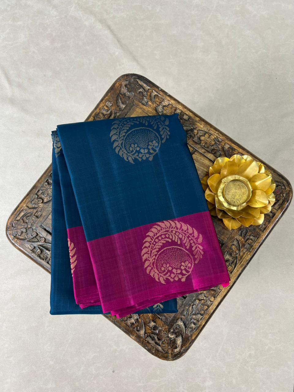 This exquisite Kanchipuram Pure Silk Handloom Saree features a rich Peacock Blue body enhanced with finely woven gold zari motifs that add a touch of timeless sophistication. The highlight of the saree is its grand Magenta color border with big Gold zari motifs depicting a traditional procession, reflecting the heritage of pure Kanchipuram craftsmanship. Paired with a contrast blouse, this saree is a perfect choice for weddings, festive occasions, and grand celebrations. This saree is Silk Mark certified.