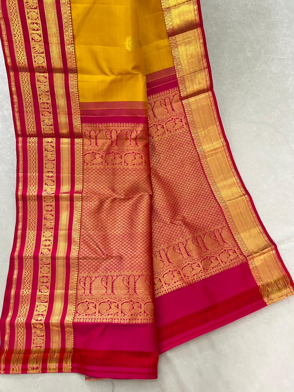 Graceful and vibrant, this Kanchipuram Pure Silk Handloom Saree features a striking combination of Mustard yellow body with a contrasting Pink red kuttu border. The intricate gold zari motifs and traditional patterns add timeless elegance, making it perfect for festive occasions and celebrations. This saree comes with contrast blouse and is Silk Mark Certified.