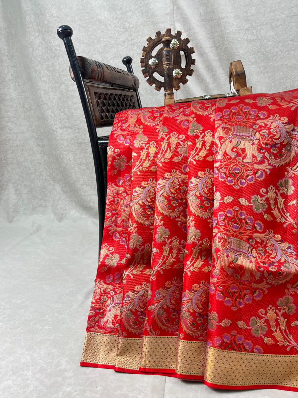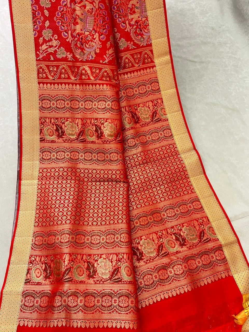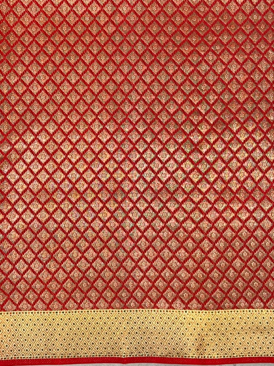 This Royal Red Kanchi Bridal Designer Handloom Saree is a splendid expression of traditional luxury, woven in pure Kanchipuram silk with a rich and graceful drape. The vibrant royal red body is beautifully enhanced with all-over gold zari paisley and floral motifs, highlighted with subtle meena detailing, making it perfect for bridal and wedding occasions. Completing the look is a striking broad gold zari meena motifs self red border, intricately woven with traditional geometric and diamond patterns, this saree comes with Self blouse and is Silk mark certified.