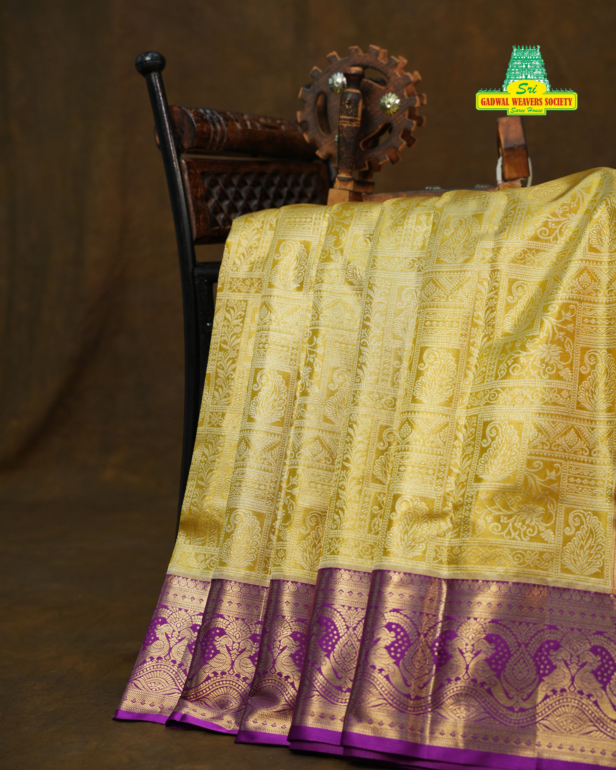 This luxurious Kanchi Pure Silk Kuttu Pastel Handloom Saree showcases a rich and elegant Golden yellow body, beautifully woven with intricate all-over brocade-style patterns and floral paisley motifs that reflect the grandeur of traditional Kanchipuram craftsmanship. Giving the saree a royal texture and a luminous silk sheen. It is gracefully contrasted with a striking Purple border, richly embellished with gold zari Peacock designs, this saree a perfect choice for weddings, festive occasions, and grand celebrations, and this saree comes with Contrast blouse and is silk mark certified