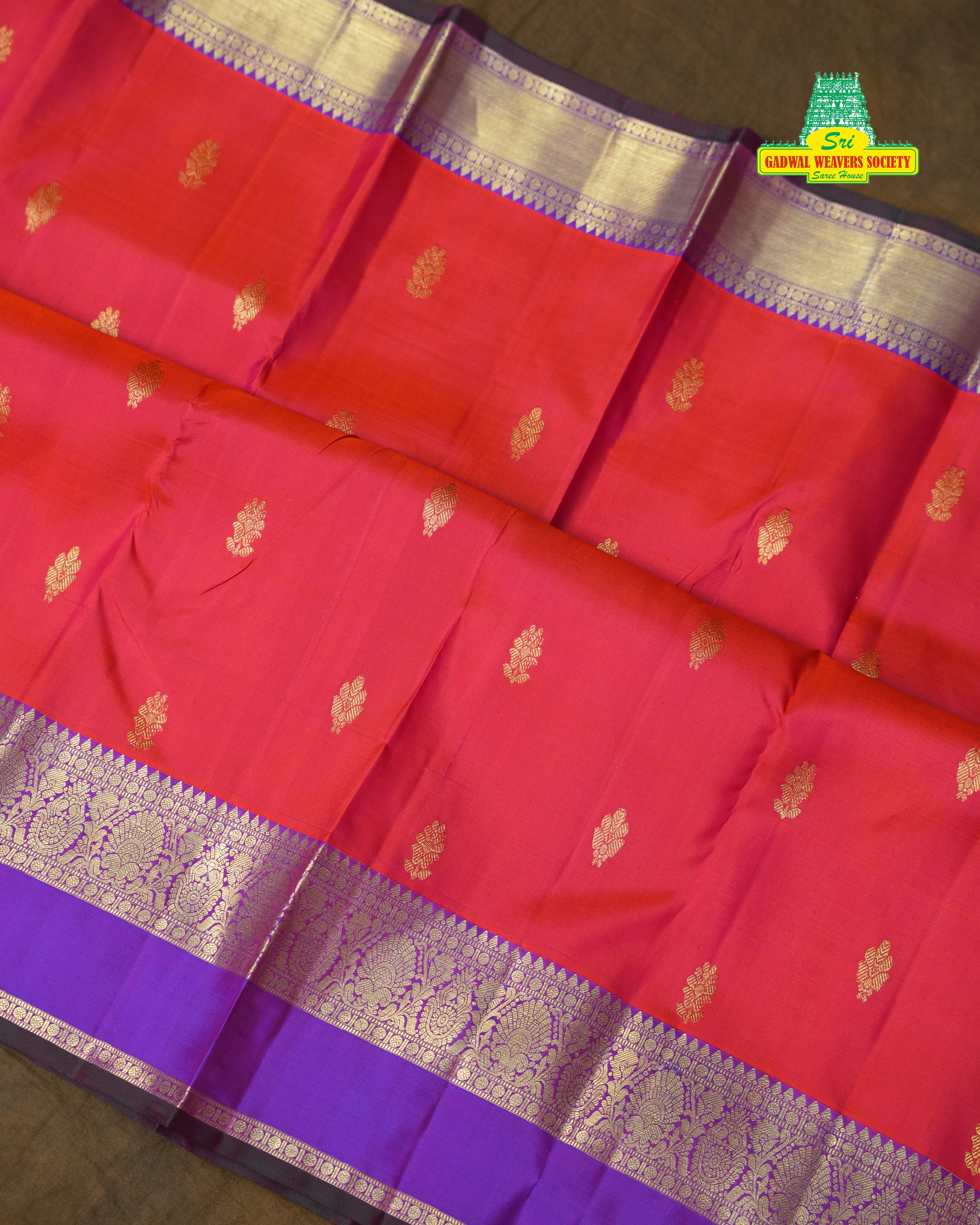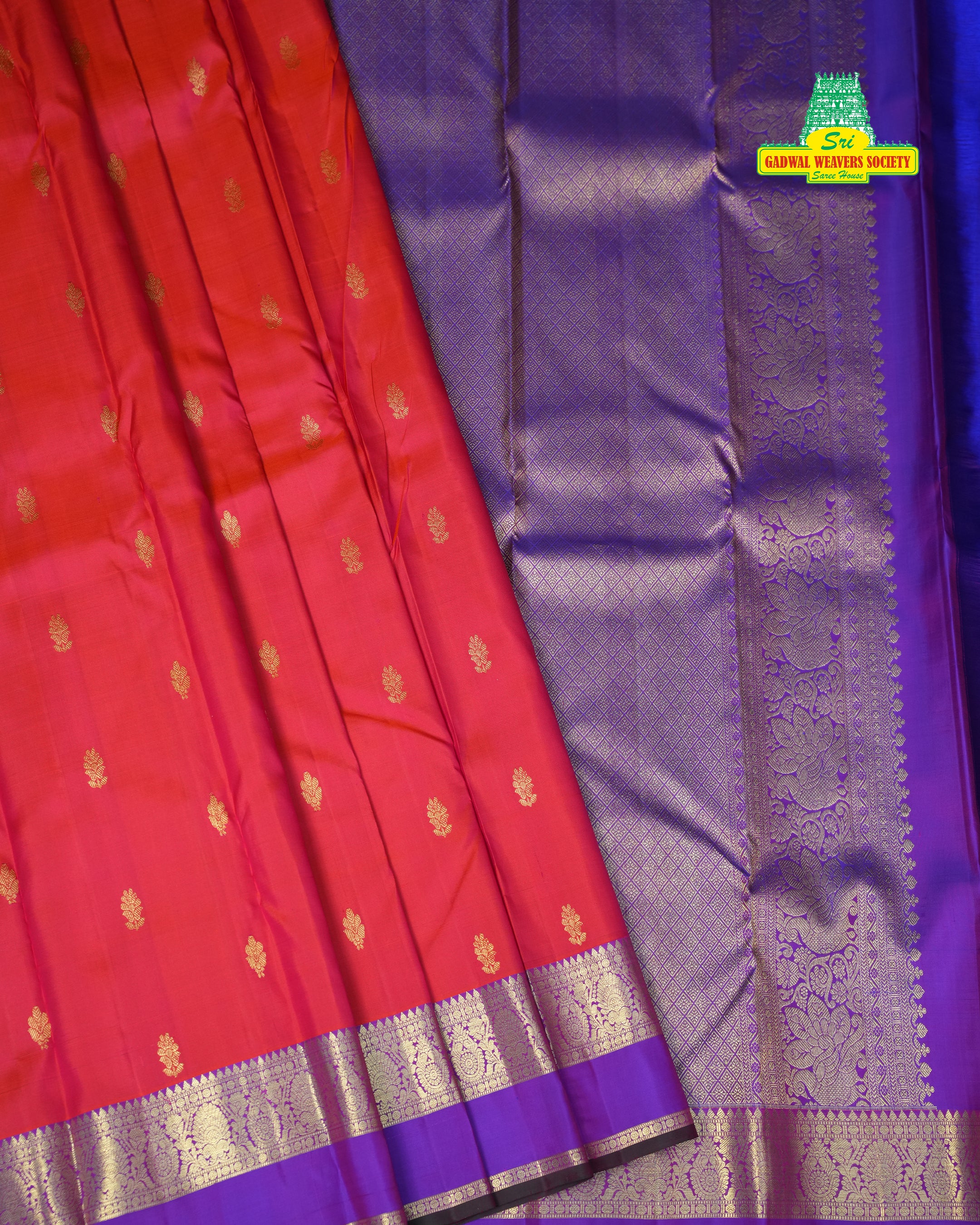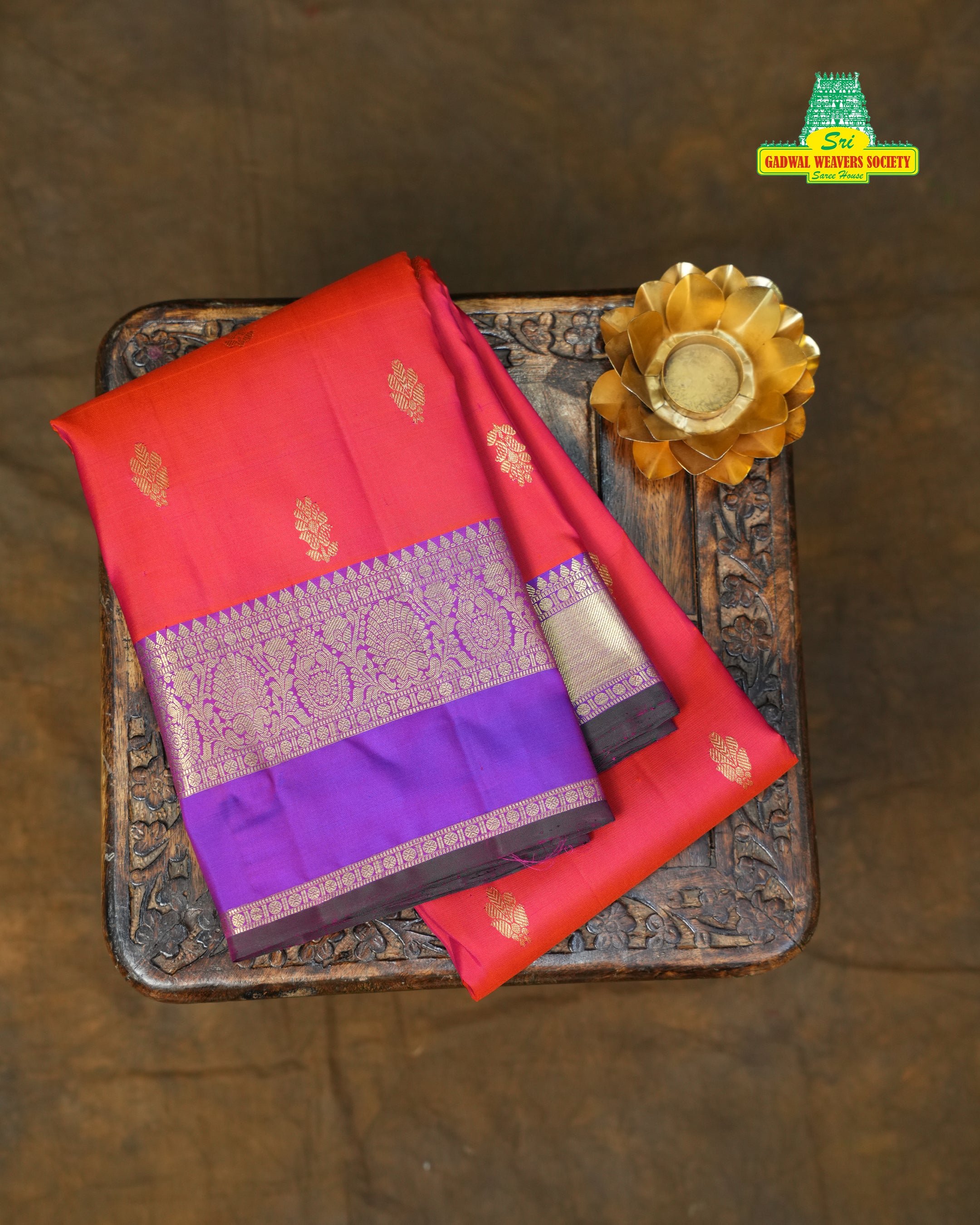 This stunning Kanchipuram Pure Silk Saree is a true masterpiece of South Indian weaving tradition. Crafted in a neor red colour, it features a beautifully detailed contrast gap border in deep purple, adorned with intricate gold zari work. The elegant gold buttas and the grand ornamental pallu reflect the opulence and heritage of Kanchipuram craftsmanship. Ideal for festive occasions, weddings, or cultural celebrations, this saree is a perfect blend of tradition, luxury, and timeless beauty. Comes with contrast blouse and Silk Mark Certified.