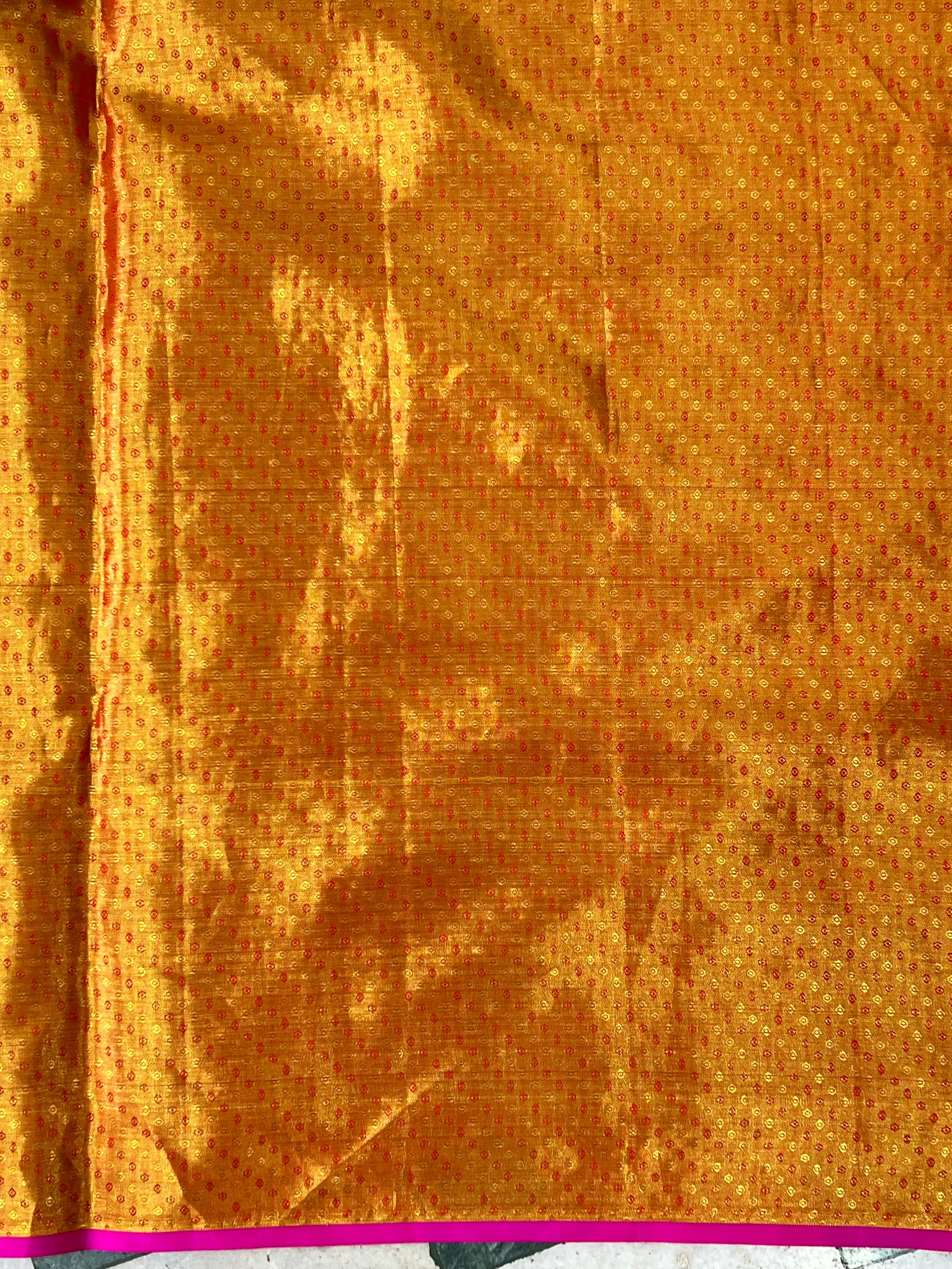 Radiant Kanchipuram Pure Silk Tissue Borderless Saree in a vibrant yellow base, adorned with intricate floral meenakari motifs in multicolor threads. The sleek borderless design is enhanced with a striking contrast pink selvedge, making it a perfect blend of tradition and elegance. It comes with a matching blouse for a complete and graceful look. Certified with Silk Mark, it ensures pure and authentic silk craftsmanship. Perfect for weddings, festivals, and special occasions, this saree adds timeless elegance and festive charm.