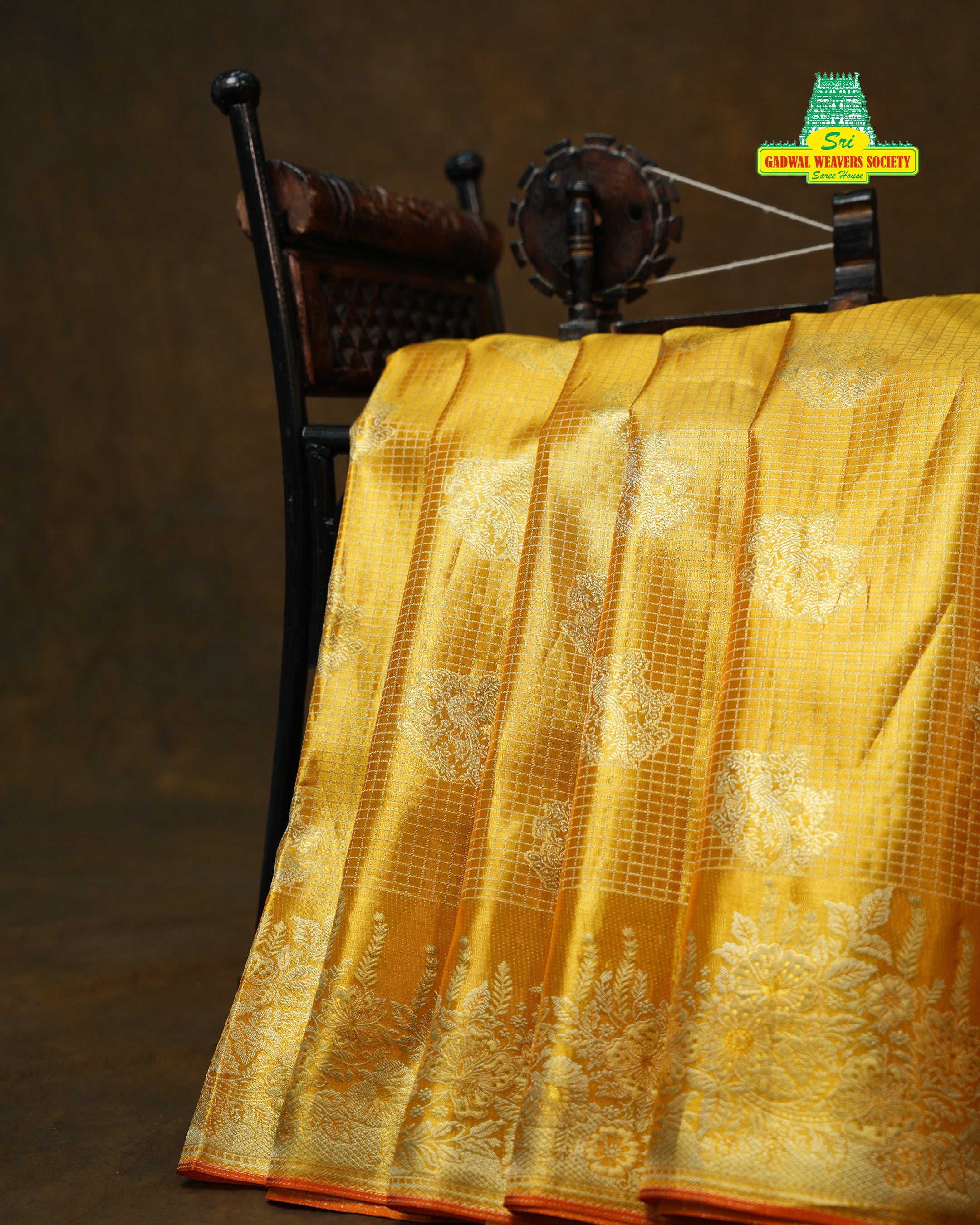 This Kanchipuram Pure Silk Tissue Handloom Saree exudes timeless elegance with its rich golden tissue body, intricately woven with delicate floral zari motifs that shimmer beautifully with every drape. The saree is accentuated by a majestic broad gold zari border featuring traditional floral patterns, finished with a subtle Orange selvedge that adds depth and contrast. Lustrous, lightweight, and luxurious, this saree is a perfect choice for weddings, festive occasions, and grand traditional celebrations, This saree comes with self blouse and it is silk mark certified.