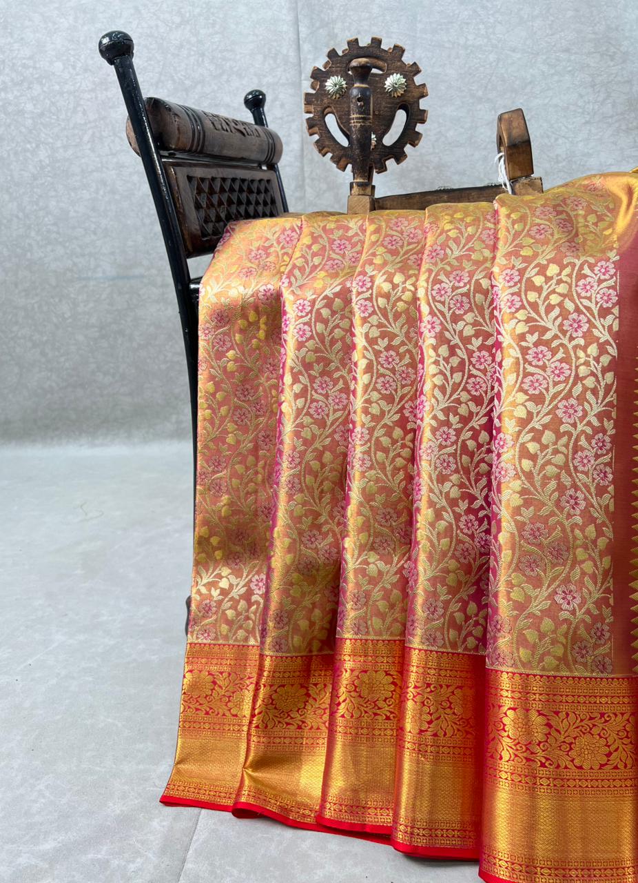 This exquisite Kanchipuram Pure Silk Tissue Handloom Saree features a rich rose gold tissue base, beautifully enhanced with delicate floral vine motifs woven in shimmering gold and soft pink hues. The striking contrast pink border, adorned with rich gold zari detailing and a classic red selvedge, adds depth, grandeur, and a truly regal finish. A perfect choice for weddings, festive occasions, and grand celebrations, this timeless weave embodies tradition, luxury, and heritage craftsmanship. The saree comes with a self blouse and is Silk Mark Certified,
