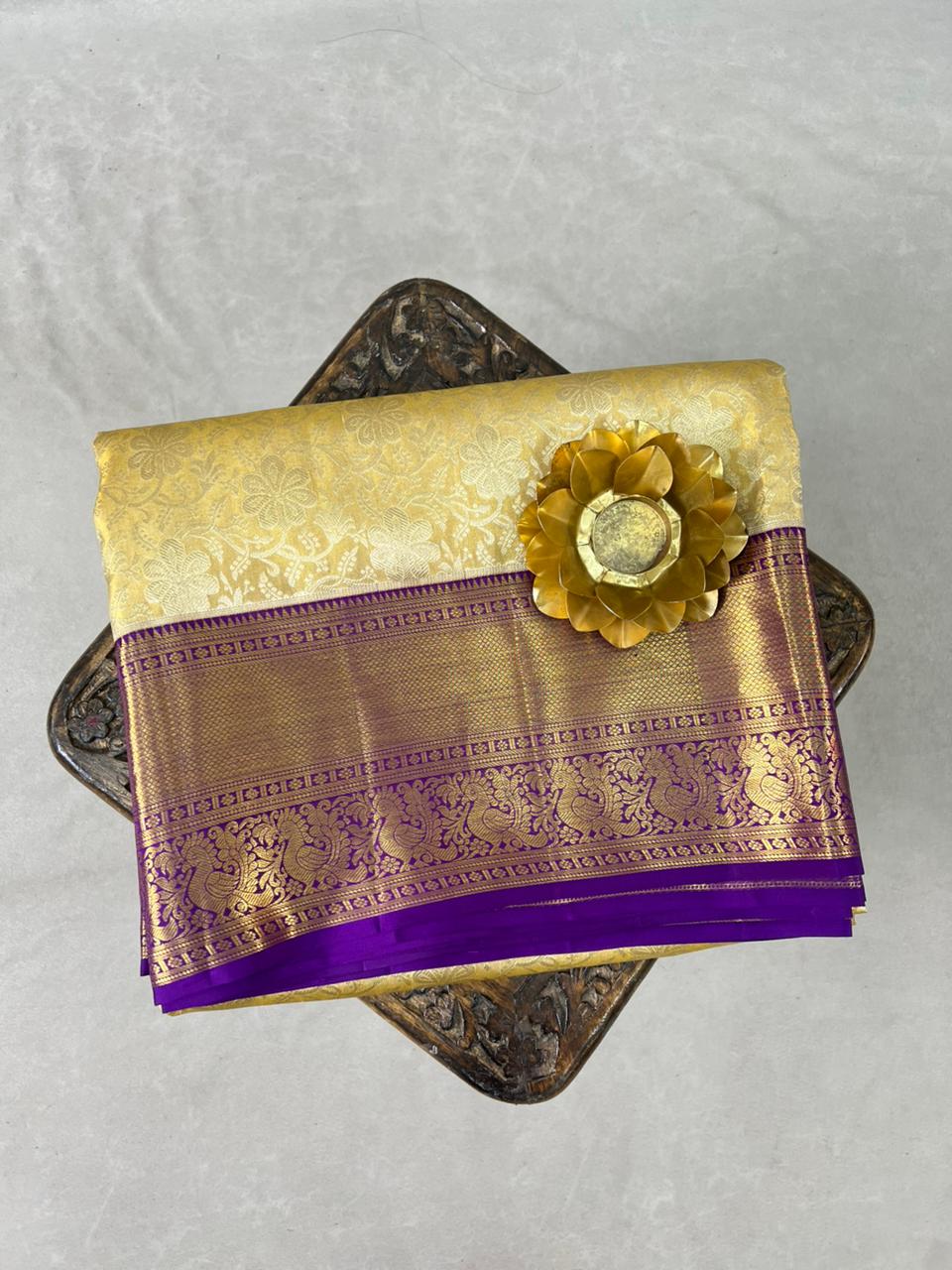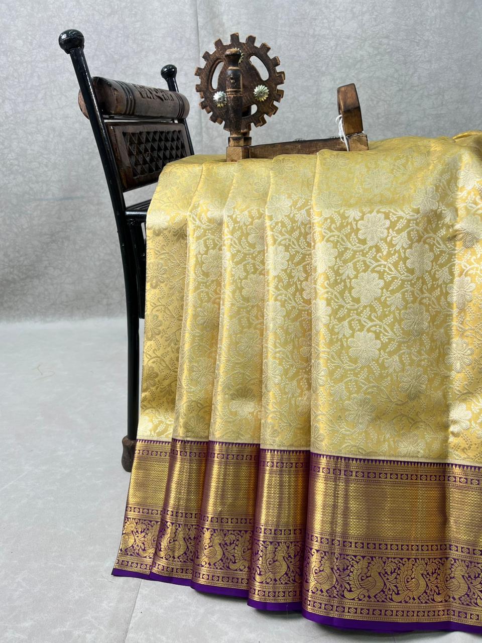 This exquisite Kanchipuram Pure Silk Tissue Handloom Saree features a rich gold color golden tissue base, beautifully enhanced with delicate floral motifs woven in shimmering gold hues. The striking contrast dark purple border, adorned with rich gold zari detailing, adds depth, grandeur, and a truly regal finish. A perfect choice for weddings, festive occasions, and grand celebrations, this timeless weave embodies tradition, luxury, and heritage craftsmanship. The saree comes with a self blouse and is Silk Mark Certified,