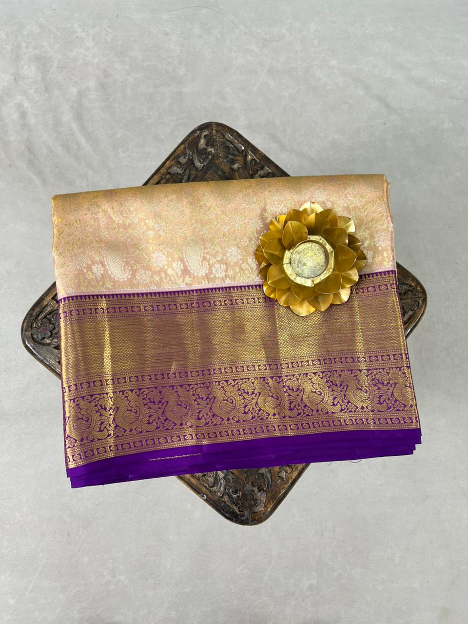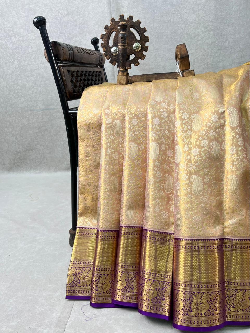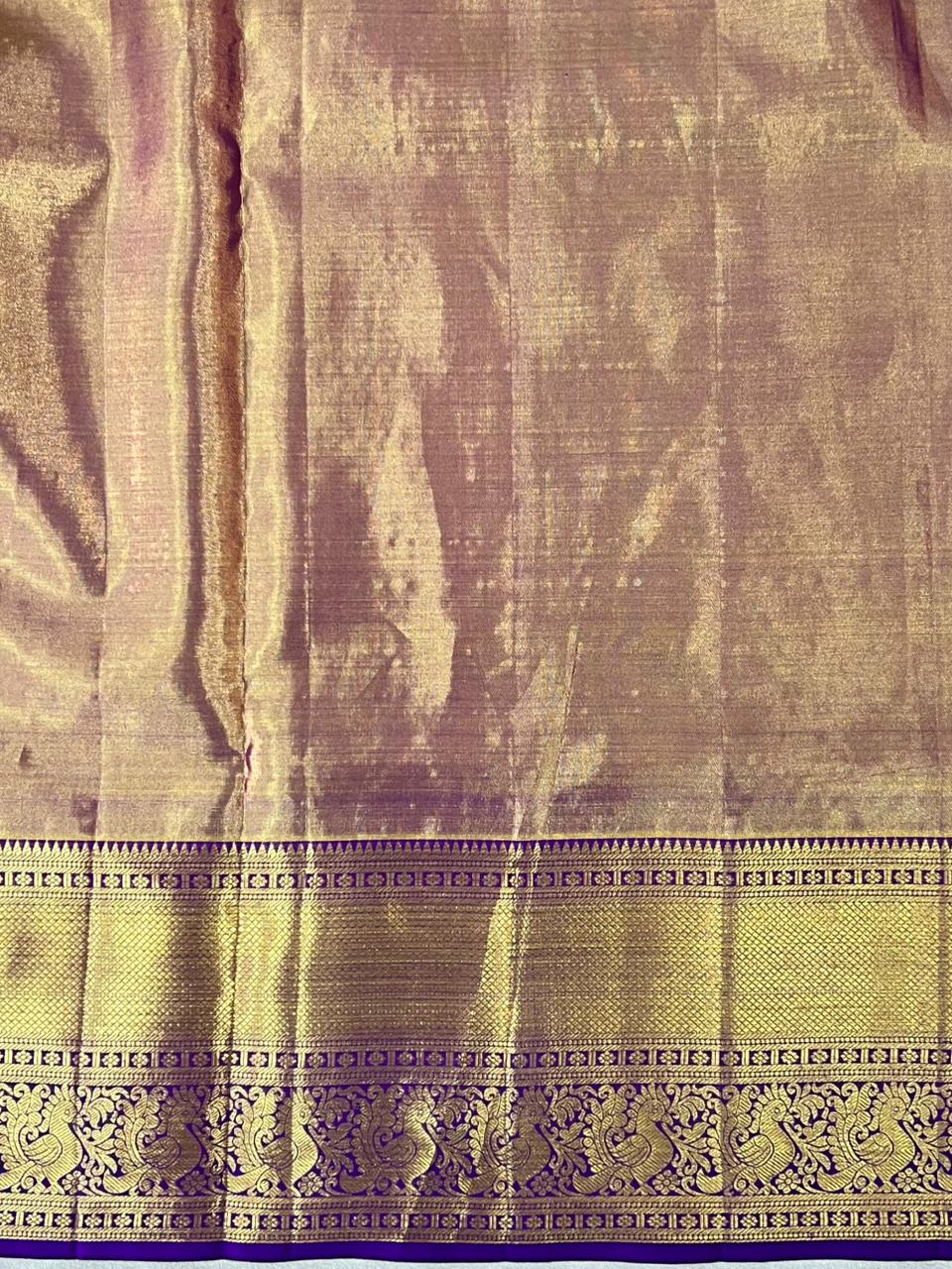 This exquisite Kanchipuram Pure Silk Tissue Handloom Saree features a rich Rose gold tissue base, beautifully enhanced with delicate floral motifs woven in shimmering gold hues. The striking contrast dark purple border, adorned with rich gold zari detailing, adds depth, grandeur, and a truly regal finish. A perfect choice for weddings, festive occasions, and grand celebrations, this timeless weave embodies tradition, luxury, and heritage craftsmanship. The saree comes with a self blouse and is Silk Mark Certified,