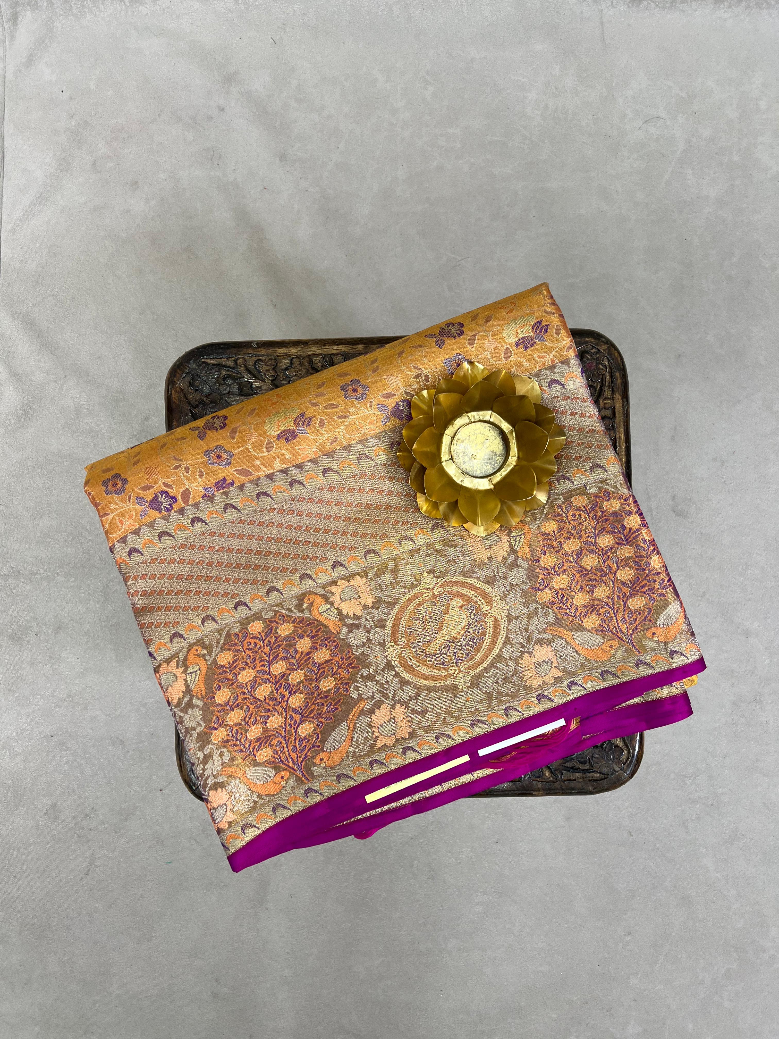This exquisite Kanchipuram Pure Silk Tissue Meena Saree features a stunning blend of golden tissue with intricate Meenakari weaving. The saree showcases elegant floral and tree motifs in rich zari, symbolizing tradition and grace. Its vibrant floral border and zari pallu with purple edge add a royal touch, making it perfect for festive and bridal occasions. Comes with matching self blouse and Silk Mark Certified.