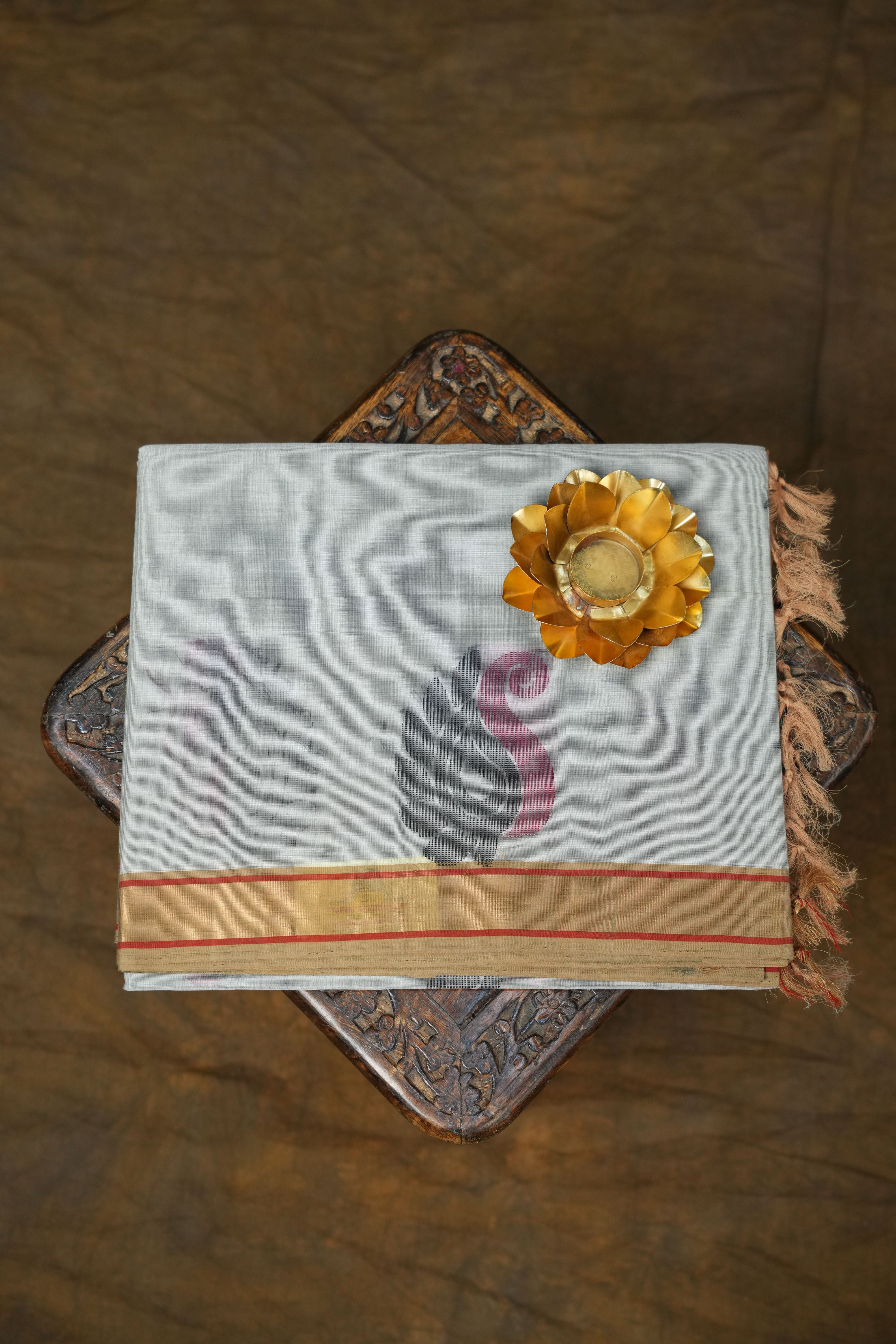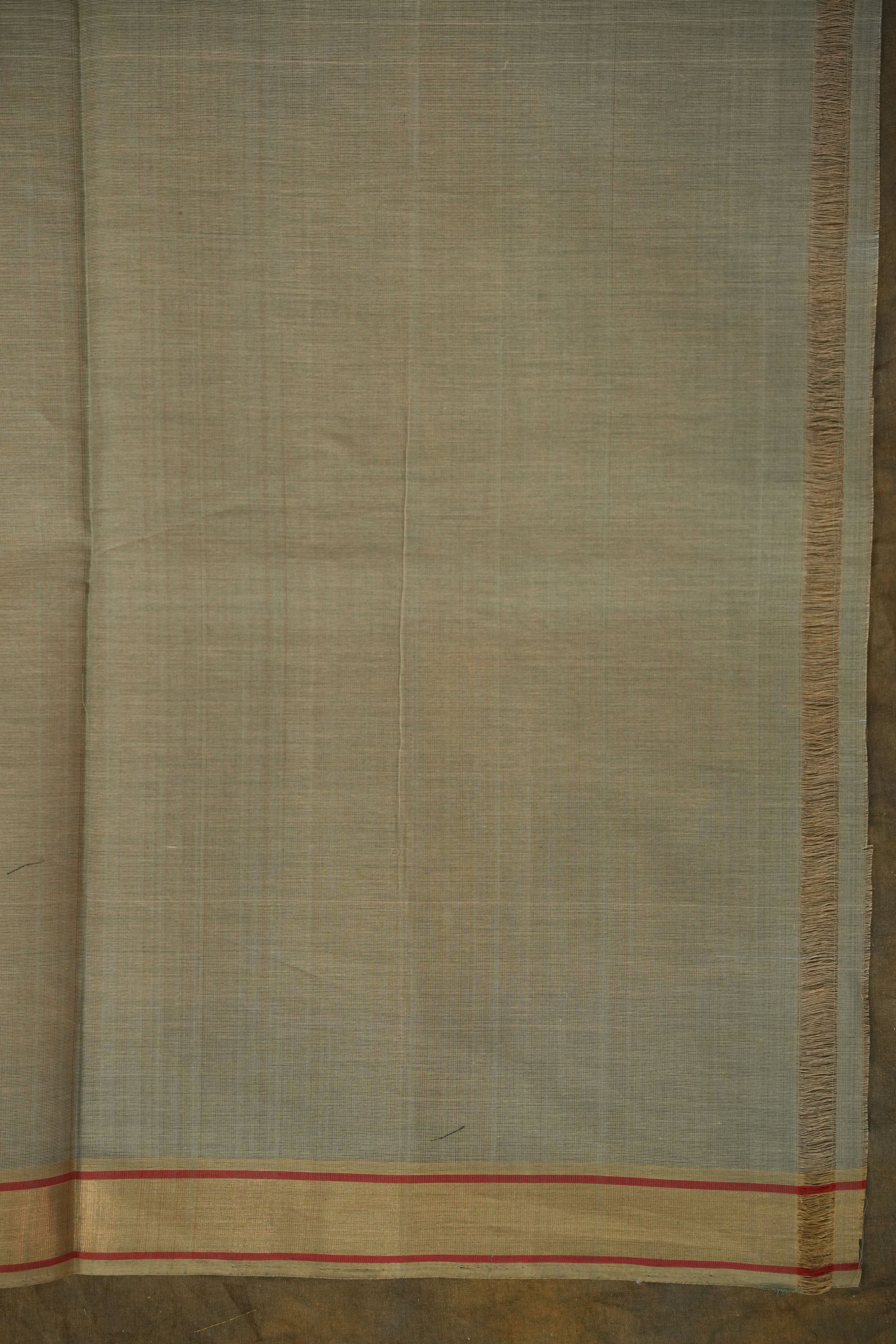 This beautiful Kanchi Cotton Saree features a calming Light Grey body,  adorned with subtle woven Black and Red thread motifs that enhance its natural elegance. The breathable Kanchi cotton fabric ensures comfort throughout the day. It is paired with a contrasting plain Light Brown border, ideal for casual outings, and ethnic occasions, this saree blends simplicity with classic handloom beauty. Comes with Self Blouse.