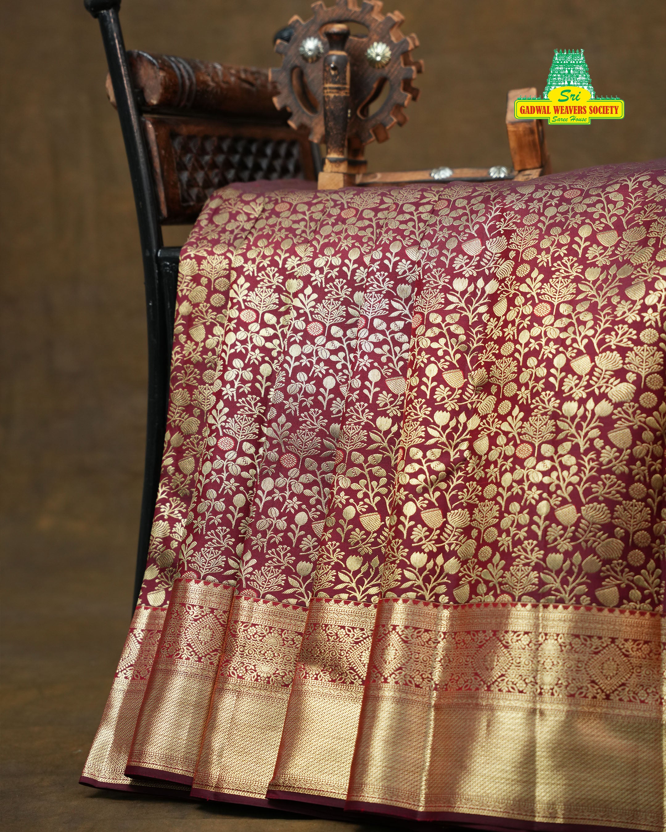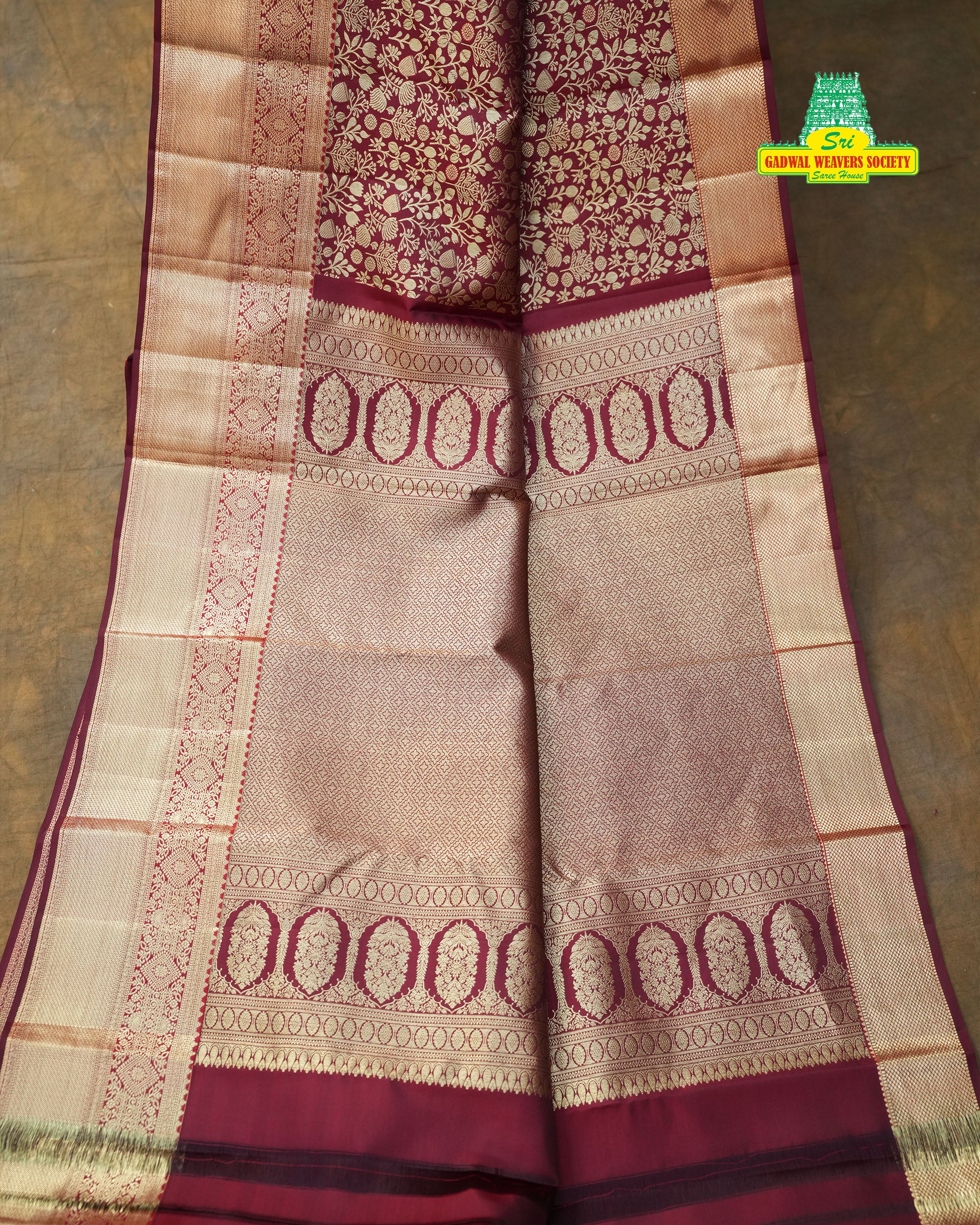 This exquisite Kanchi Pure Silk Brocade Handloom Saree showcases the timeless elegance of traditional craftsmanship with its rich maroon body and gold motifs adorned with delicate floral motifs. The highlight of the saree is its luxurious border, intricately woven with gold zari detailing, adding a regal brilliance that enhances its overall grandeur. The beautifully detailed pallu further reflects the artistry of classic Kanchi weaving, making this saree a perfect choice for weddings, festive celebrations, and special occasions where grace and heritage take center stage. This saree comes with self blouse and it is silk mark certified.