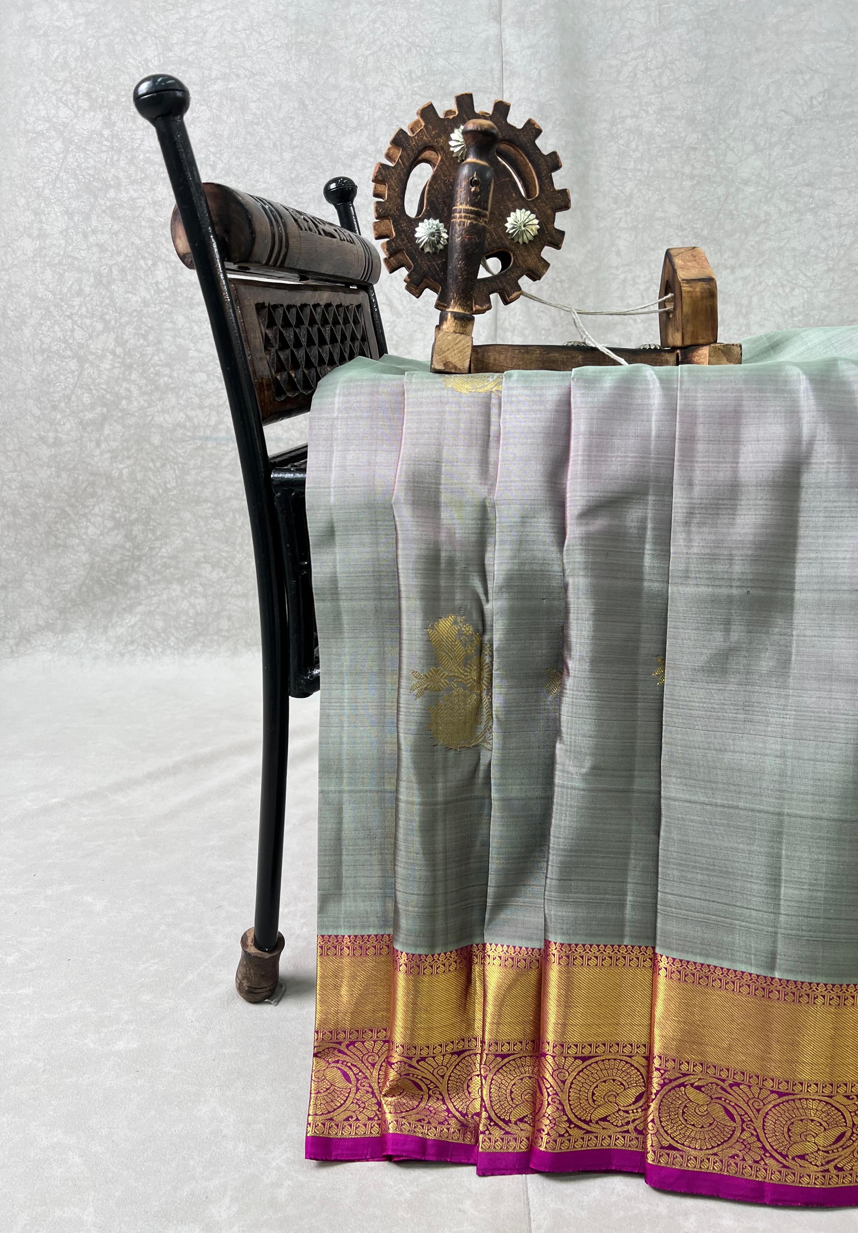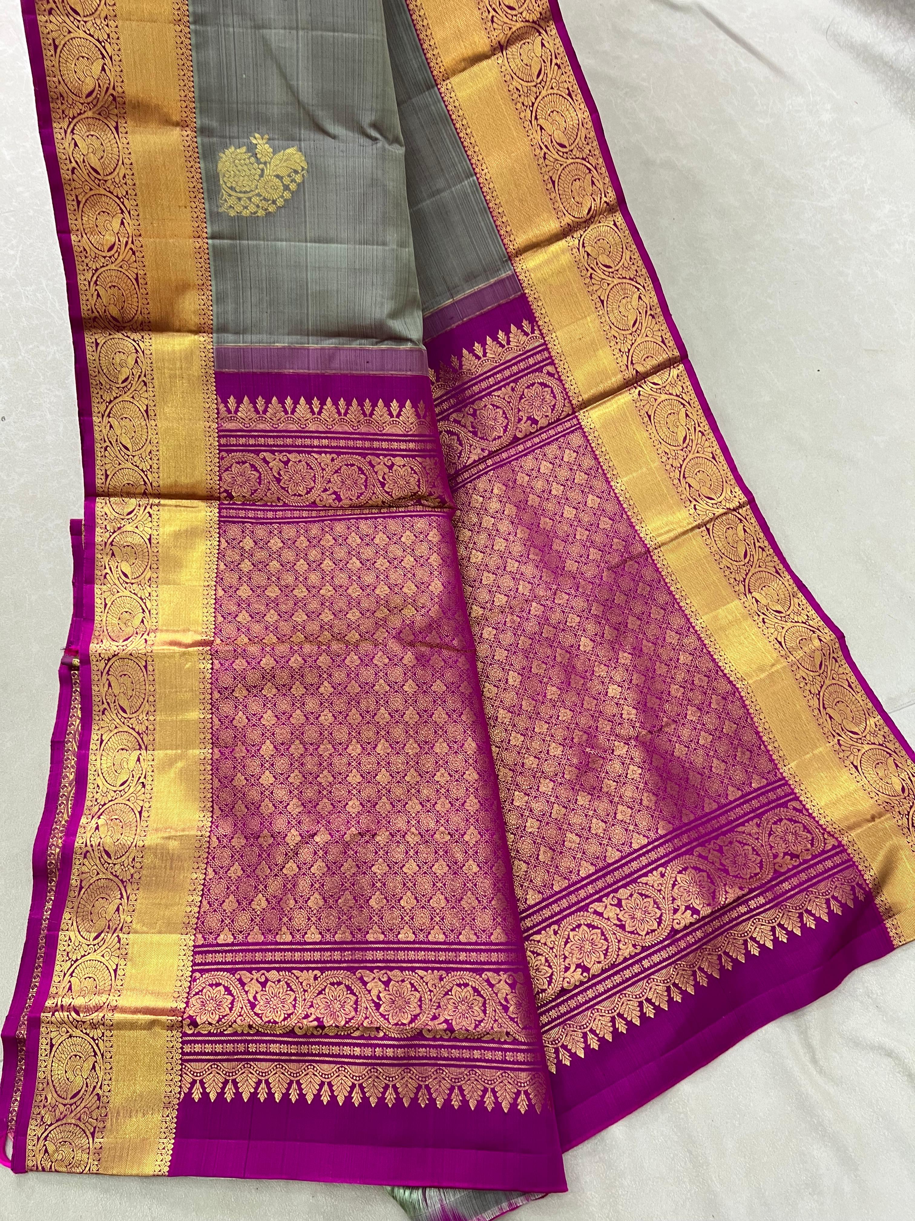 Graceful and vibrant, this Kanchipuram pure silk handloom saree features a striking combination of grey with a contrasting magenta border. The intricate gold zari motifs and traditional patterns add timeless elegance, making it perfect for festive occasions and celebrations. Comes with contrast blouse and Silk Mark Certified.