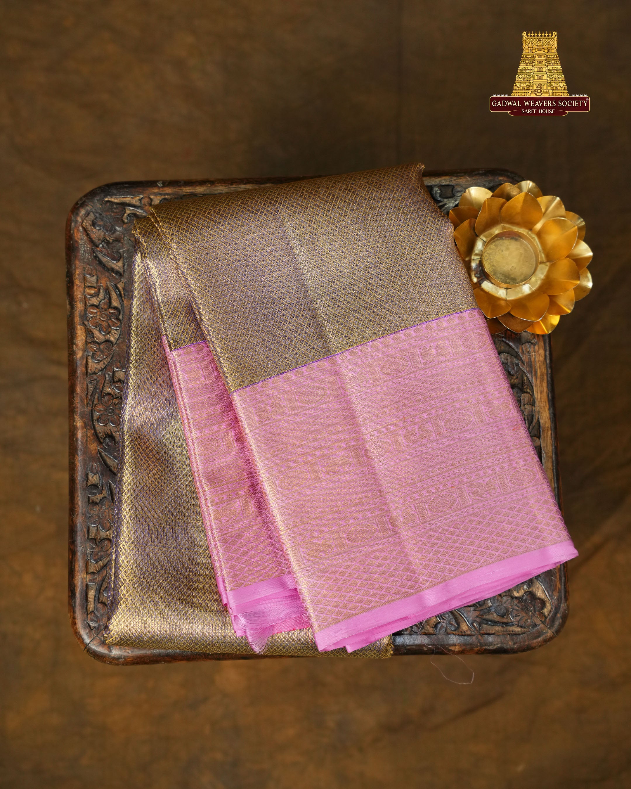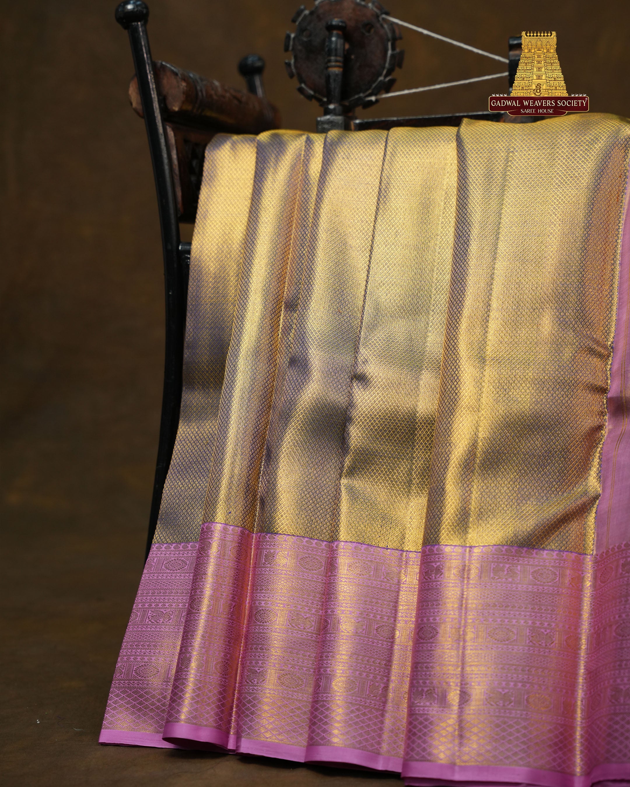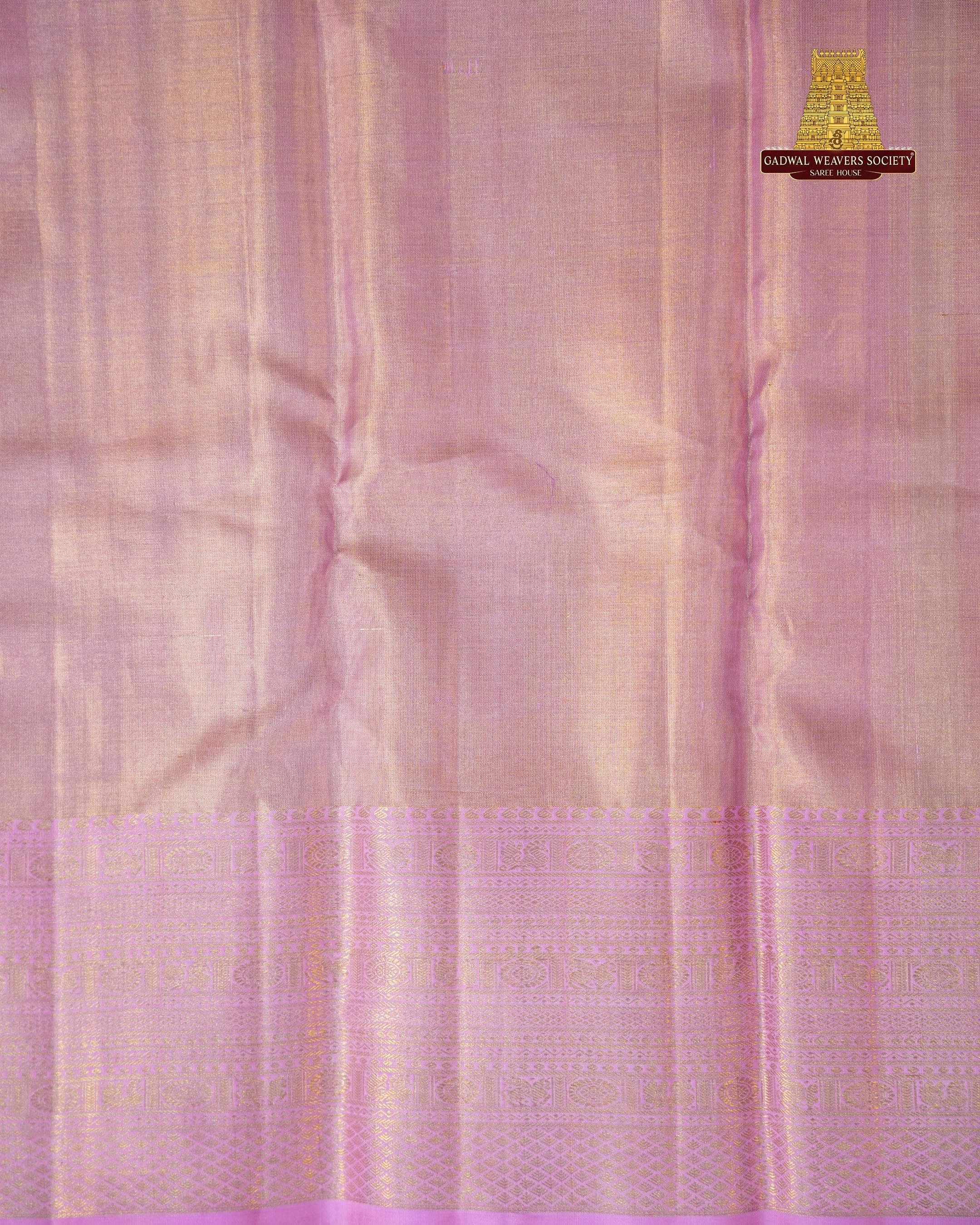 The body of this Kanchi pure silk handloom saree features a refined and elegant weave that highlights the richness of traditional craftsmanship. The saree body is woven in a beautiful dual-tone shade of soft gold and Purple, creating a subtle shimmering effect as the light falls on the fabric. It is designed with fine, closely woven zari buttis arranged in neat across the entire body, perfectly complementing the vibrant Baby Pink border and adding depth and elegance to the saree. This saree comes with Contrast border and is Silk mark certified.
