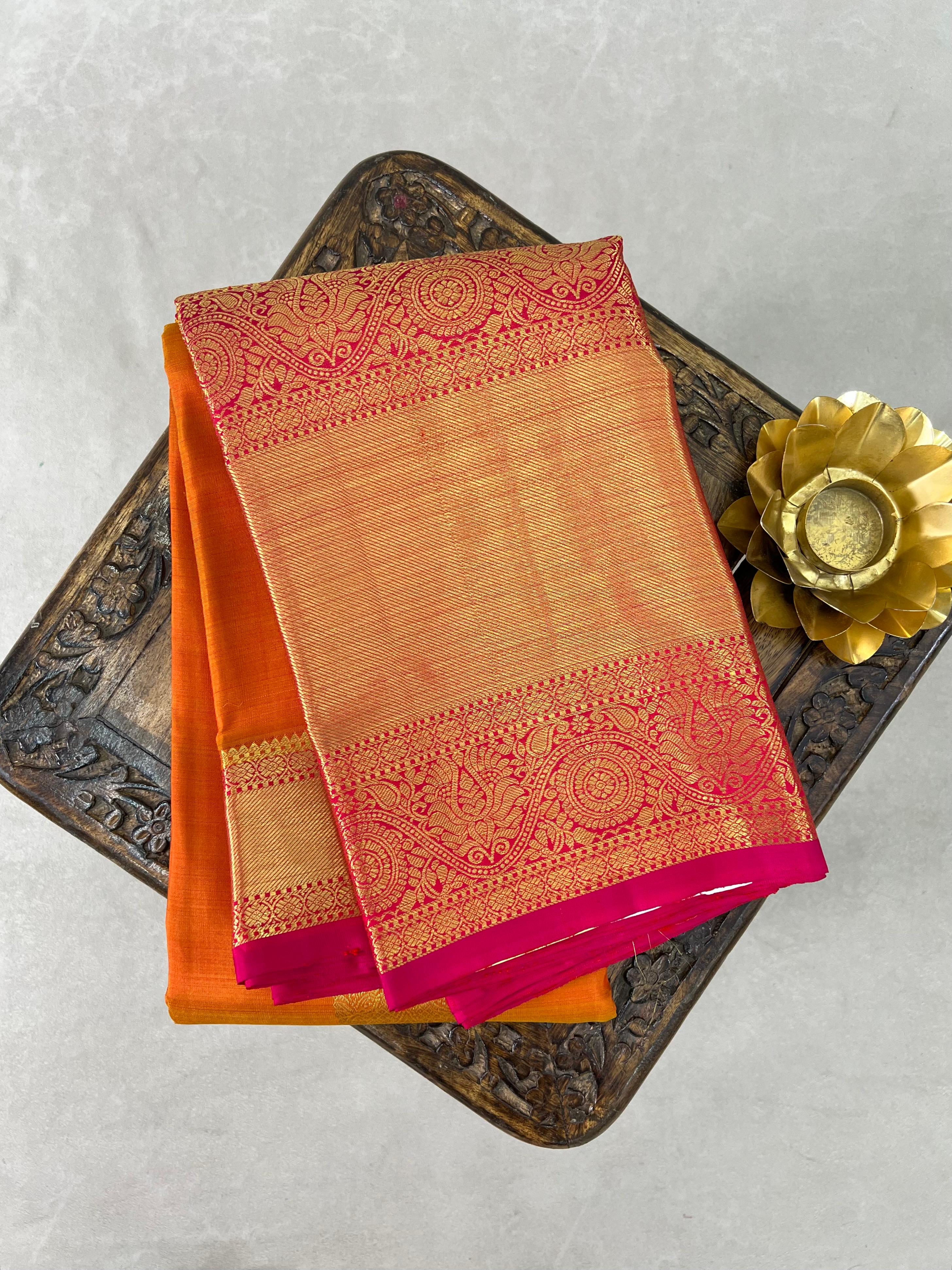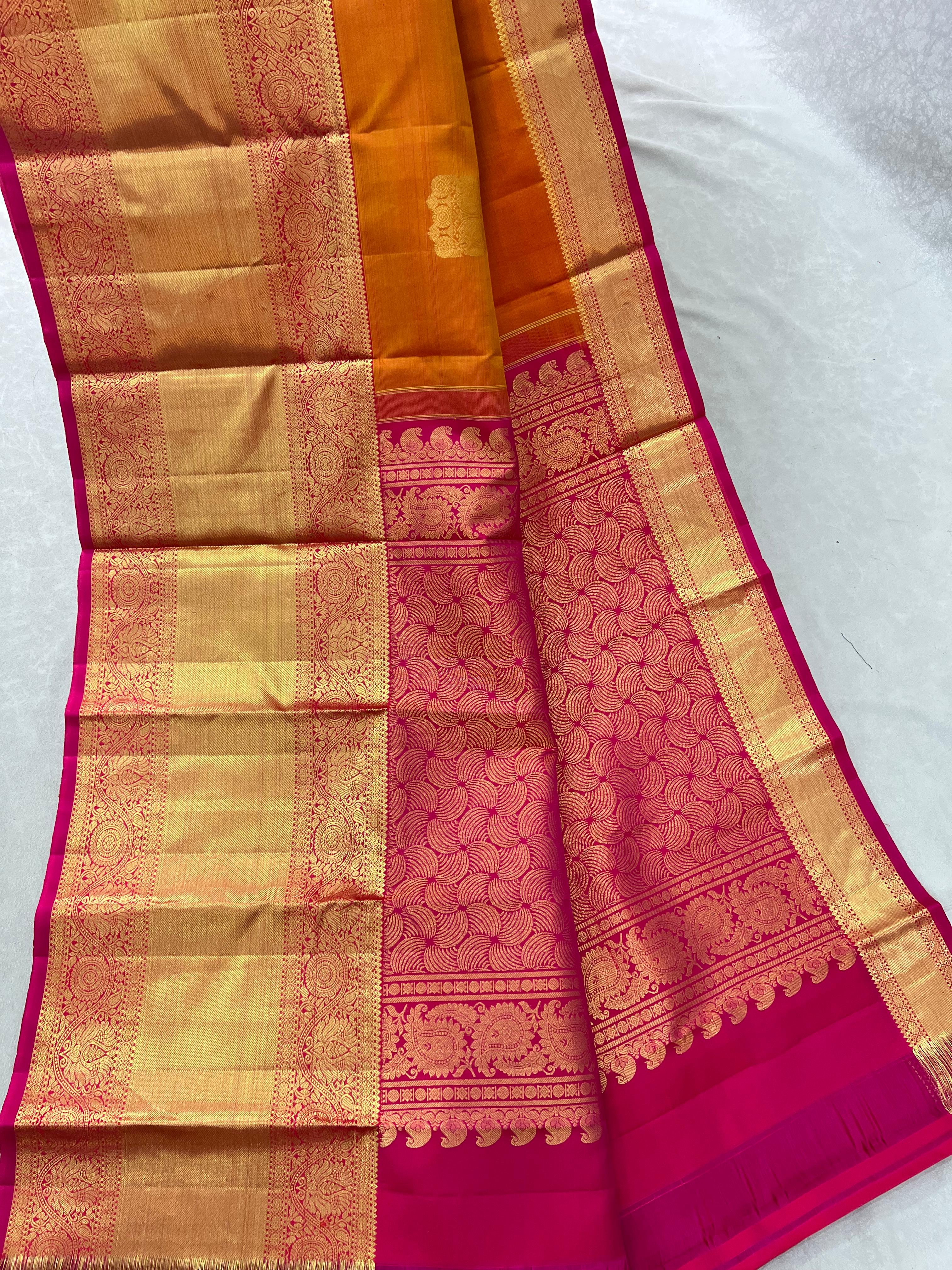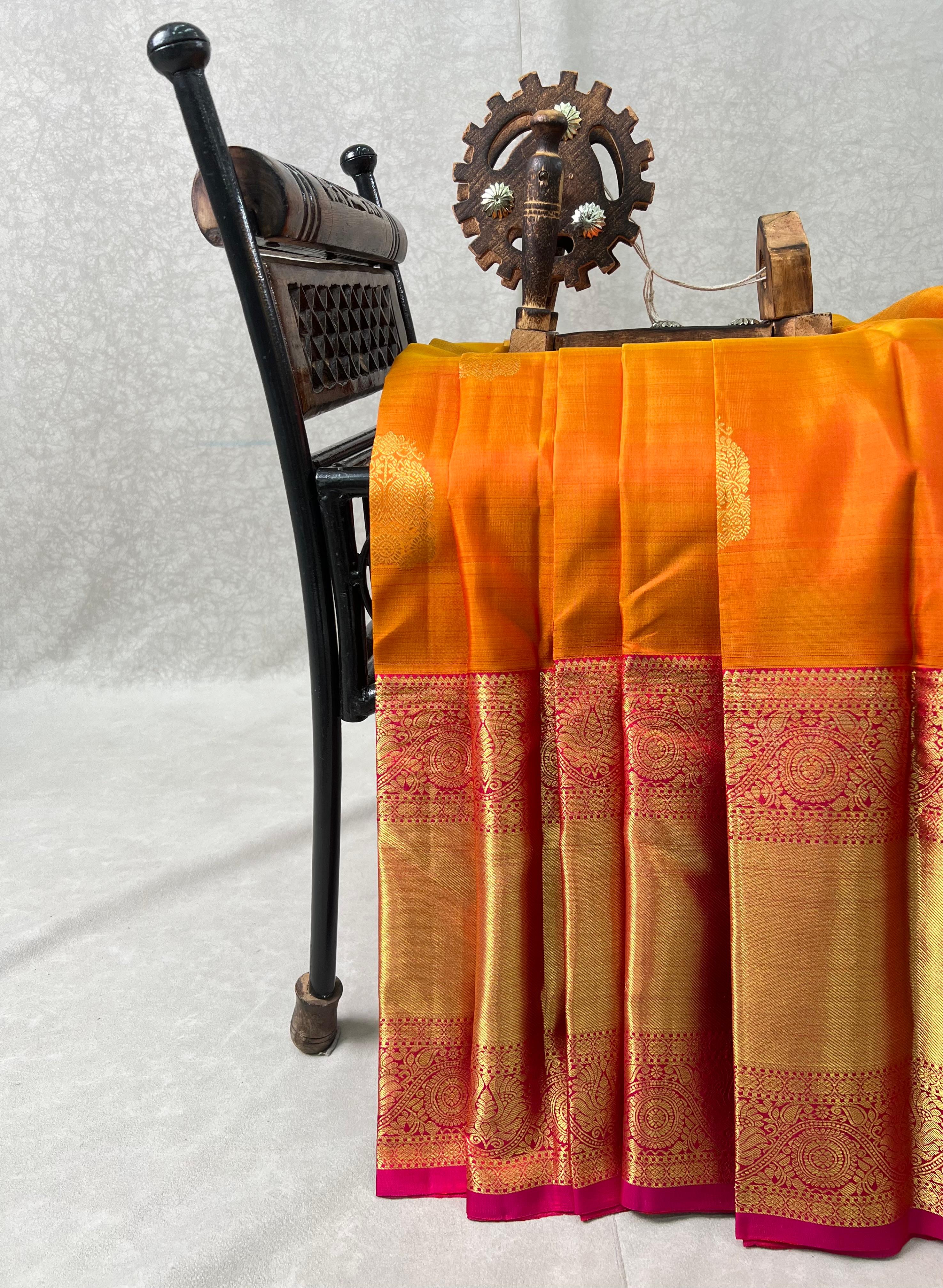Graceful and vibrant, this Kanchipuram pure silk handloom saree features a striking combination of dualshade yelow-pinkwith a contrasting pink border. The intricate gold zari motifs and traditional patterns add timeless elegance, making it perfect for festive occasions and celebrations. Comes with contrast blouse and Silk Mark Certified.
