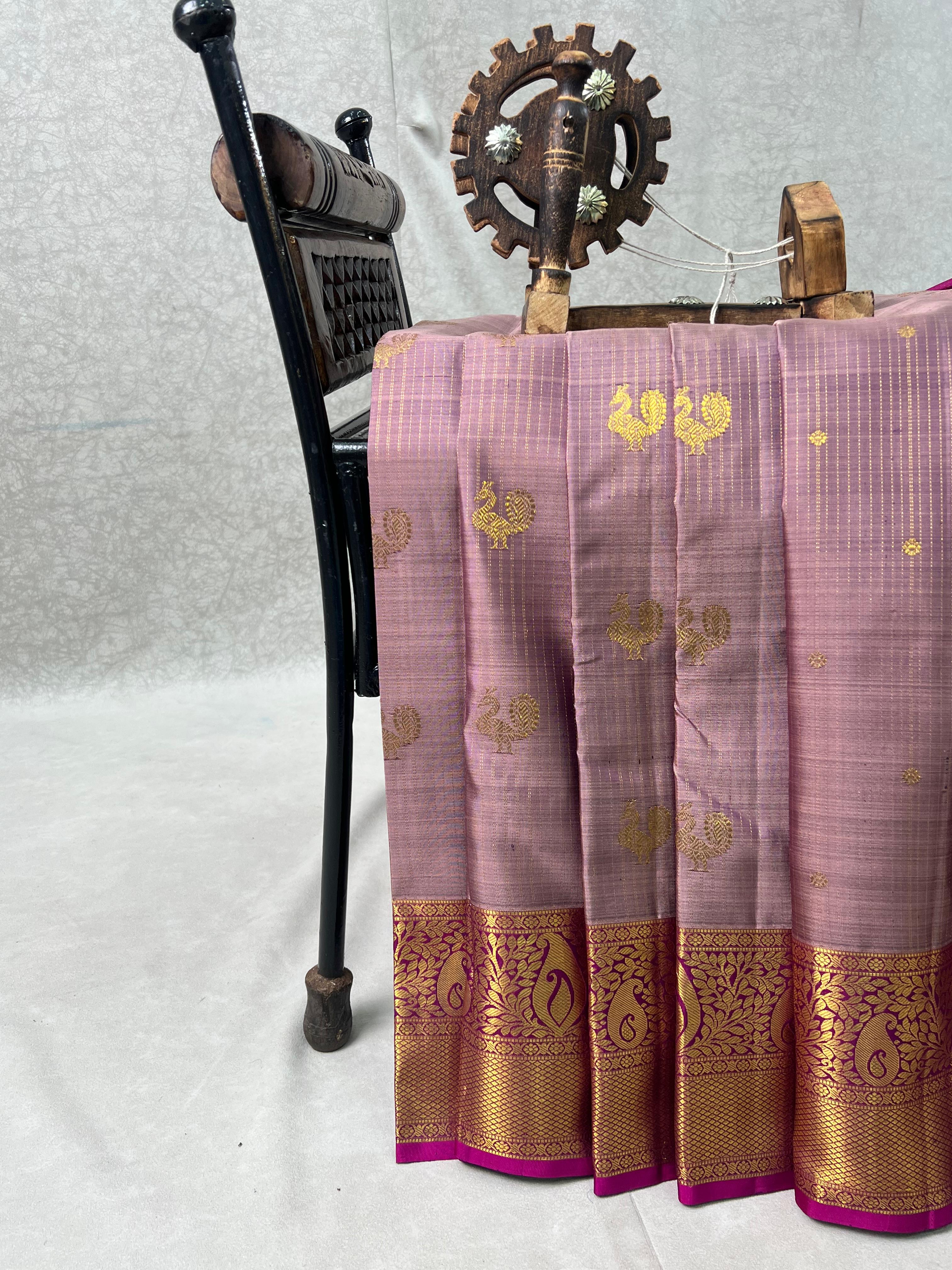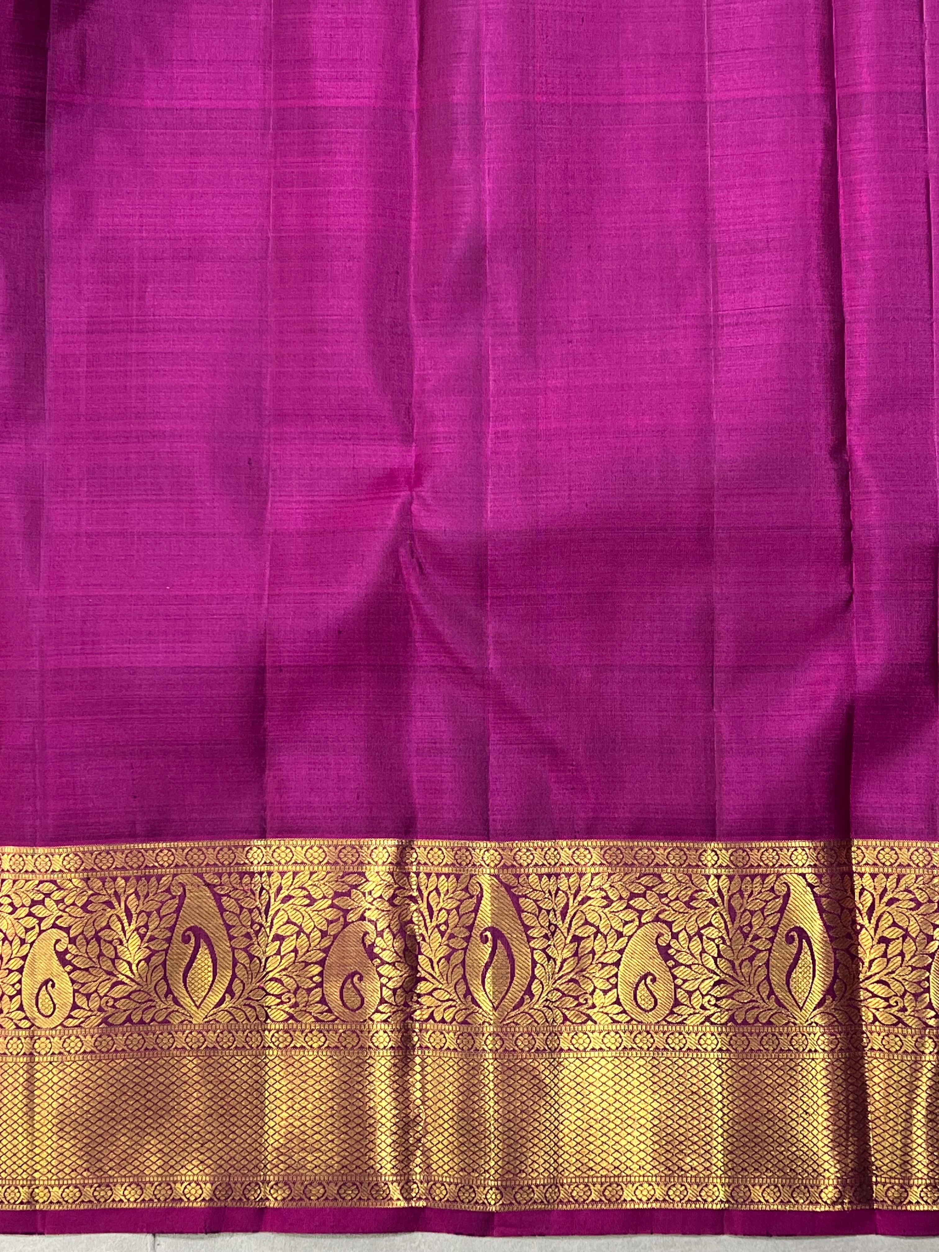 This elegant Kanchipuram Pure Silk Saree features a radiant onion pink body with delicate golden zari buttas and stripes, paired with a striking contrast magenta border enriched with intricate golden zari motifs. The rich traditional weaving and lustrous silk texture make it a perfect choice for weddings and festive occasions. Comes with contrast blouse and Silk Mark Certified.