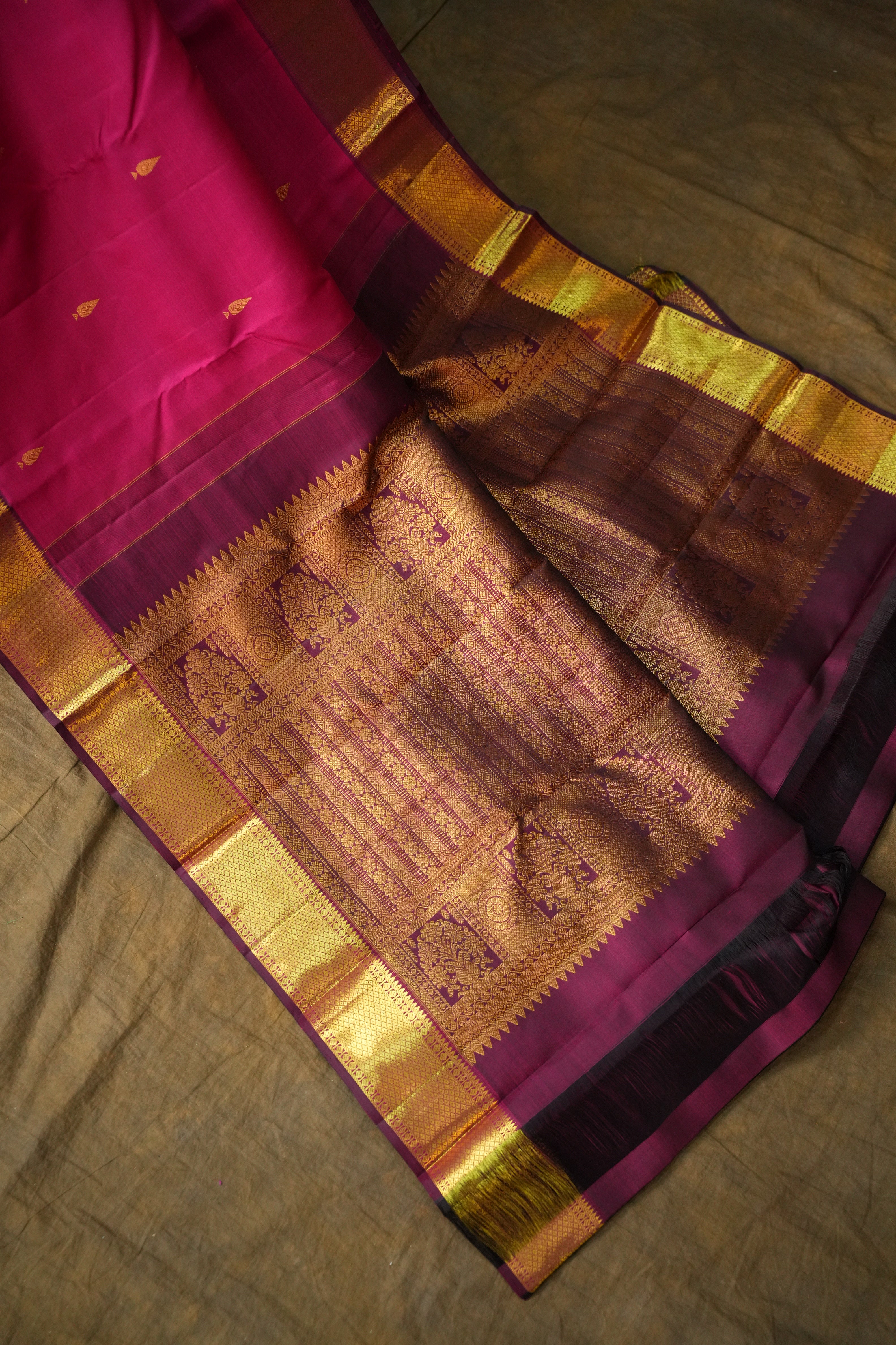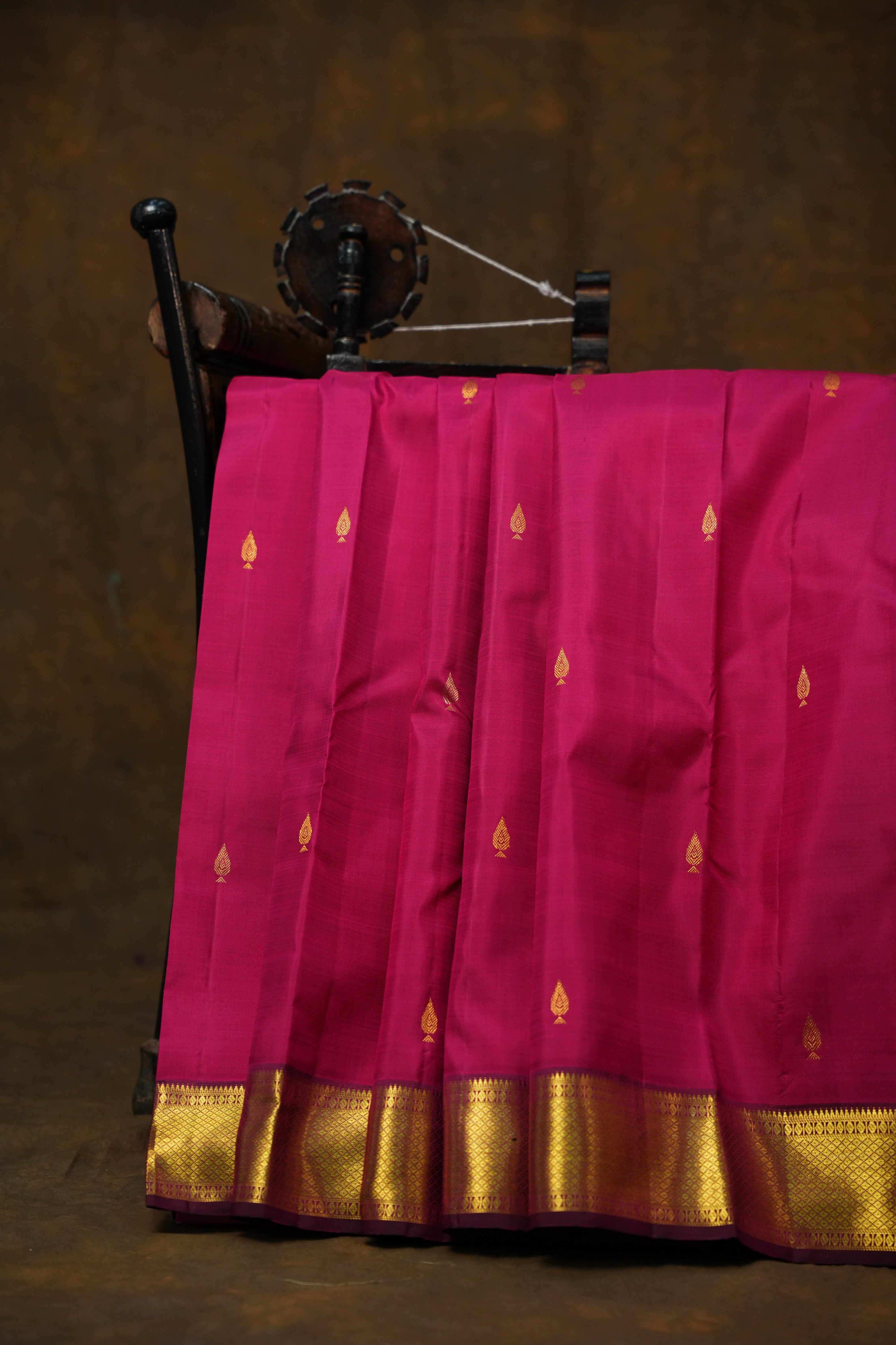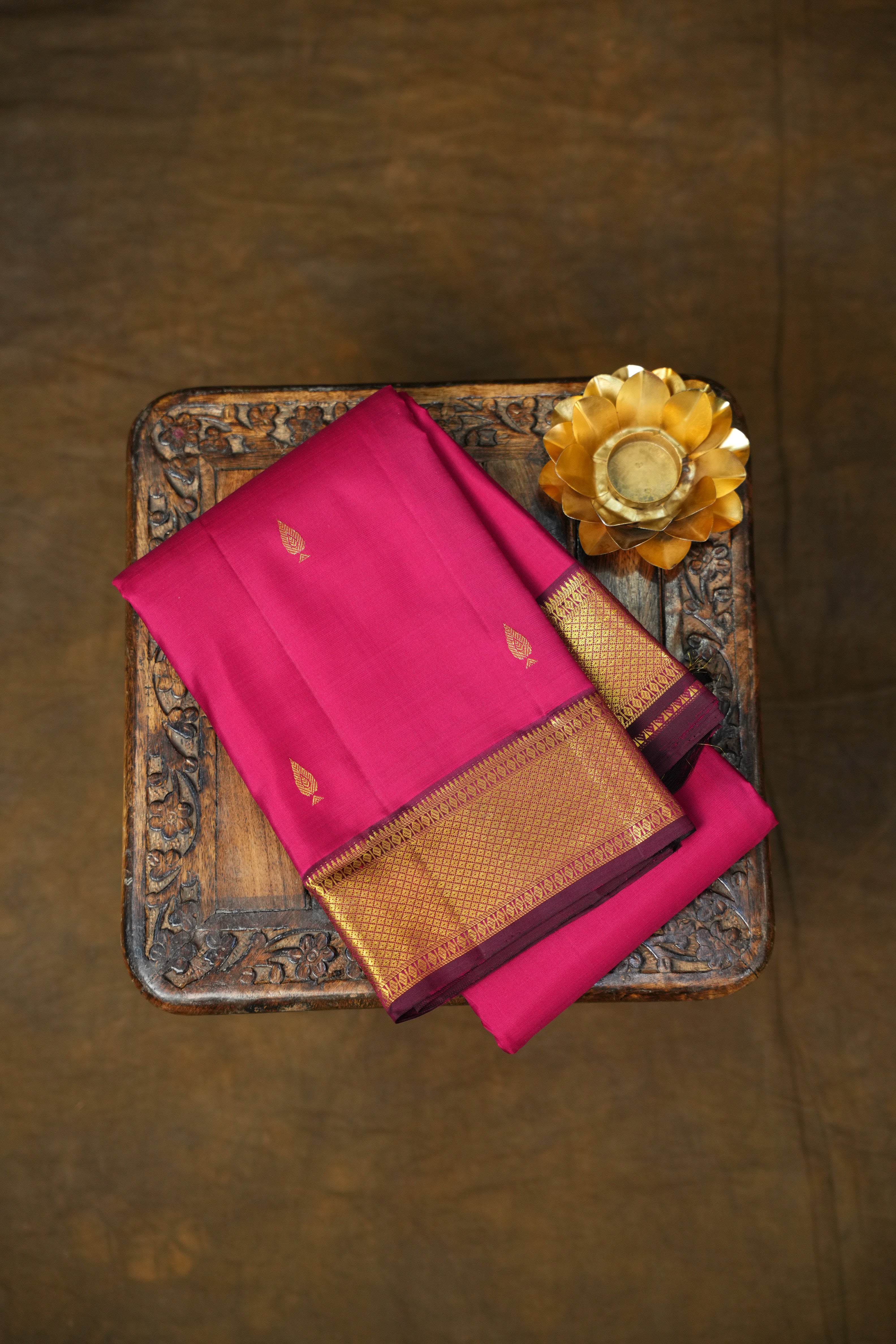 This luxurious Kanchipuram Pure Silk Small border handloom Saree features a Deep Pink body adorned with exquisite Gold zari motifs, giving it a graceful and artistic charm. The highlight of this masterpiece is its opulent Maroon border with gold zari detailing, The harmonious blend of floral artistry and classic zari craftsmanship reflects the timeless beauty and cultural richness of authentic handloom weaving, making it an ideal choice for weddings, festive occasions, and grand celebrations. This saree comes with a Contrast blouse and it is Silk Mark Certified.