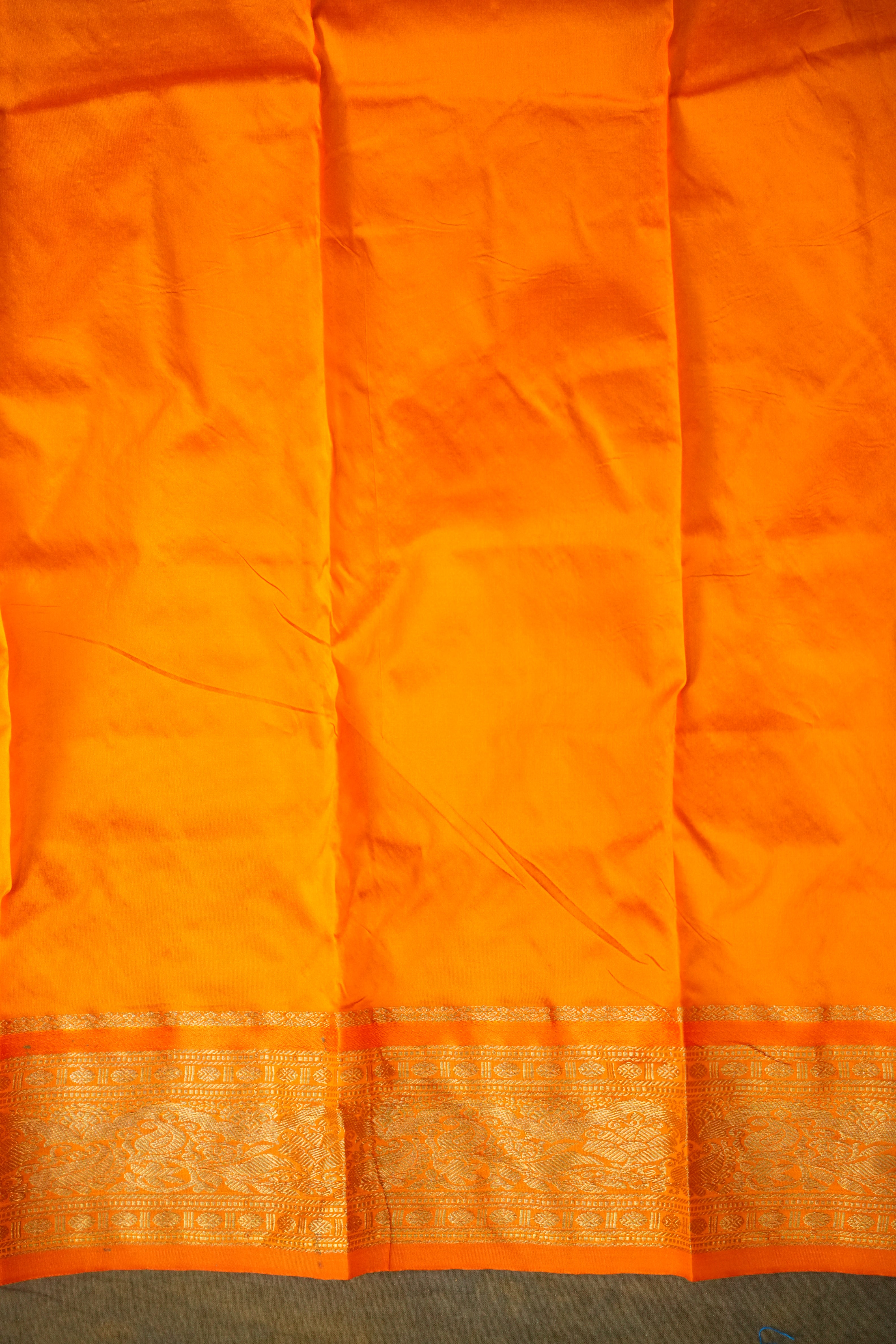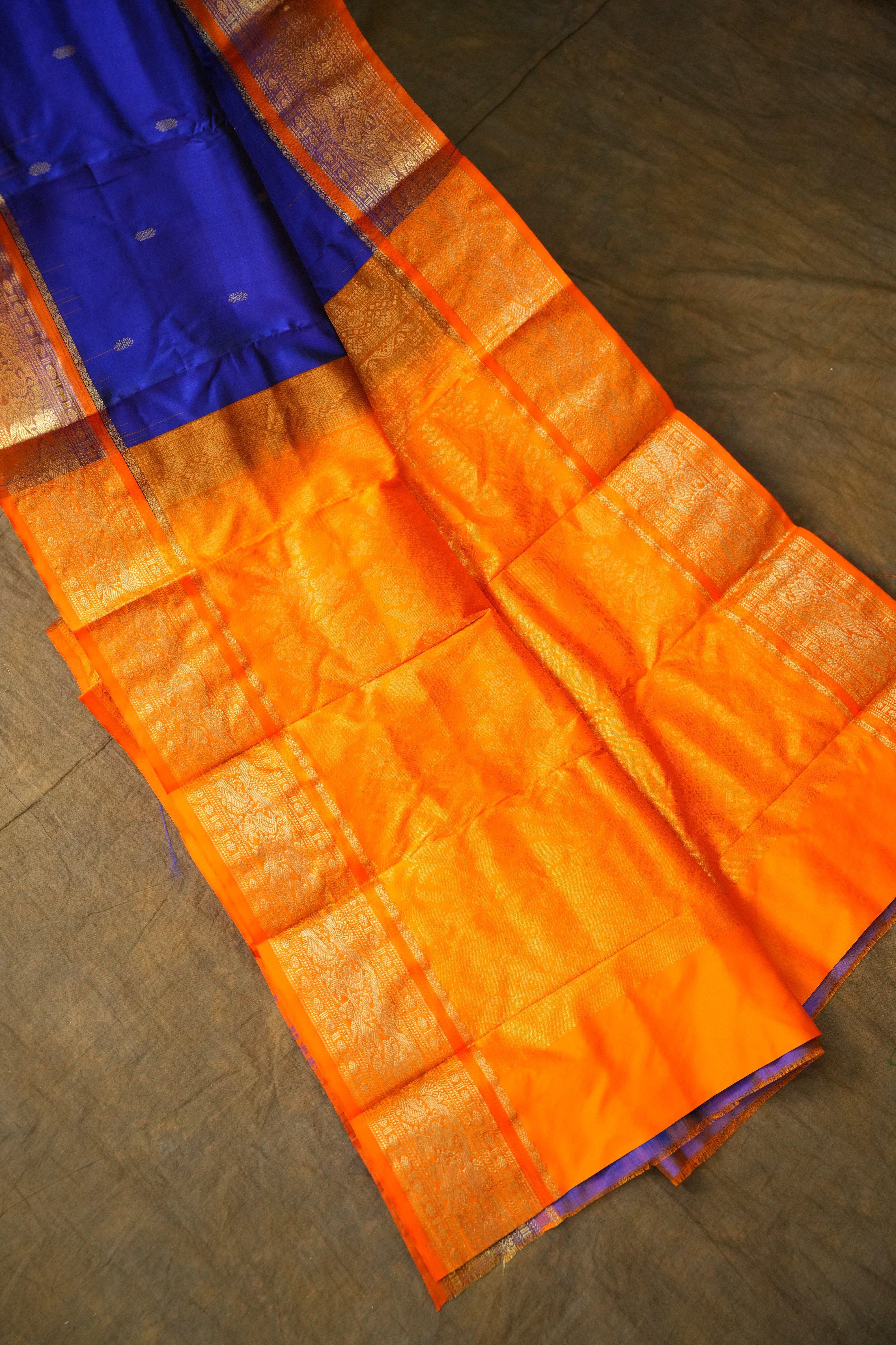 This luxurious Kanchipuram Pure Silk Small border Saree features a Navy Blue body adorned with exquisite Gold zari motifs, giving it a graceful and artistic charm. The highlight of this masterpiece is its opulent Mustard Yellow border with gold zari detailing, The harmonious blend of floral artistry and classic zari craftsmanship reflects the timeless beauty and cultural richness of authentic handloom weaving, making it an ideal choice for weddings, festive occasions, and grand celebrations. This saree comes with a Contrast blouse and it is Silk Mark Certified.