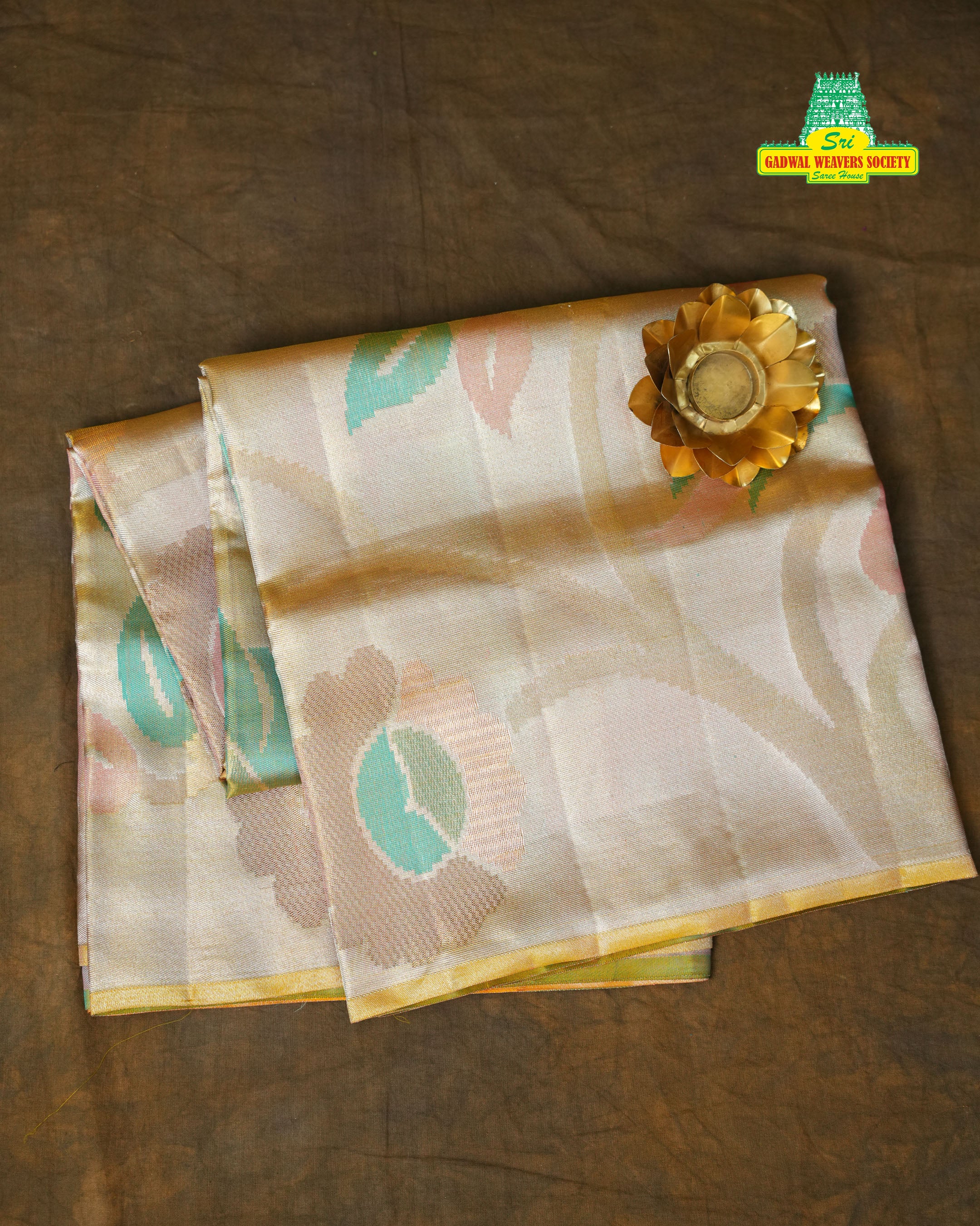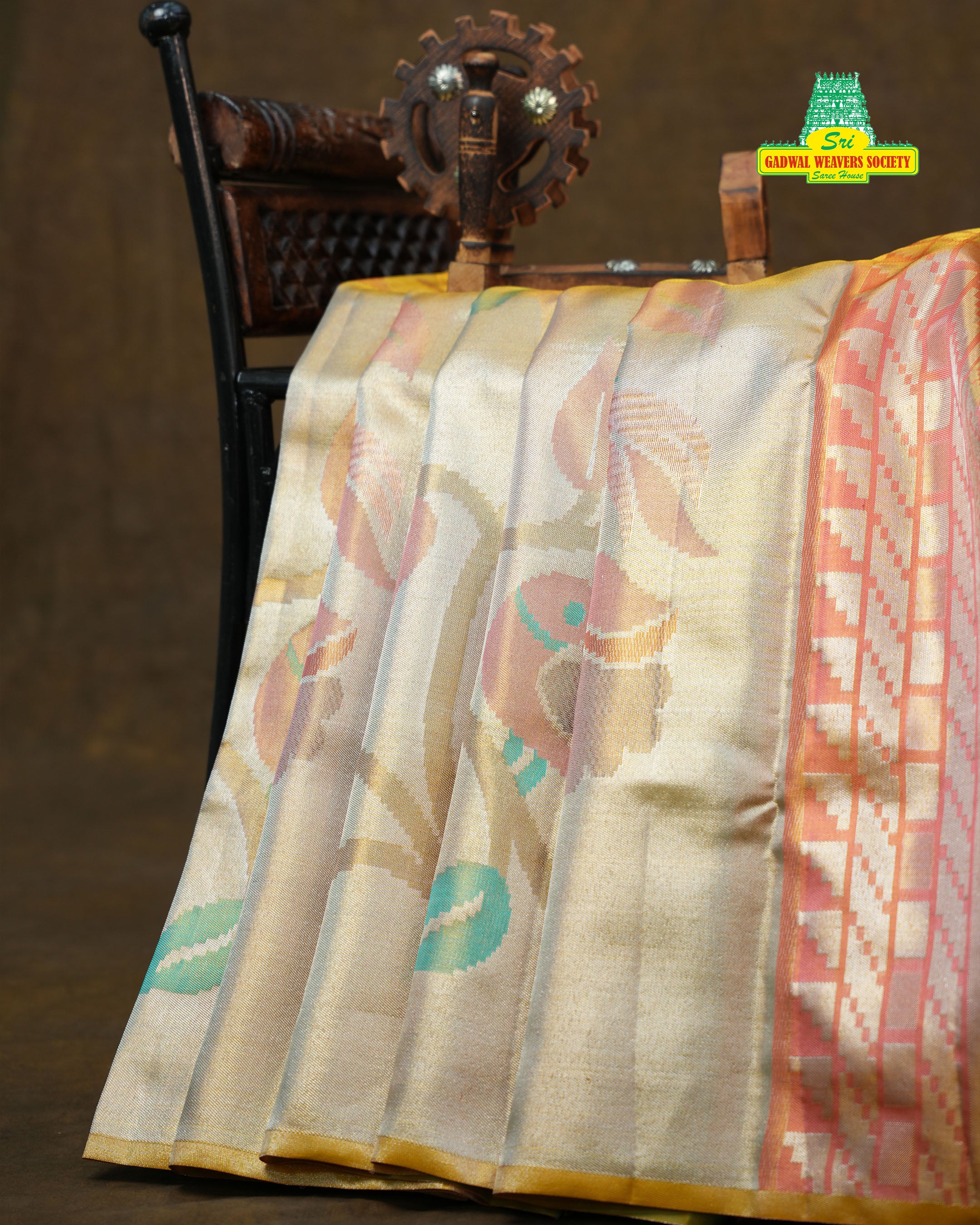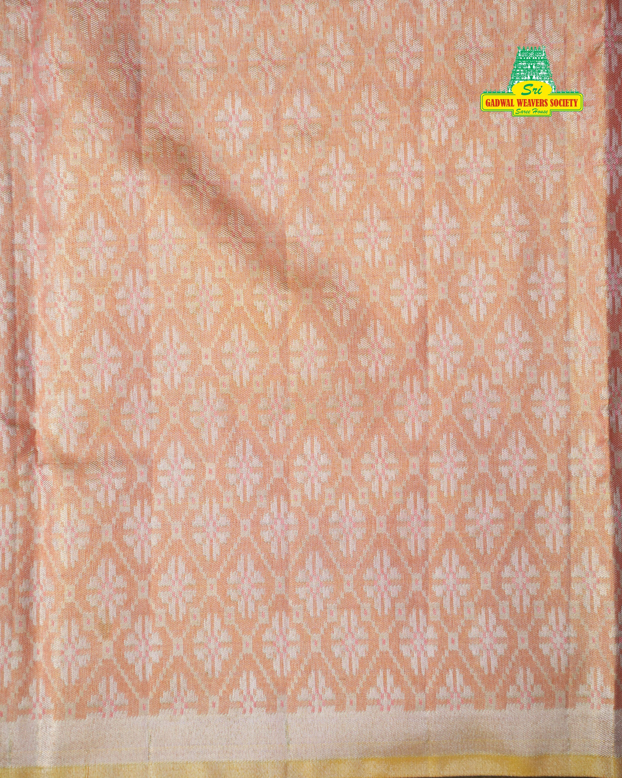 This exquisite Kanchi Tissue Meena Butta Saree features a luxurious champagne gold tissue body that shines with a rich, luminous glow. The body is adorned with beautiful pastel Meena floral motifs in shades of peach, rose pink, mint green, and soft beige, adding a subtle yet regal charm. The saree is complemented by a stunning contrast border in peach-gold with intricate geometric and zari detailing, enhancing its traditional elegance. Finished with a matching contrast blouse, ensuring authenticity, superior craftsmanship, and premium handloom quality. Perfect for weddings, festive occasions, and grand celebrations, this saree beautifully blends tradition with a timeless tissue sheen. this masterpiece is Silk Mark Certified.