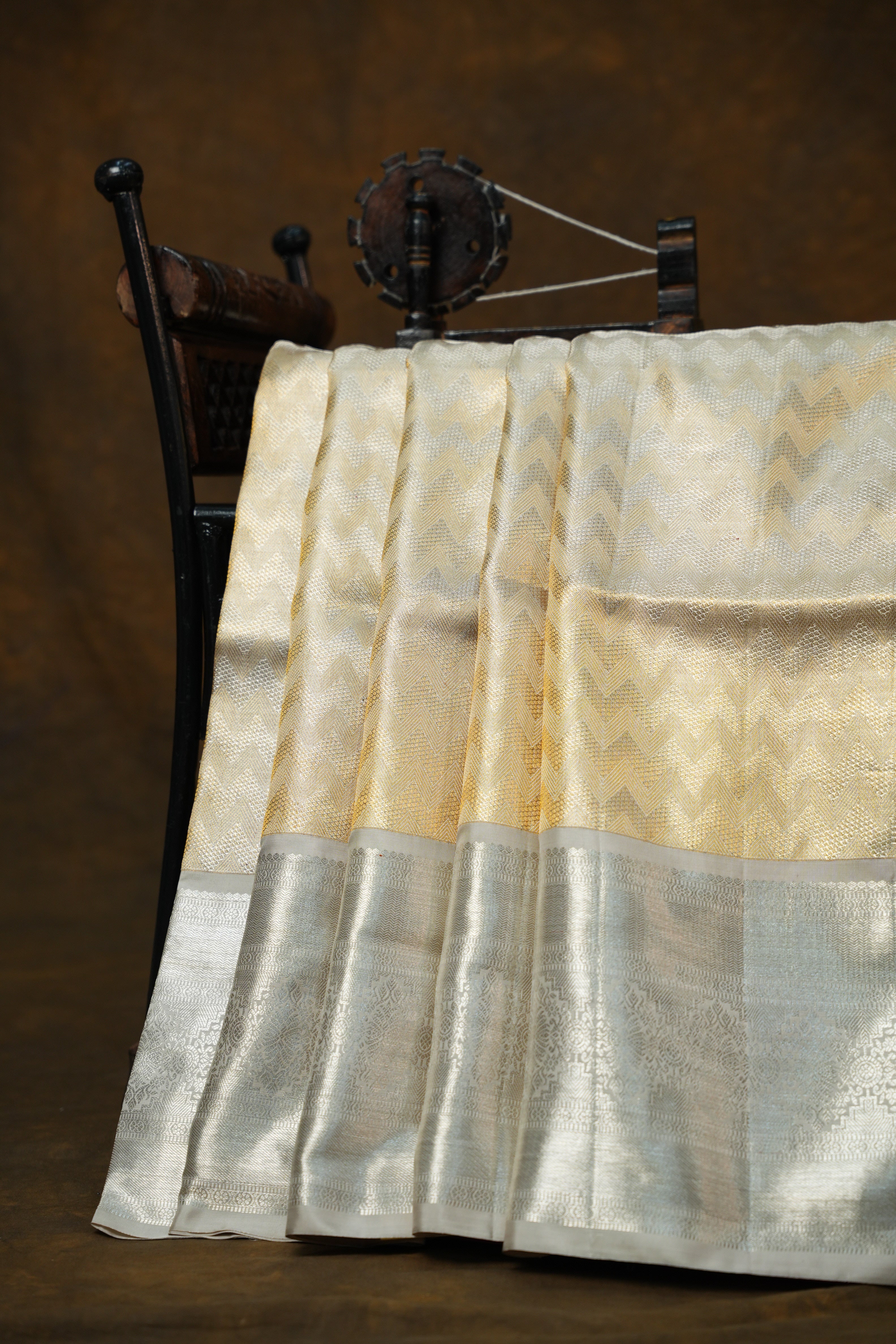 This exquisite Kanchipuram pure silk tissue handloom Saree features a luxurious champagne gold and silver tissue body that shines with a rich, luminous glow. The body is adorned with beautiful soft beige, adding a subtle yet regal charm. The saree is complemented by a stunning contrast soft Gray border intricate geometric and zari detailing, enhancing its traditional elegance. Finished with a matching contrast blouse. Perfect for weddings, festive occasions, and grand celebrations, this saree beautifully blends tradition with a timeless tissue sheen. this masterpiece is Silk Mark Certified.