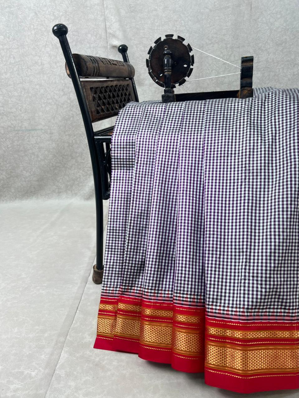 This Narayanapet Pure Silk Handloom Saree showcases a timeless blend of tradition and elegance, featuring a classic Purple and White gingham checks body that reflects the heritage charm of authentic Narayanapet weaving. Enhancing its appeal is a rich Red contrast border, intricately adorned with antique gold zari geometric motifs and subtle green zari highlights, highlights the skilled craftsmanship of handloom artisans. This saree comes with Contrast blouse and is silk mark certified.