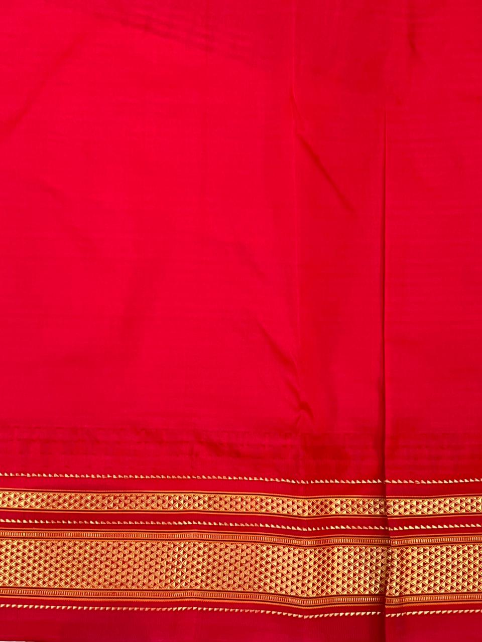 This Narayanapet Pure Silk Handloom Saree showcases a timeless blend of tradition and elegance, featuring a classic Olive green and White gingham checks body that reflects the heritage charm of authentic Narayanapet weaving. Enhancing its appeal is a rich Red contrast border, intricately adorned with antique gold zari geometric motifs and subtle green zari highlights, highlights the skilled craftsmanship of handloom artisans. This saree comes with Contrast blouse and is silk mark certified.