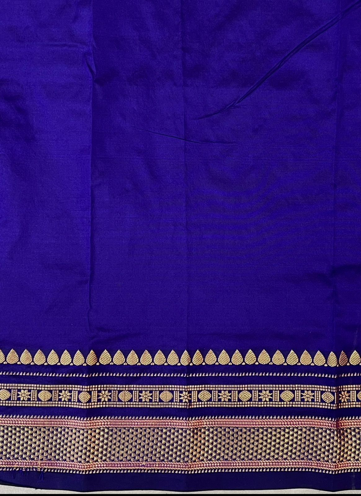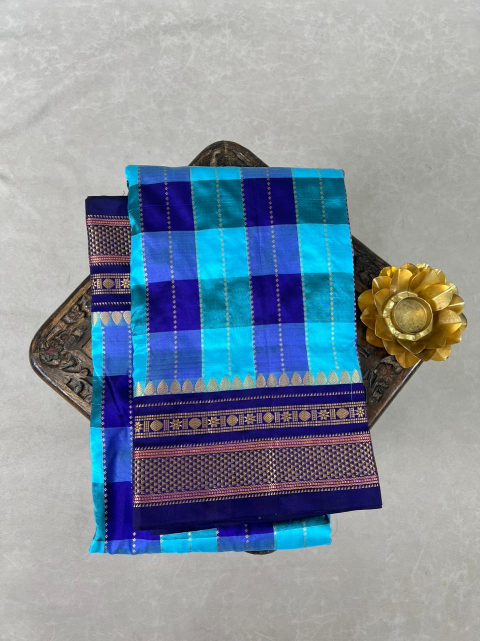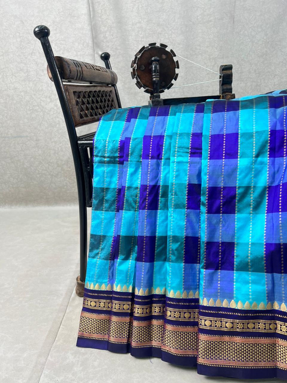 This Narayanapet Kattam Checks Handloom Saree features a striking body woven in bold kattam checks of Multicolor, creating a vibrant yet traditional appeal. The checks are subtly highlighted with small gold zari motif stripes across the body, adding a touch of elegance to the lively pattern. The saree is beautifully finished with a Dark navy blue border, intricately woven with fine gold zari geometric patterns and delicate leaf motifs, reflecting the finesse of Narayanapet craftsmanship. This saree comes with contrast blouse and is silk mark certified.