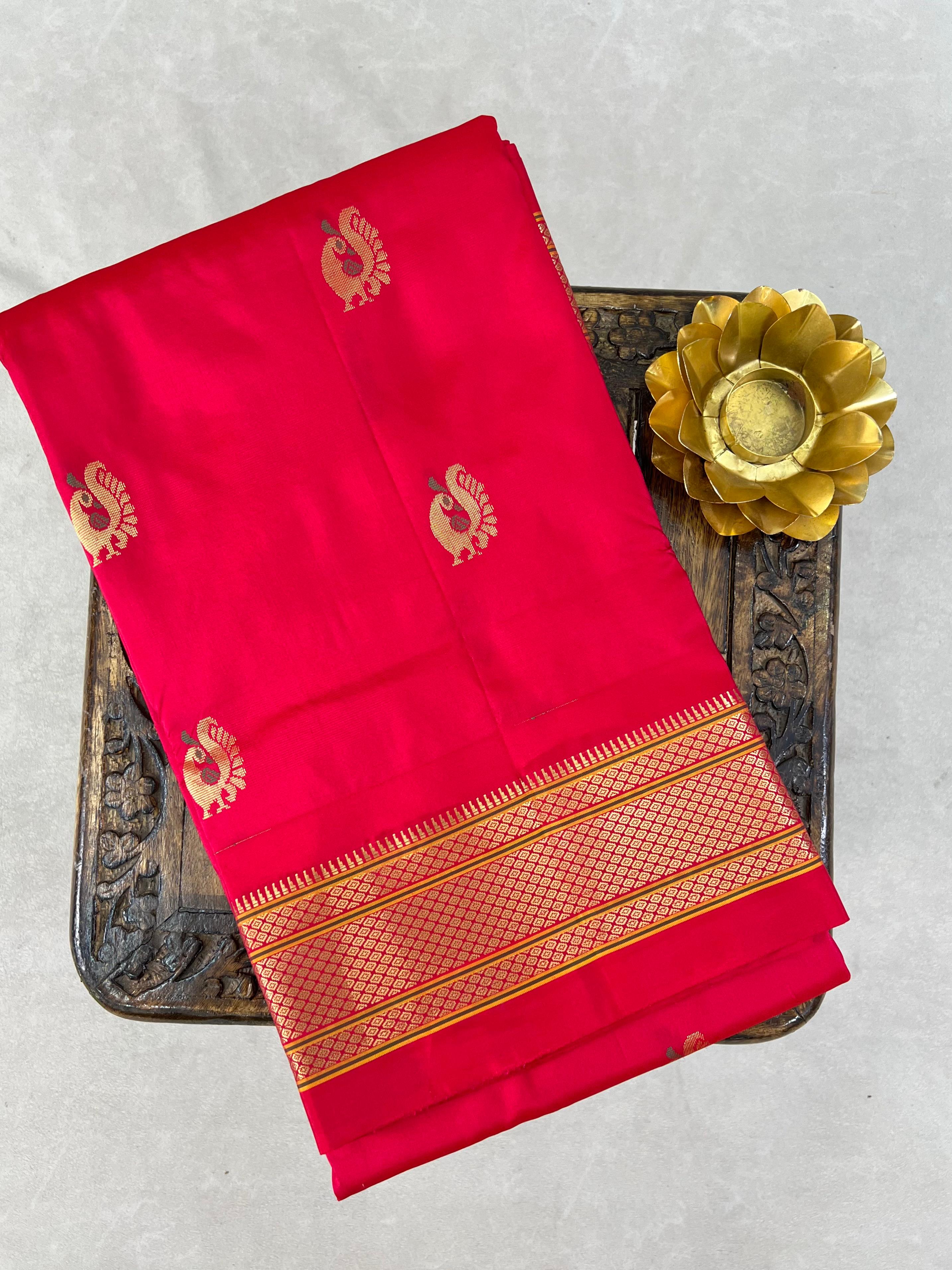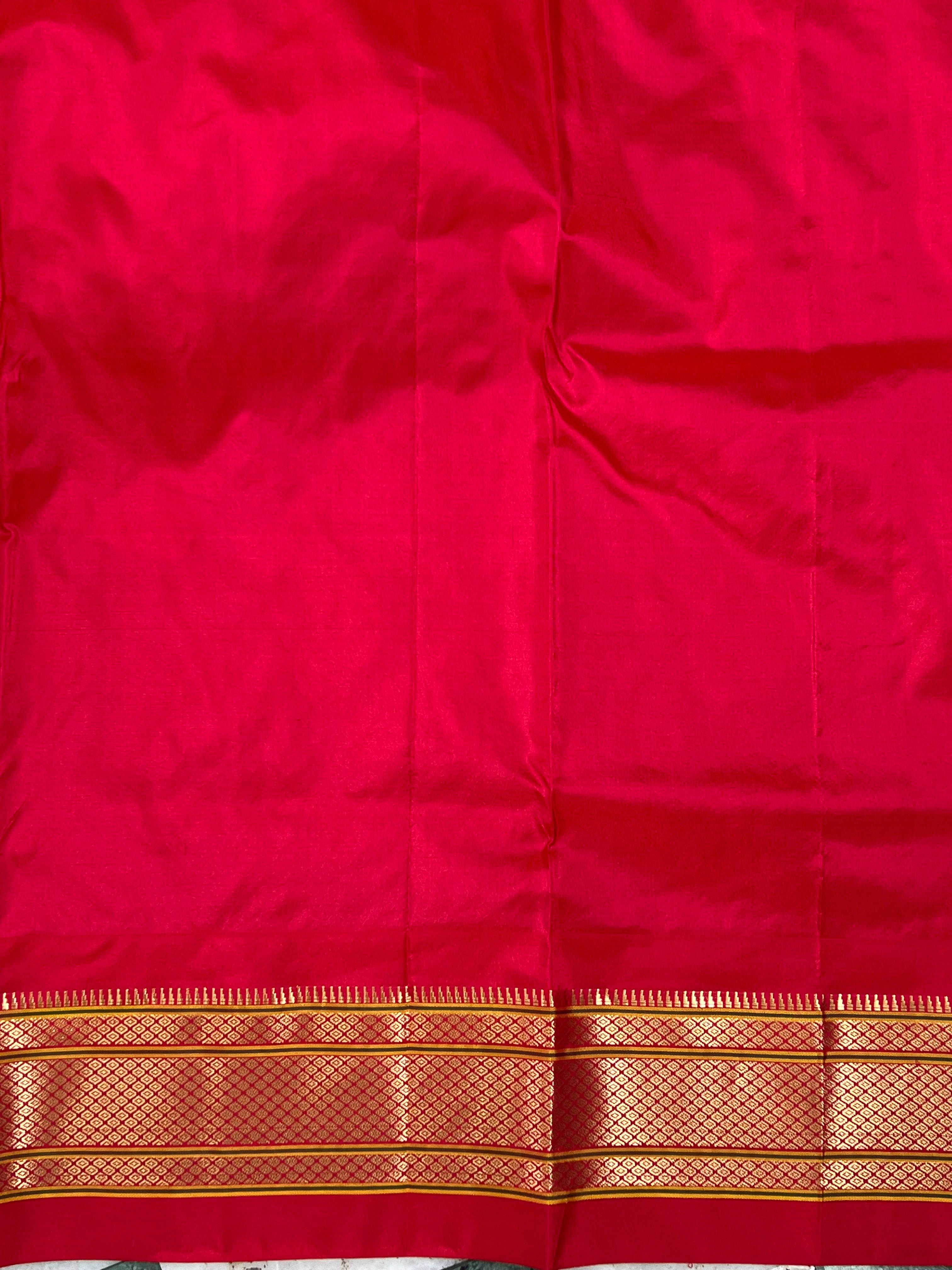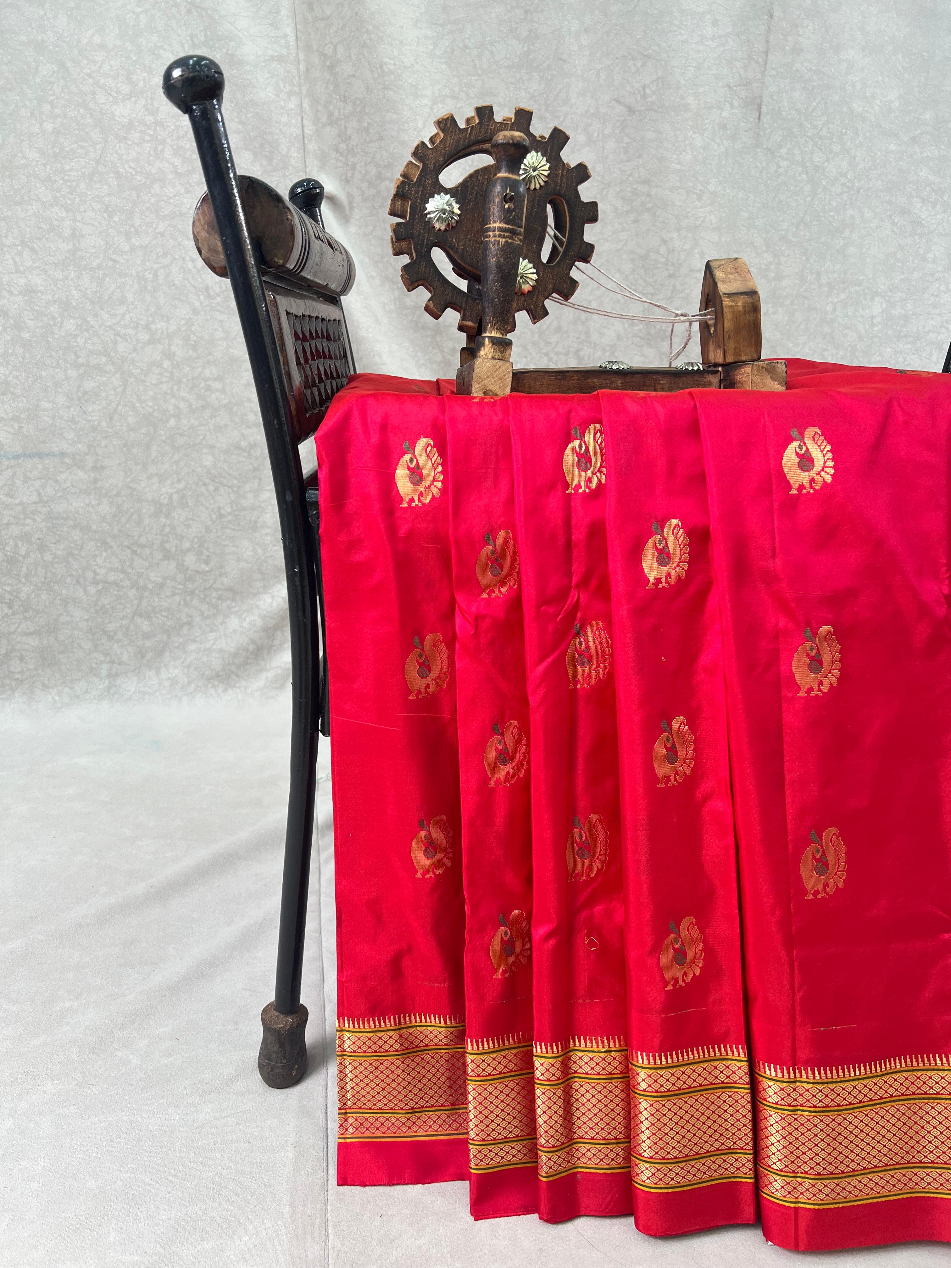 This stunning Narayanpet Pure Silk Paithani Pallu Saree features an elegant red body adorned with gold peacock meena motifs, creating a regal aesthetic. The highlight is its  self gold zari paithani border and pallu, beautifully woven with vibrant peacock motifs and floral vines—making it an ideal choice for festive and traditional occasions. comes with self blouse and Silk Mark Certified.