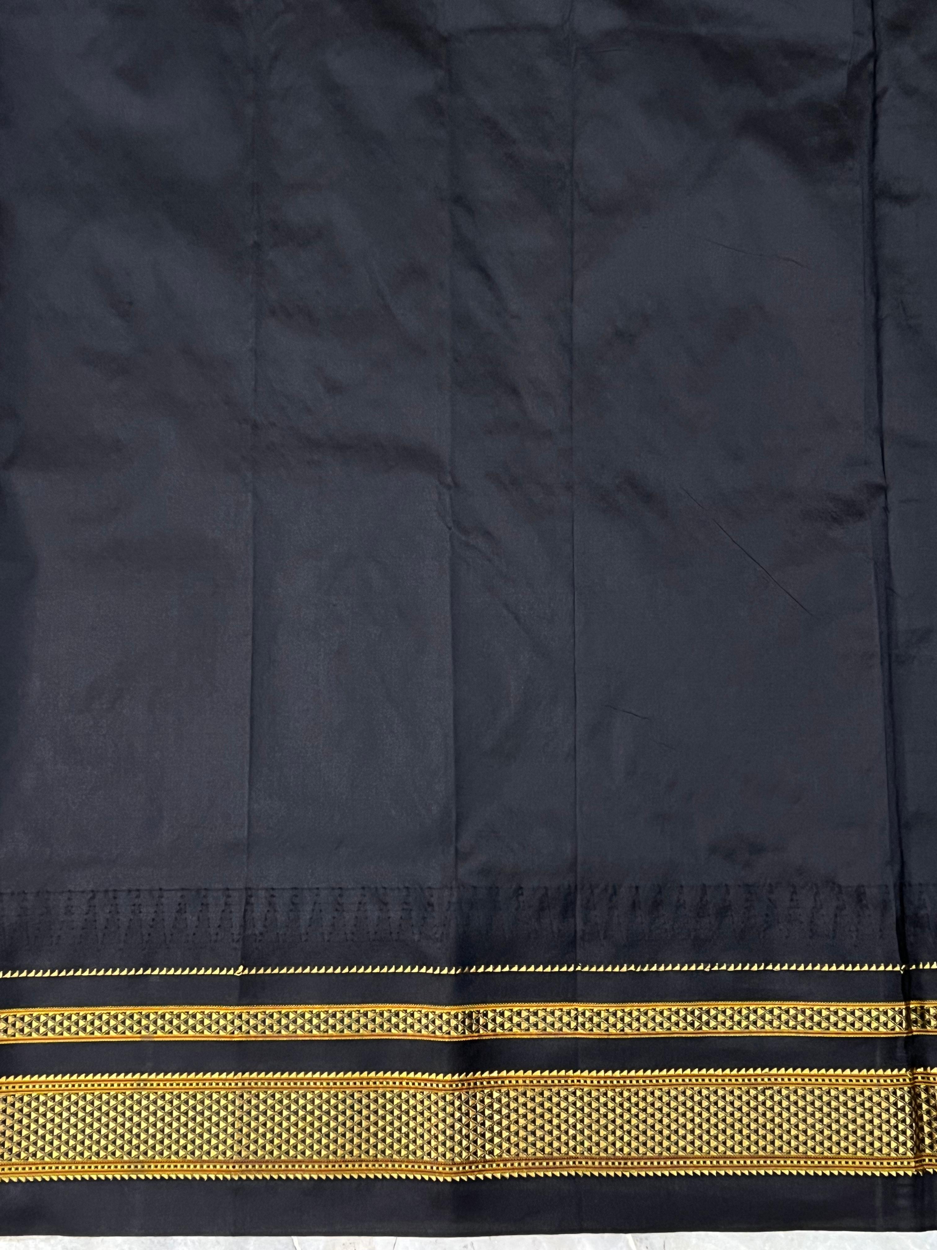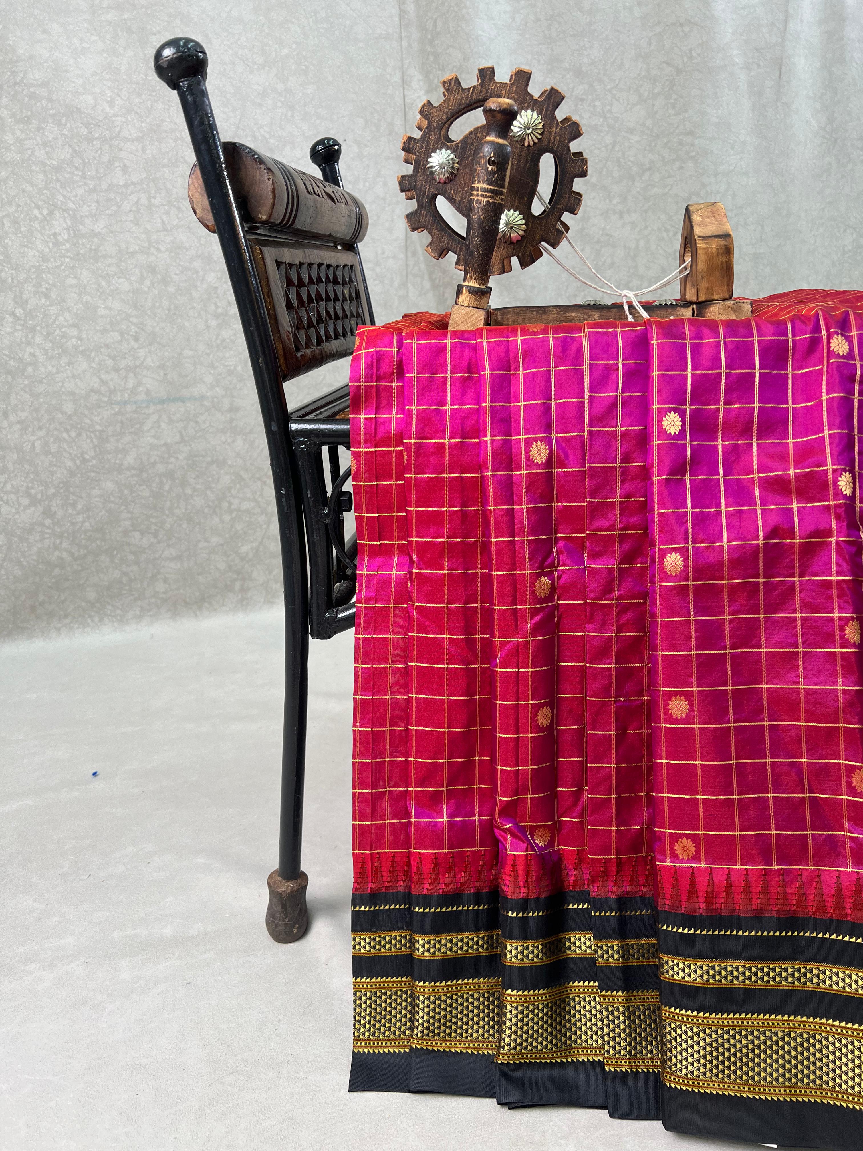 This elegant Narayanpet Pure Silk Saree showcases a timeless blend of tradition and sophistication. Crafted from rich magenta silk, the saree is adorned with subtle golden checks and buttas throughout the body, adding a touch of grace. The striking contrast black and gold zari border features intricate patterns and temple motifs, enhancing its regal appeal. Perfect for festive occasions, weddings, or cultural celebrations. Coming with contrast blouse and silk mark certified. It is a perfect blend of tradition and festive flair.
