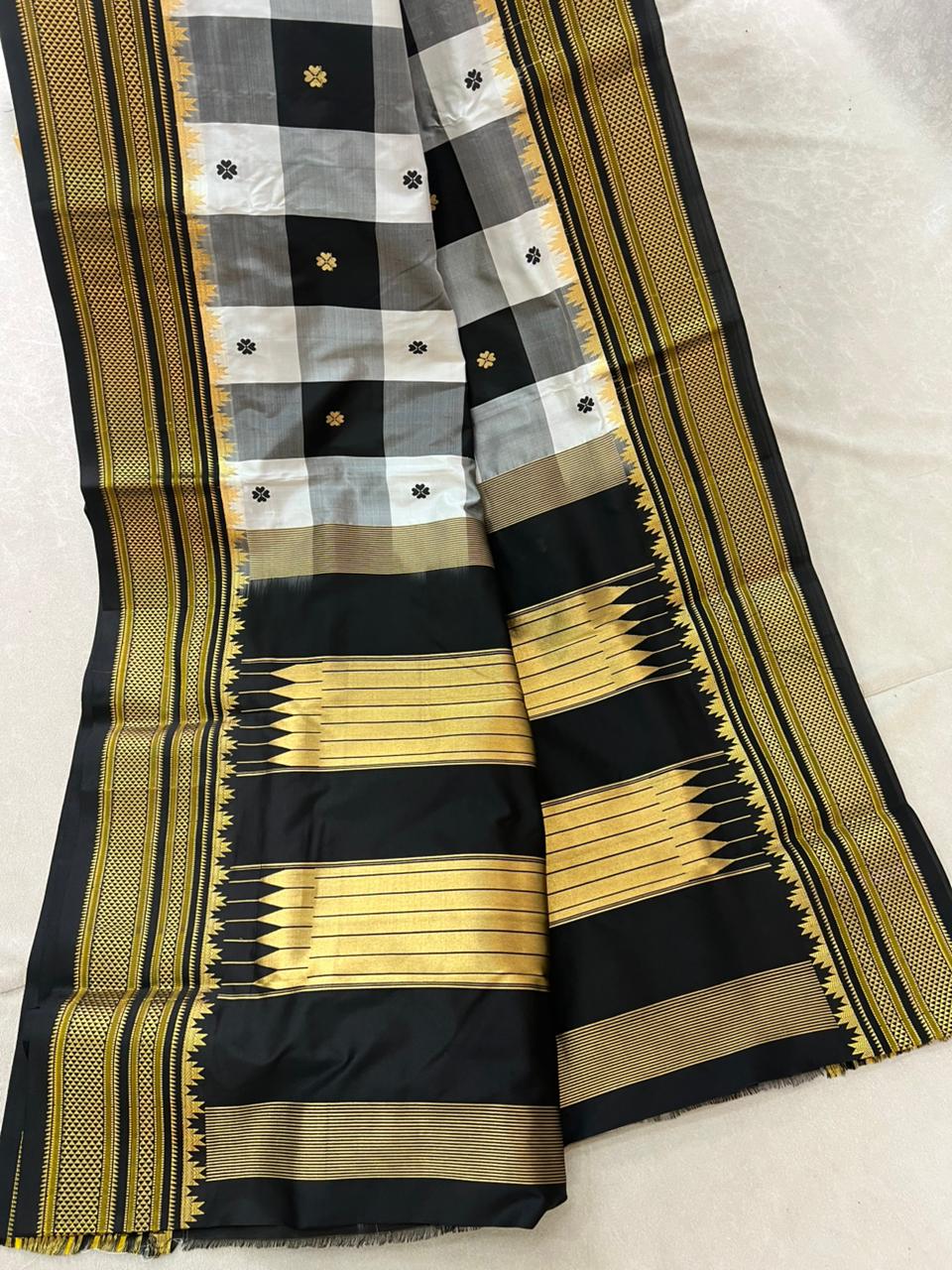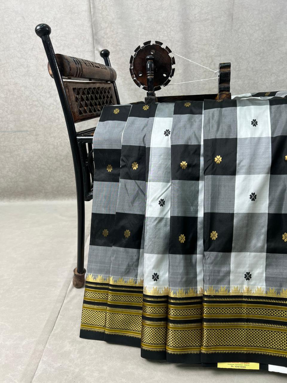 This Narayanapet Kattam Checks Handloom Saree features a striking body woven in bold kattam checks of Black, White, and Dark gray, creating a vibrant yet traditional appeal. The checks are subtly highlighted with small gold zari and thread flower motifs, adding a touch of elegance to the lively pattern. The saree is beautifully finished with a Black border, intricately woven with fine gold zari geometric patterns and delicate leaf motifs, reflecting the finesse of Narayanapet craftsmanship. This saree comes with contrast blouse and is silk mark certified.