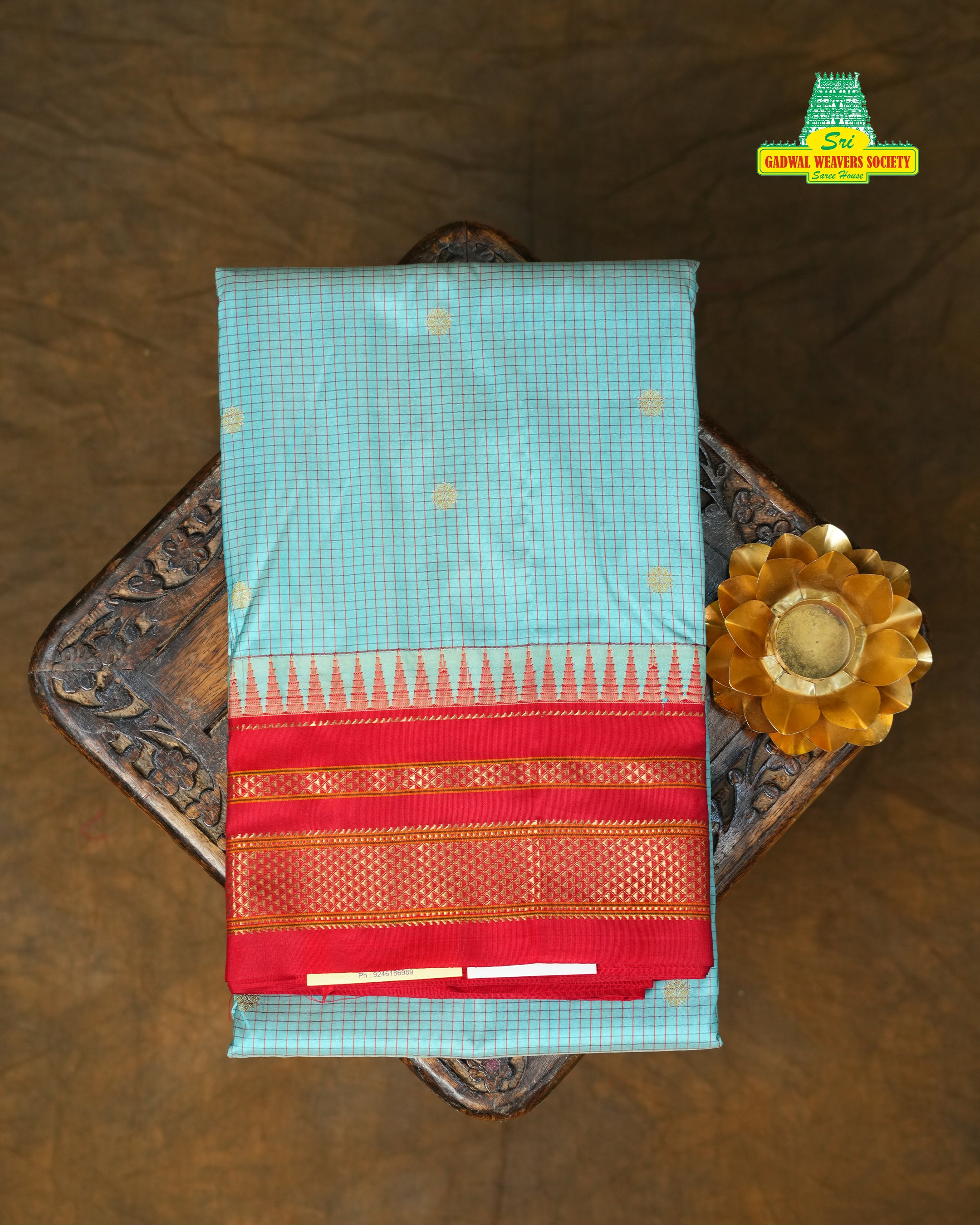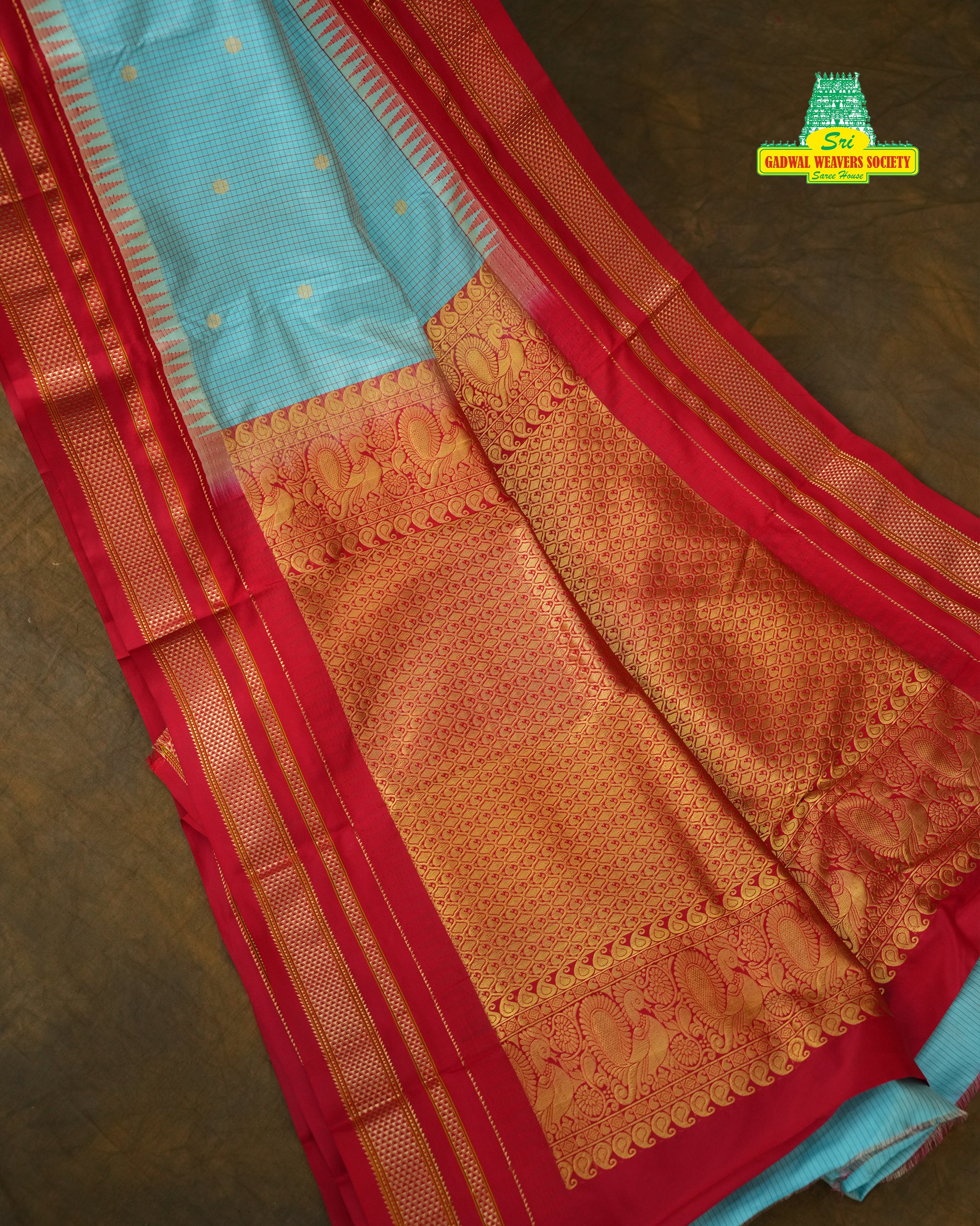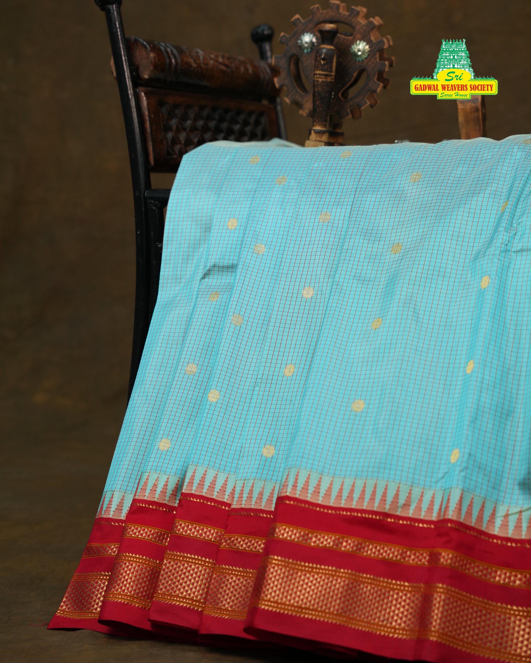 This graceful Narayanpet Pure Silk Handloom Saree features a refreshing Aqua blue body adorned with fine traditional checks and delicate gold zari buttas, reflecting the timeless charm of classic Narayanpet craftsmanship. The saree is beautifully complemented by a rich contrast red border, highlighted with intricate gold zari geometric patterns and traditional detailing that add a vibrant and regal touch. This saree comes with contrast Blouse and it is Silk mark certified.