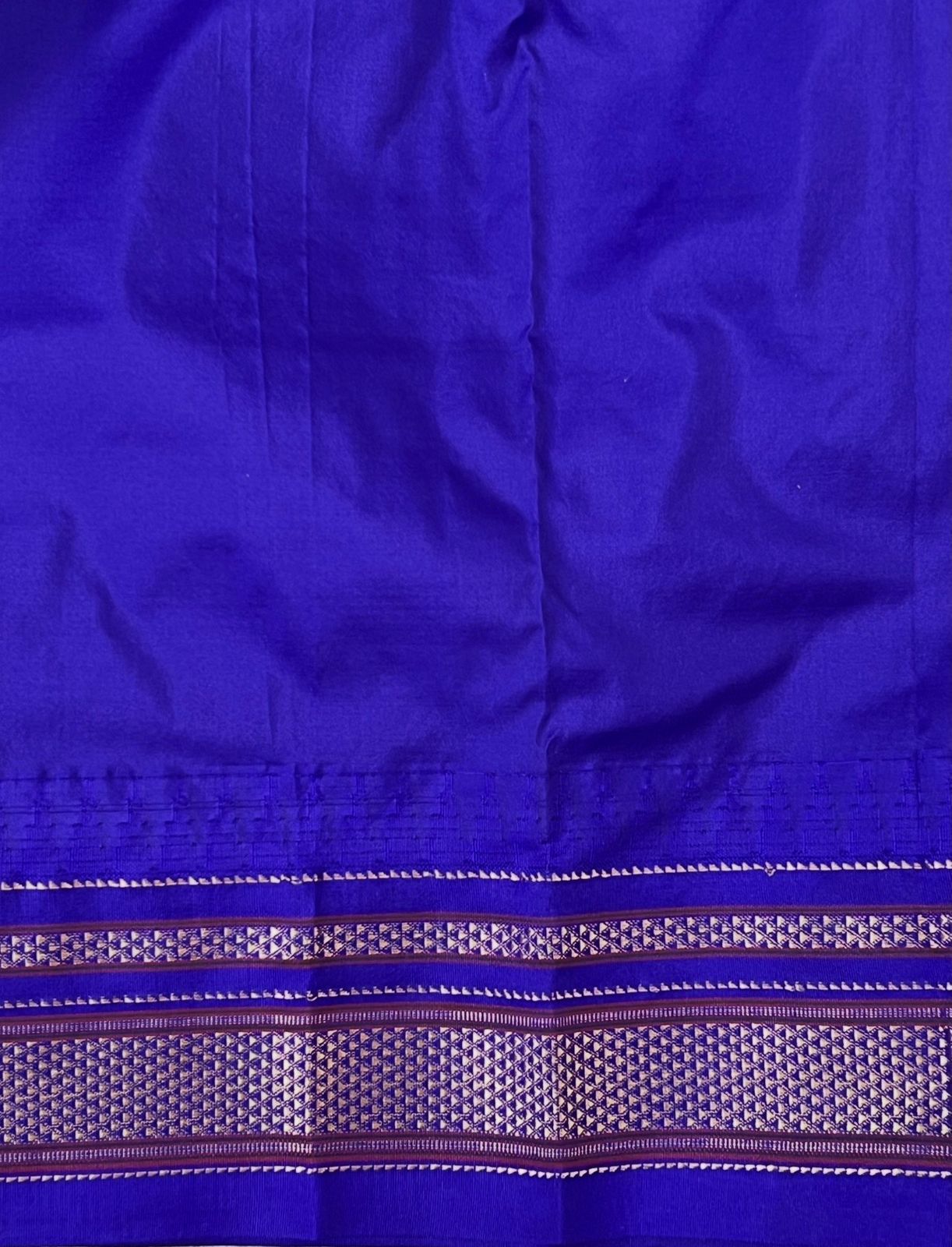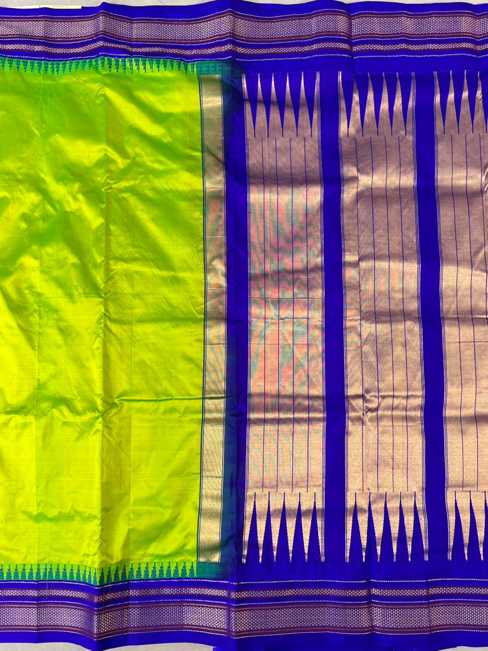 This elegant Narayanpet Pure Silk Handloom Saree features a Bright Green body, reflecting timeless handloom artistry. The saree is highlighted by a striking NavyBlue border, intricately crafted with traditional gold zari geometric and temple-inspired designs, adding a regal finish. Lightweight, lustrous, and graceful, this saree is perfect for festive occasions, weddings, poojas, and traditional celebrations, making it a classic addition to any silk saree collection, This saree comes with Contrast blouse and it is Silk mark certified.
